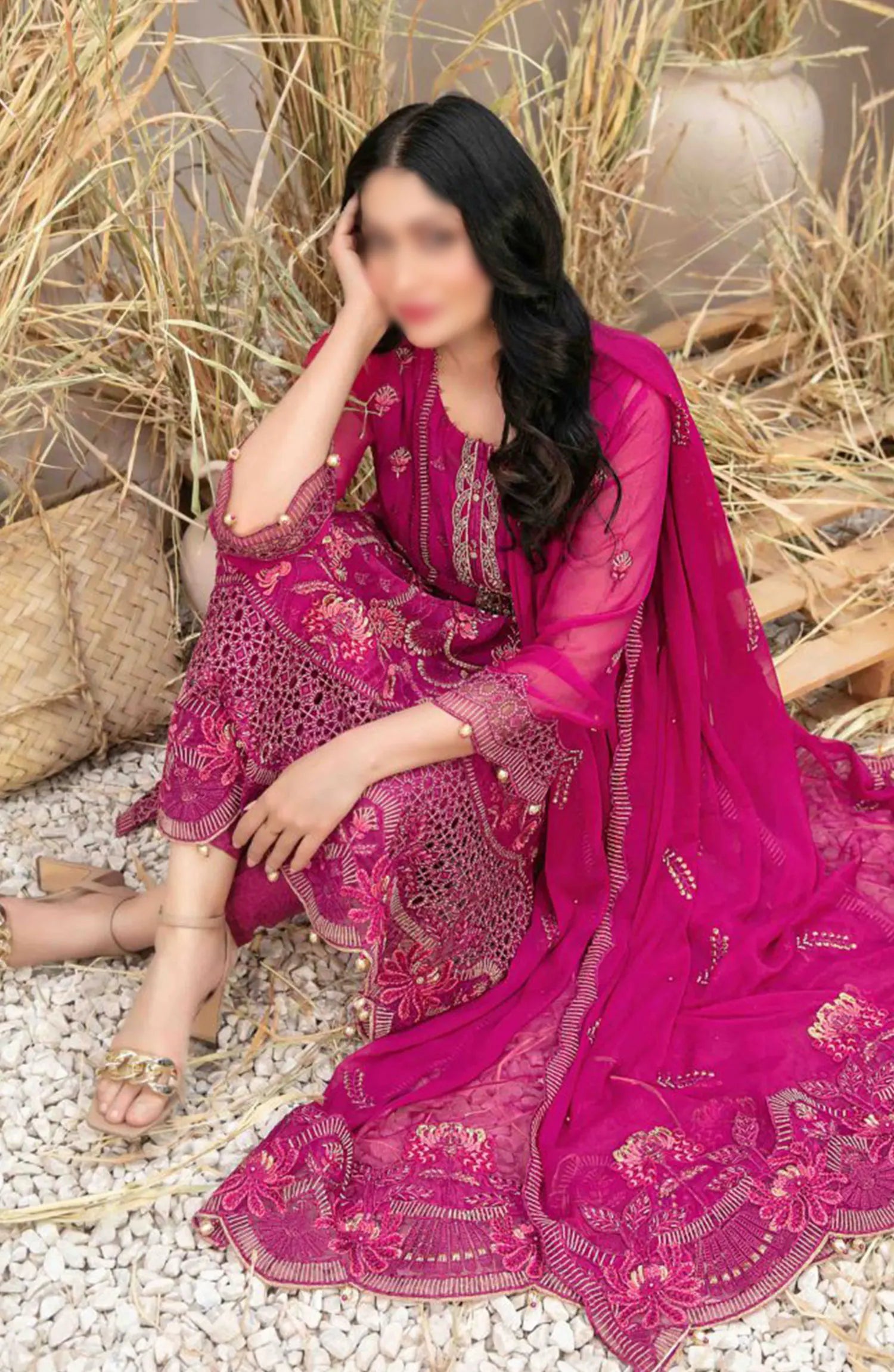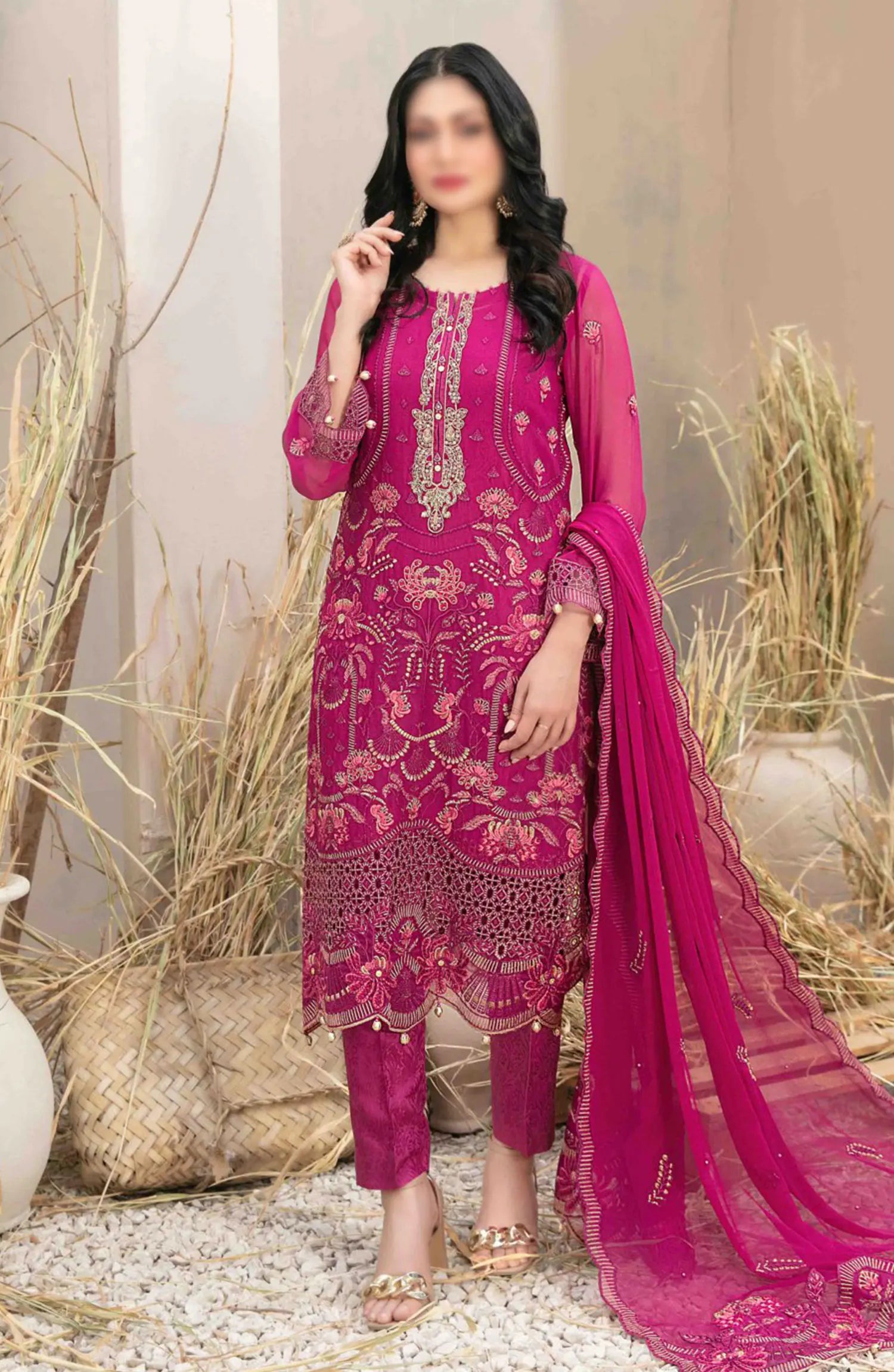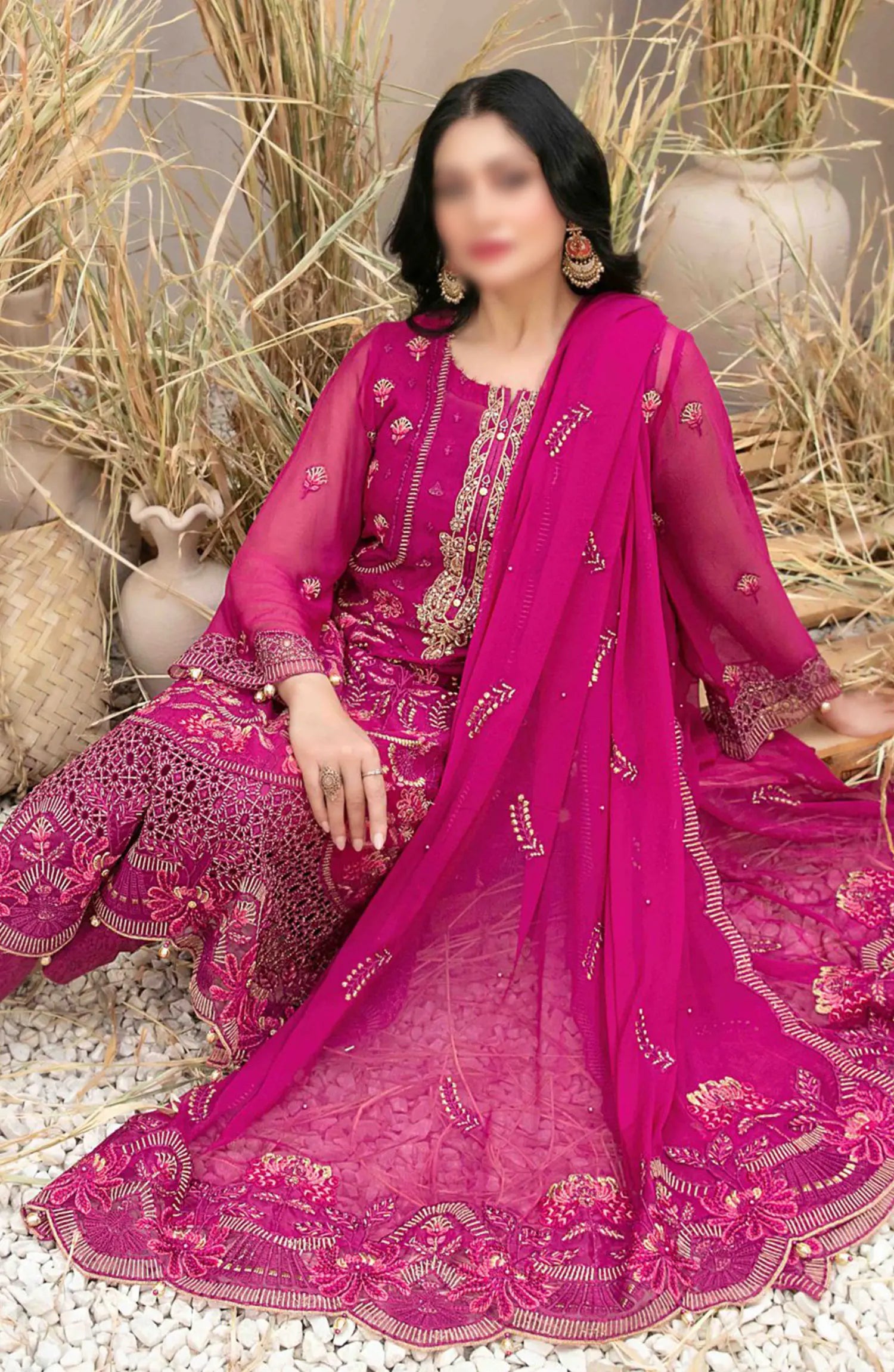 Arushi Fancy Heavy Embroidered Chiffon Collection 2024 has been styled in the image for photography and illustrative purposes.