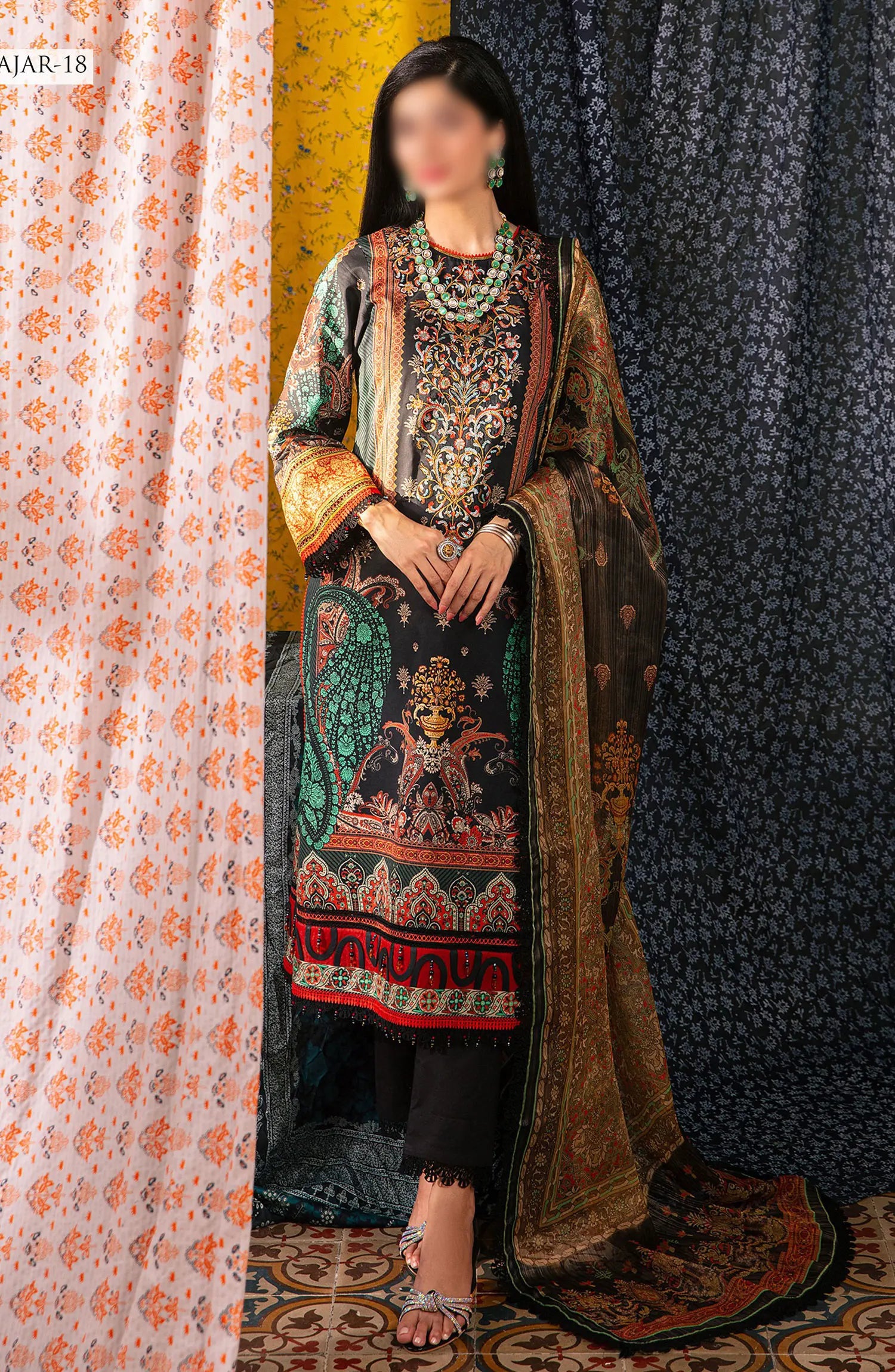 The standard style comes as a long-sleeved kameez with dupatta and trouser/shalwar.