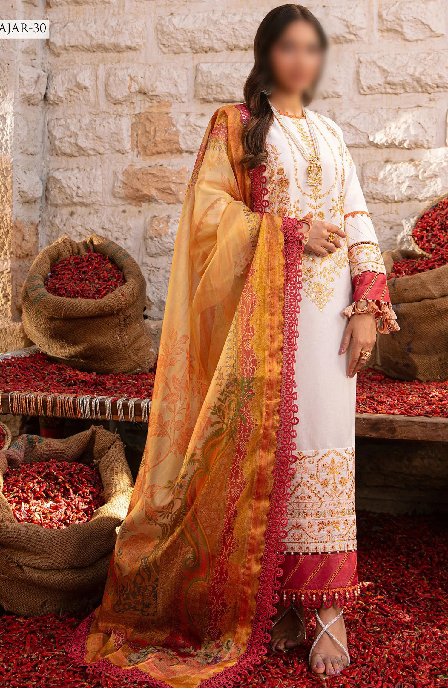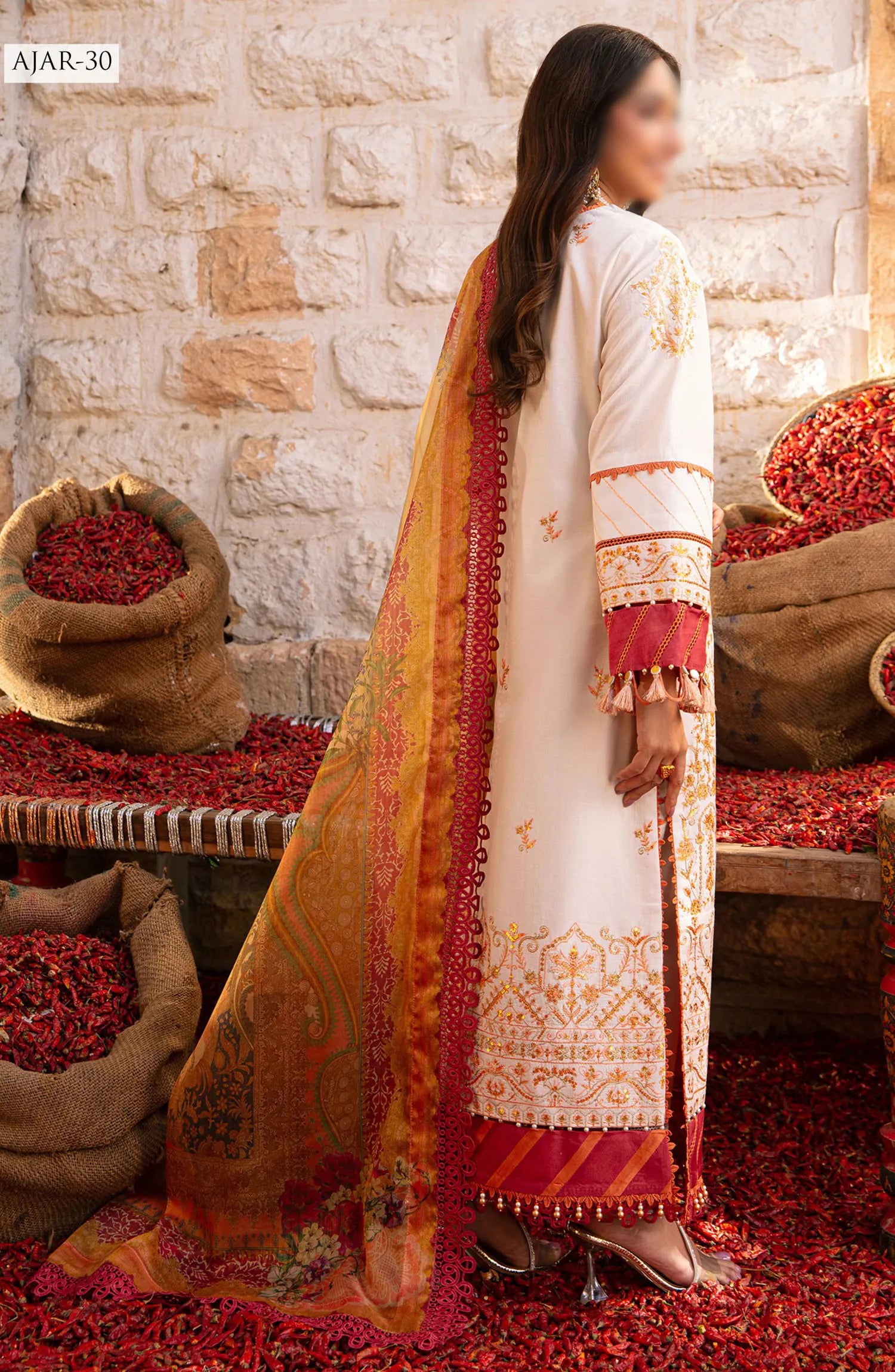The standard style comes as a long-sleeved kameez with dupatta and trouser/shalwar.