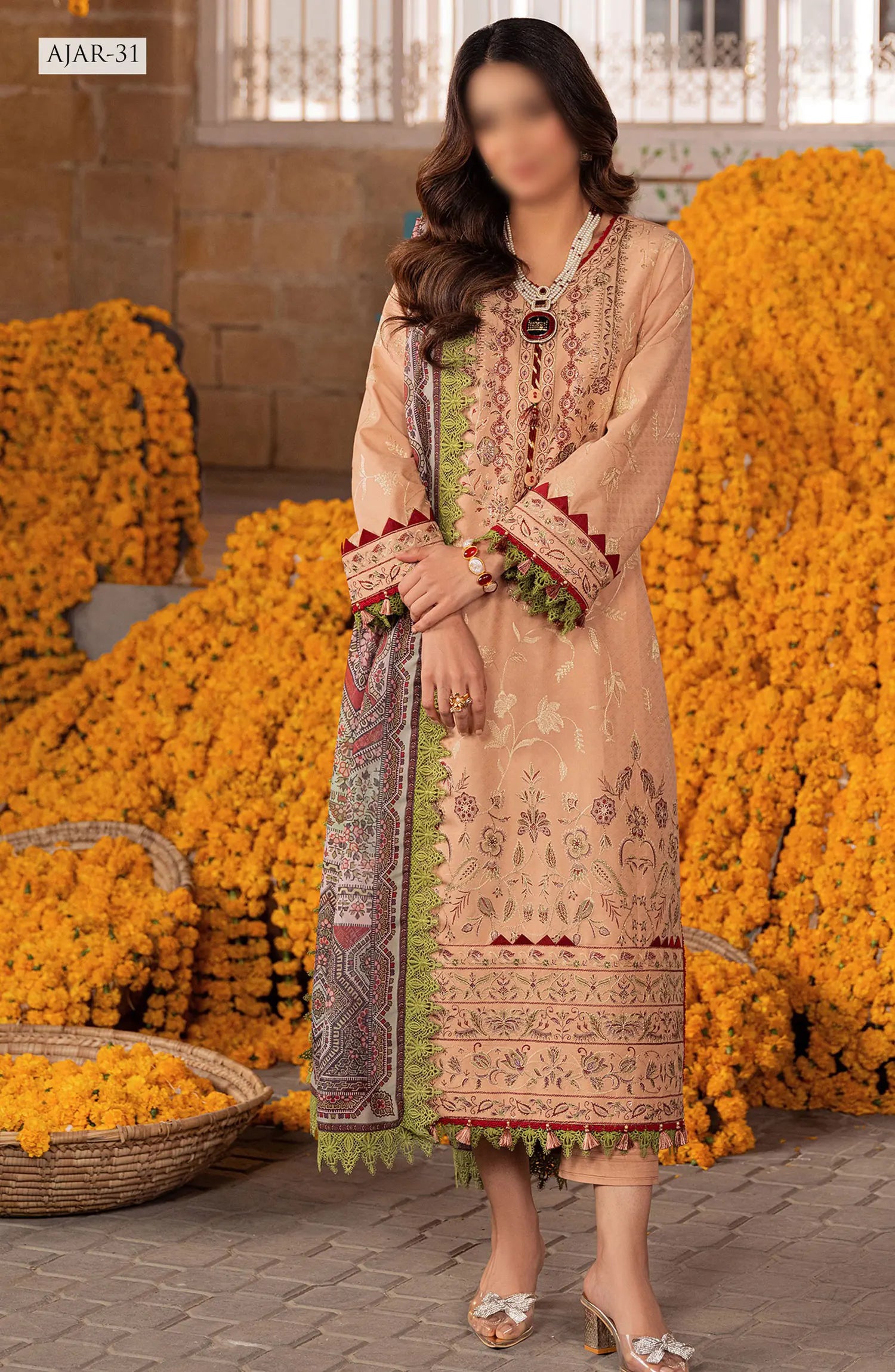 The standard style comes as a long-sleeved kameez with dupatta and trouser/shalwar.