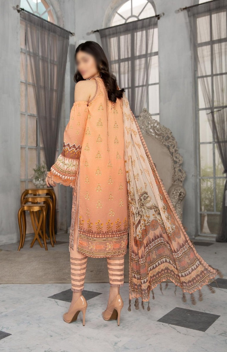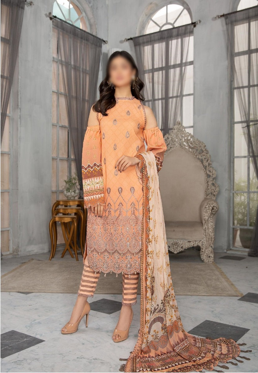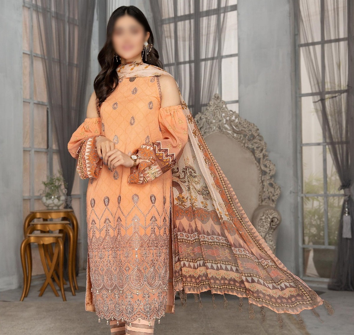 1.25 Meters Embroidered Swiss Lawn Shirt Front, 1.25 Meters Printed Shirt Back, 0.7 Meter Printed Sleeves, 2.5 Meters Plain Cotton Trouser, 2.5 Meters Printed Chiffon Dupatta