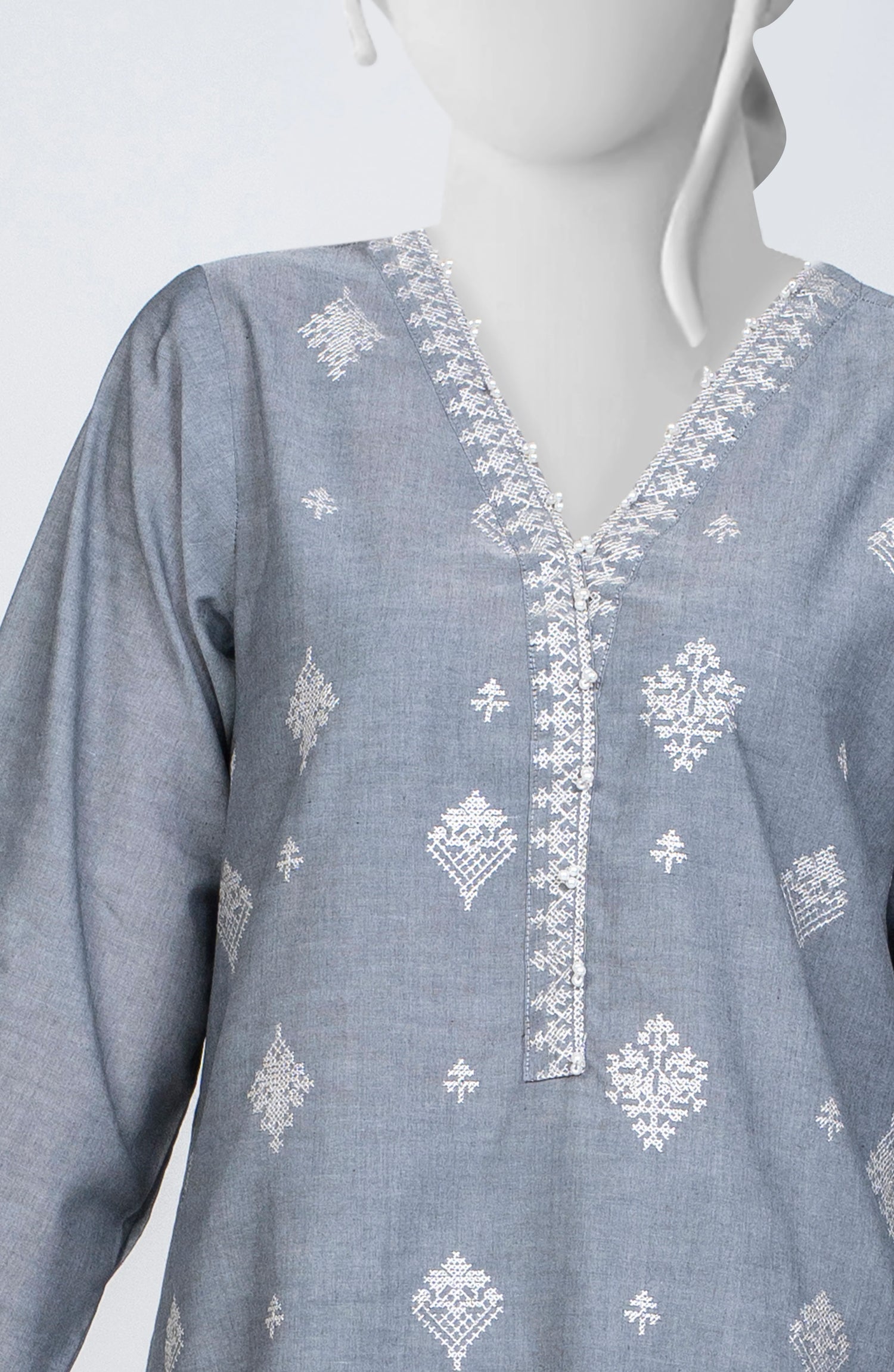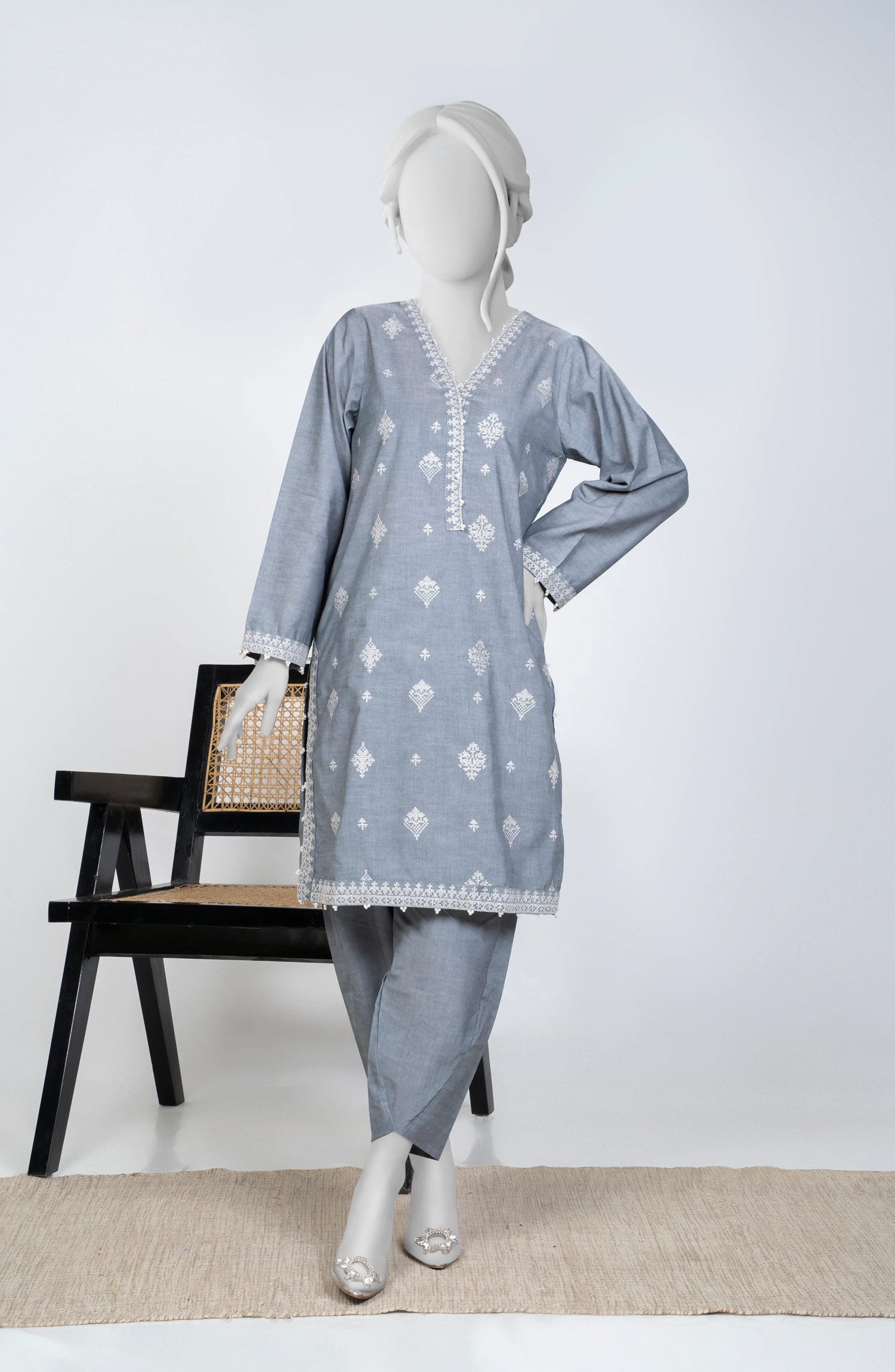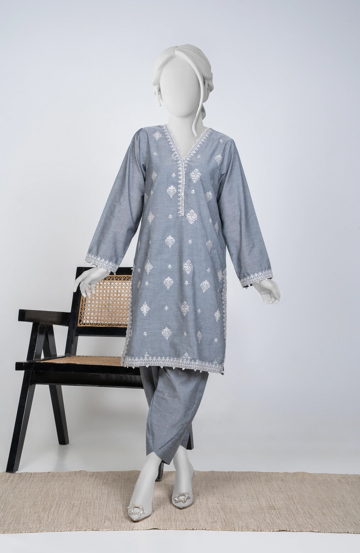 This elegant Grey 2-piece set featuring solid embroidery that adds refined texture and charm. Paired with tulip-shaped trousers, it offers a fresh and graceful silhouette perfect for stylish winter wear. This ensemble blends comfort and sophistication, making it an ideal choice for those seeking understated elegance with a modern touch.