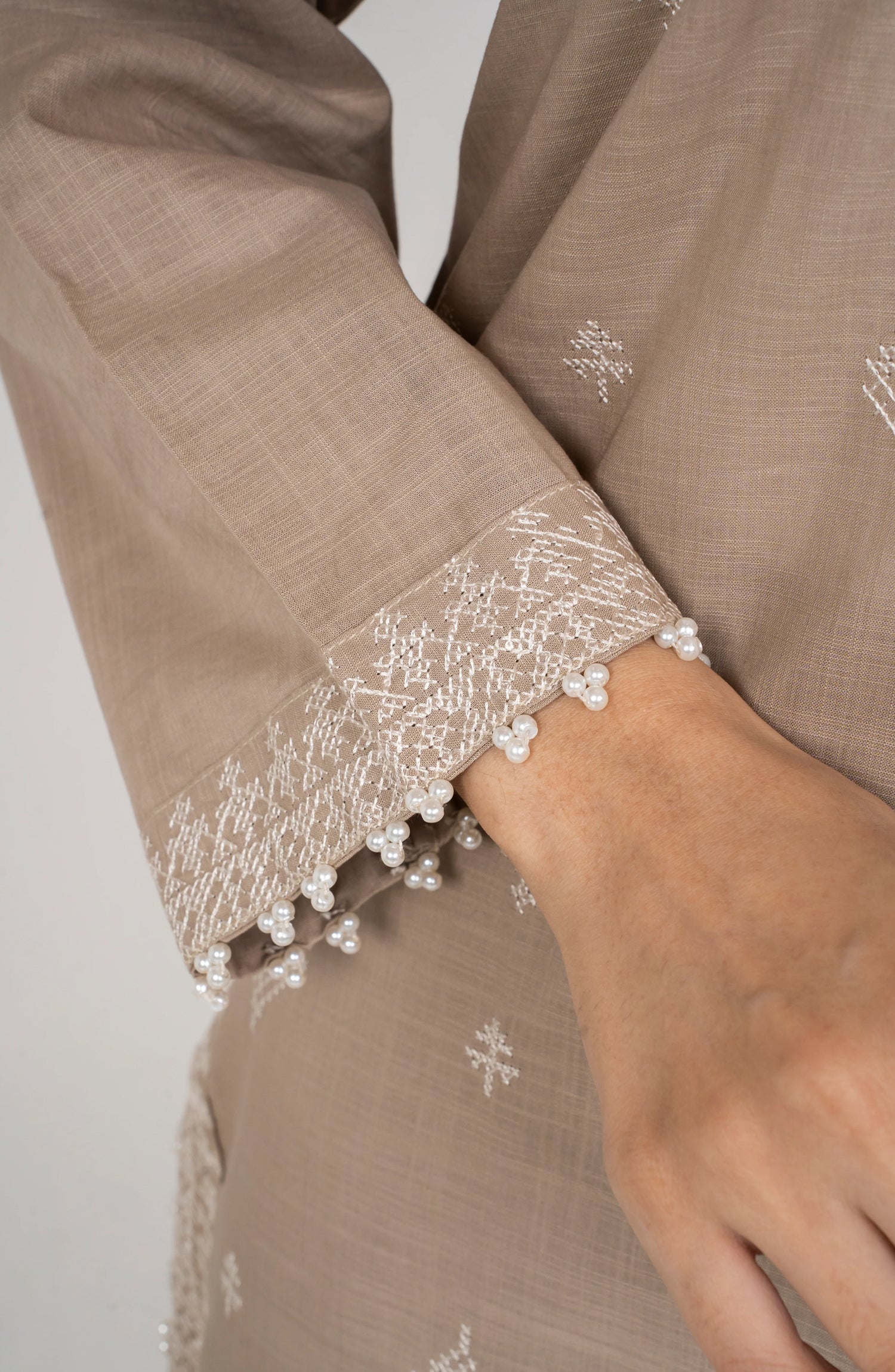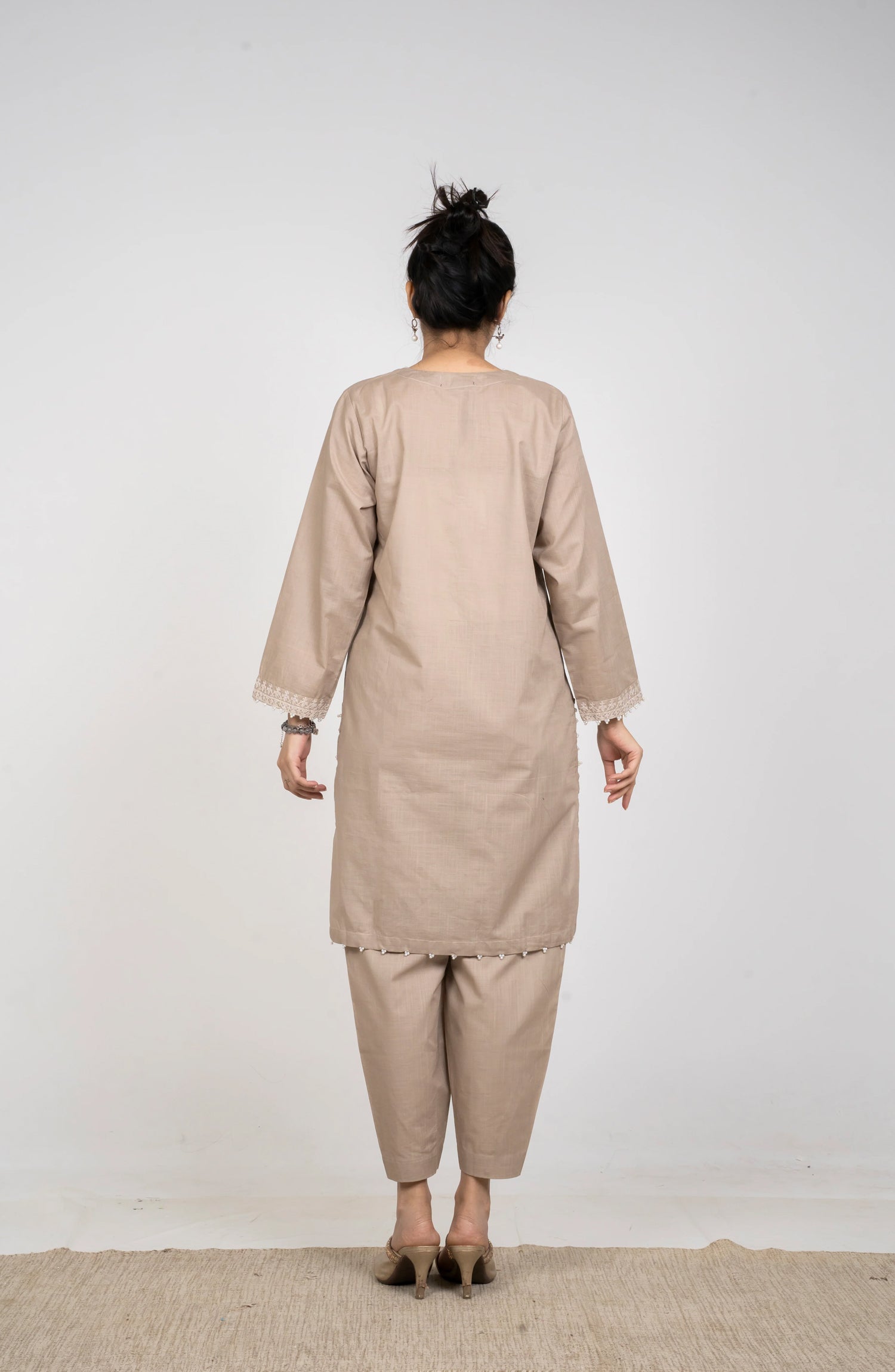 This Elegant Mushroom Beige 2-piece set featuring solid embroidery that adds refined texture and charm. Paired with tulip-shaped trousers, it offers a fresh and graceful silhouette perfect for stylish winter wear. This ensemble blends comfort and sophistication, making it an ideal choice for those seeking understated elegance with a modern touch.