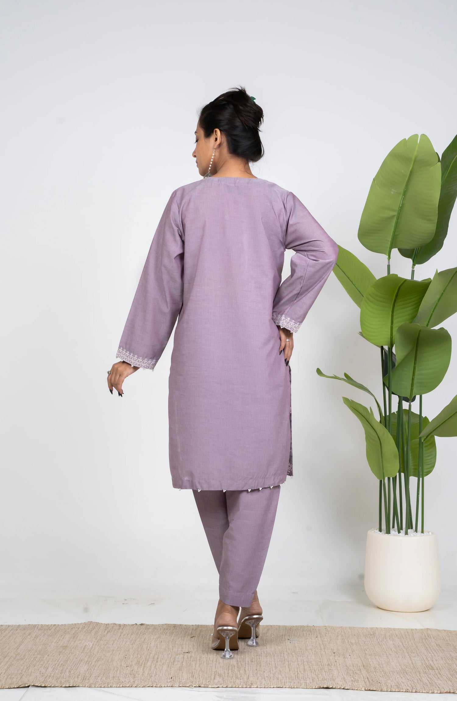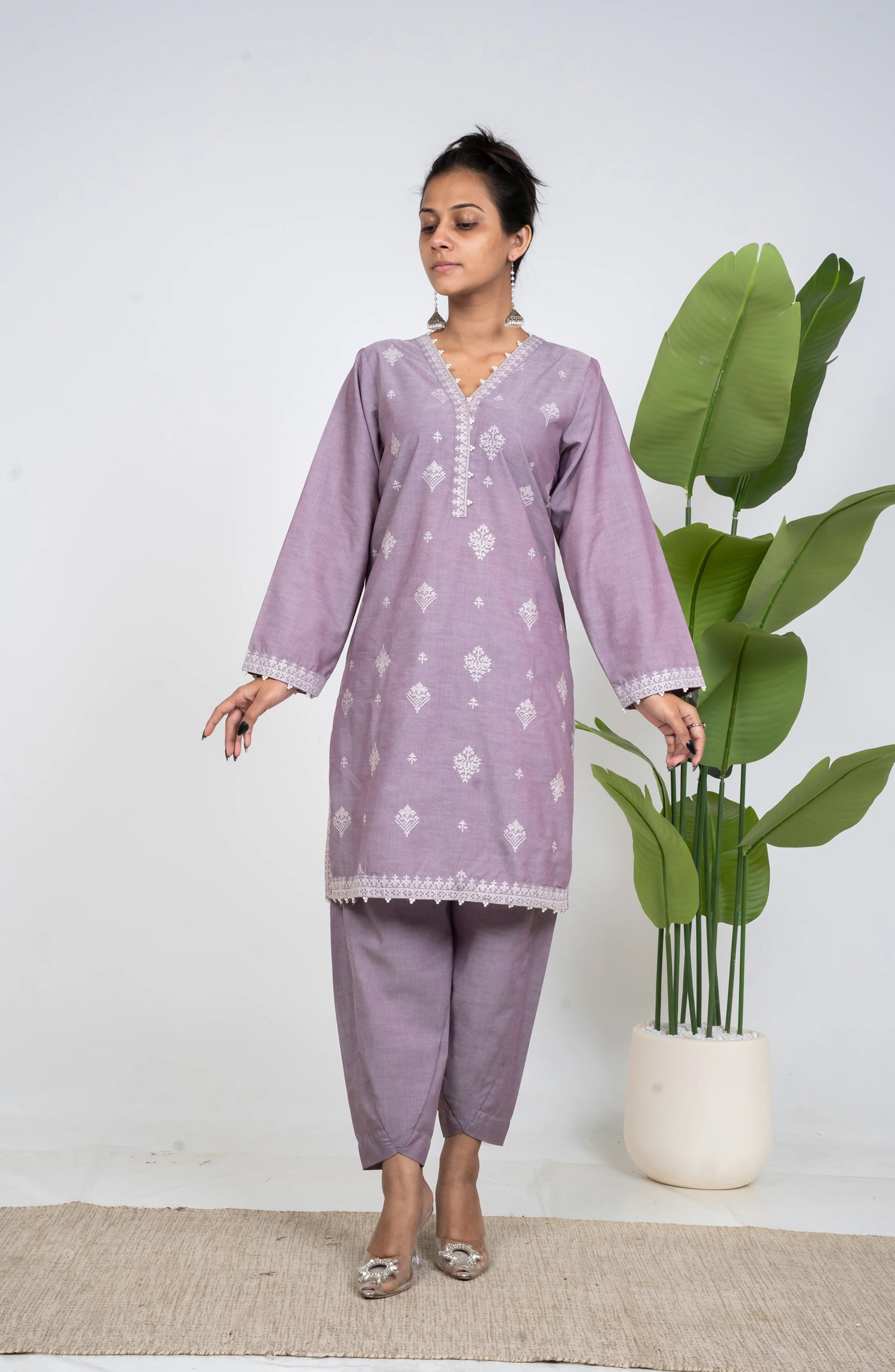 This elegant Lilac 2-piece set featuring solid embroidery that adds refined texture and charm. Paired with tulip-shaped trousers, it offers a fresh and graceful silhouette perfect for stylish winter wear. This ensemble blends comfort and sophistication, making it an ideal choice for those seeking understated elegance with a modern touch.