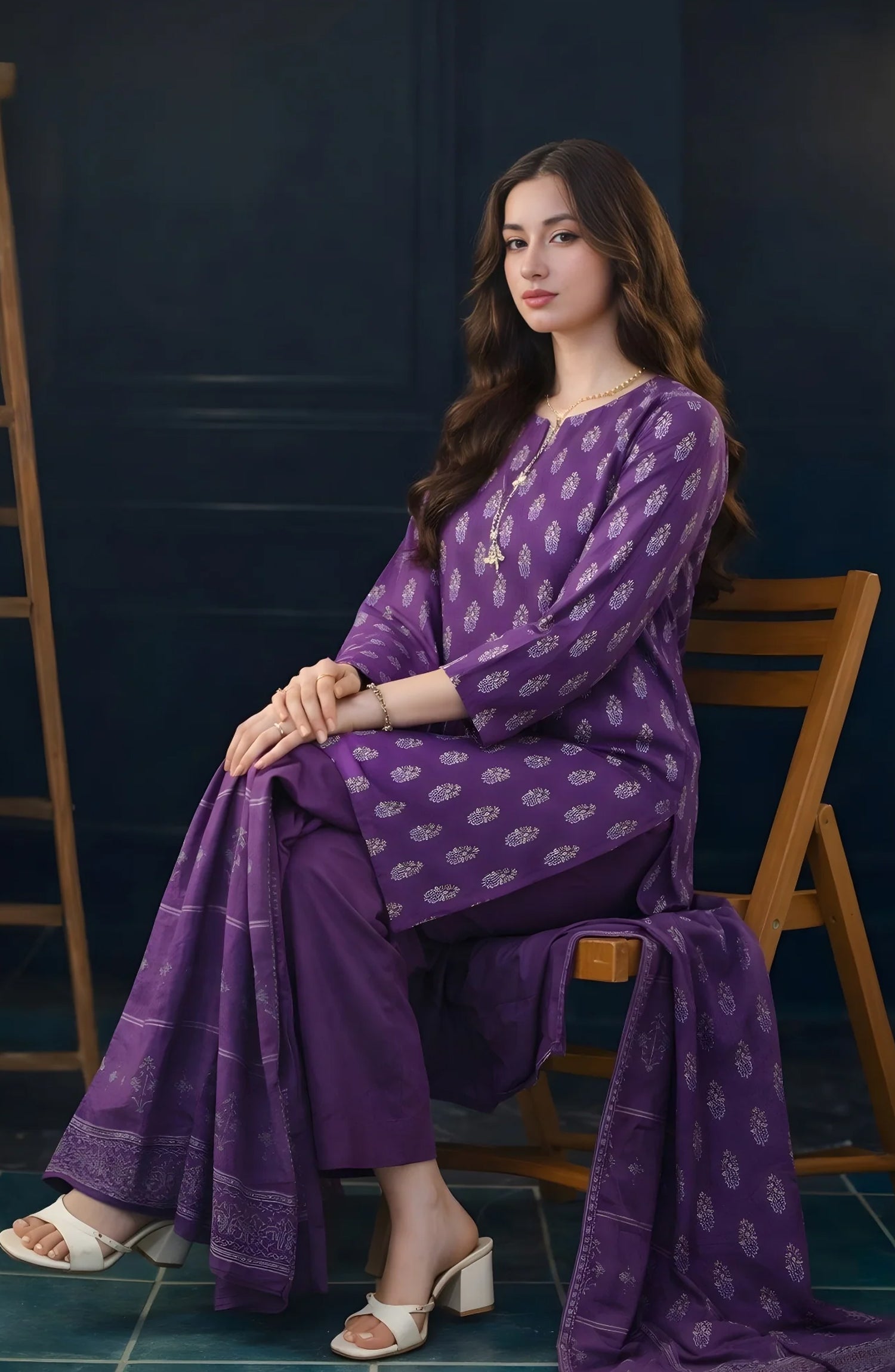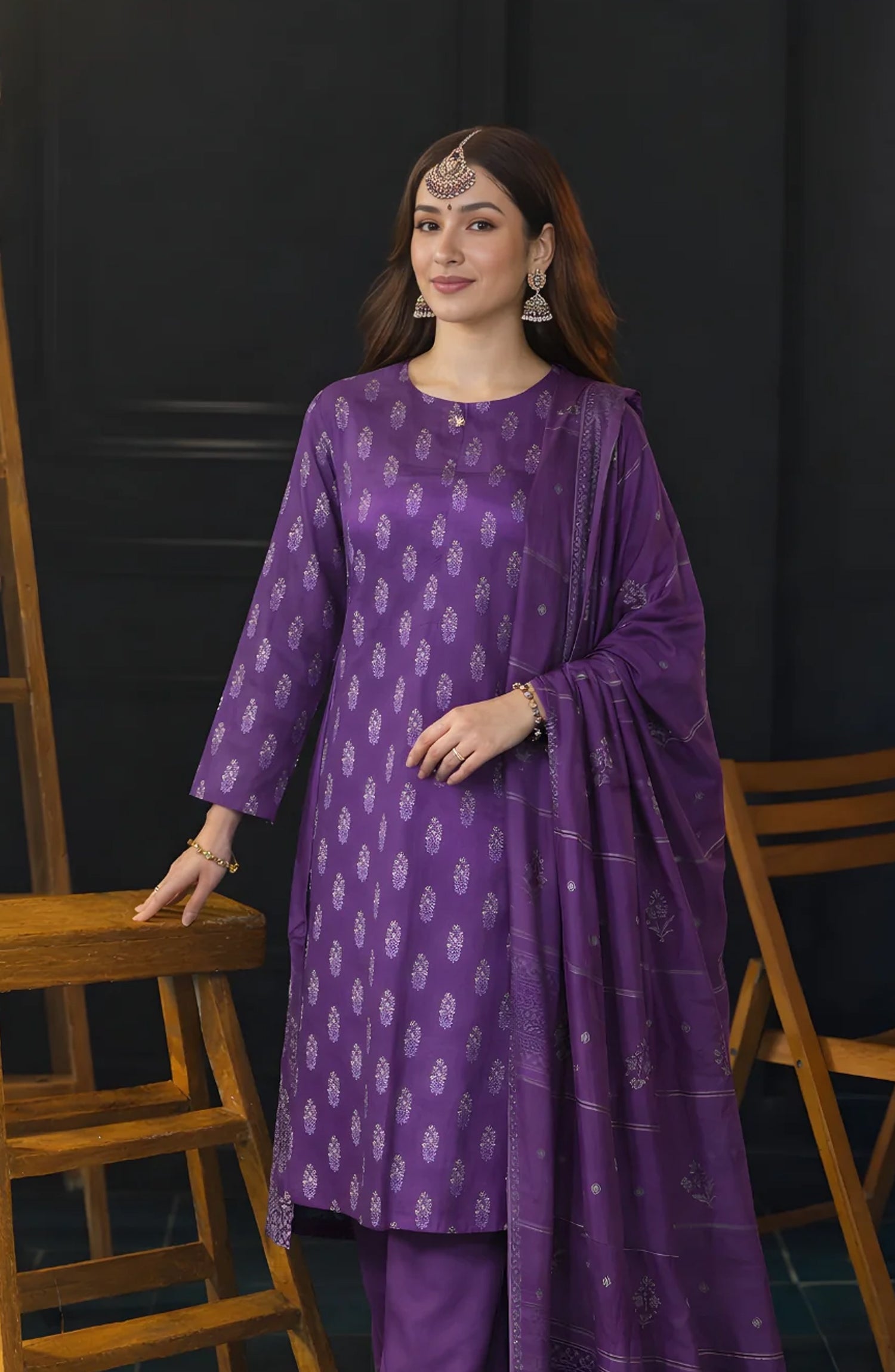 A regal jacquard shirt in deep royal purple, paired with a self-woven jacquard dupatta and solid cambric trousers. This outfit blends tradition with a modern silhouette, perfect for premium daily pret or light festivities.