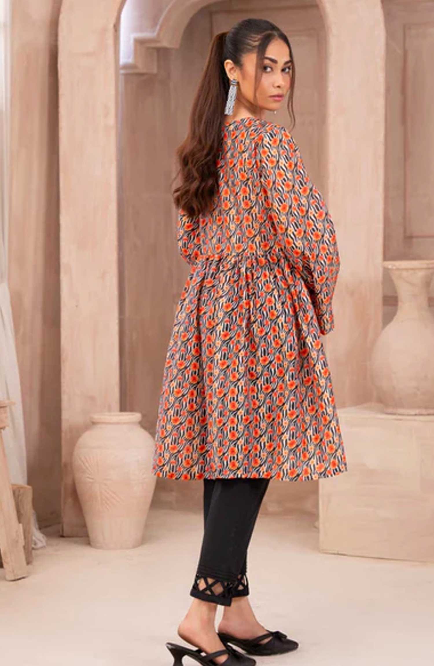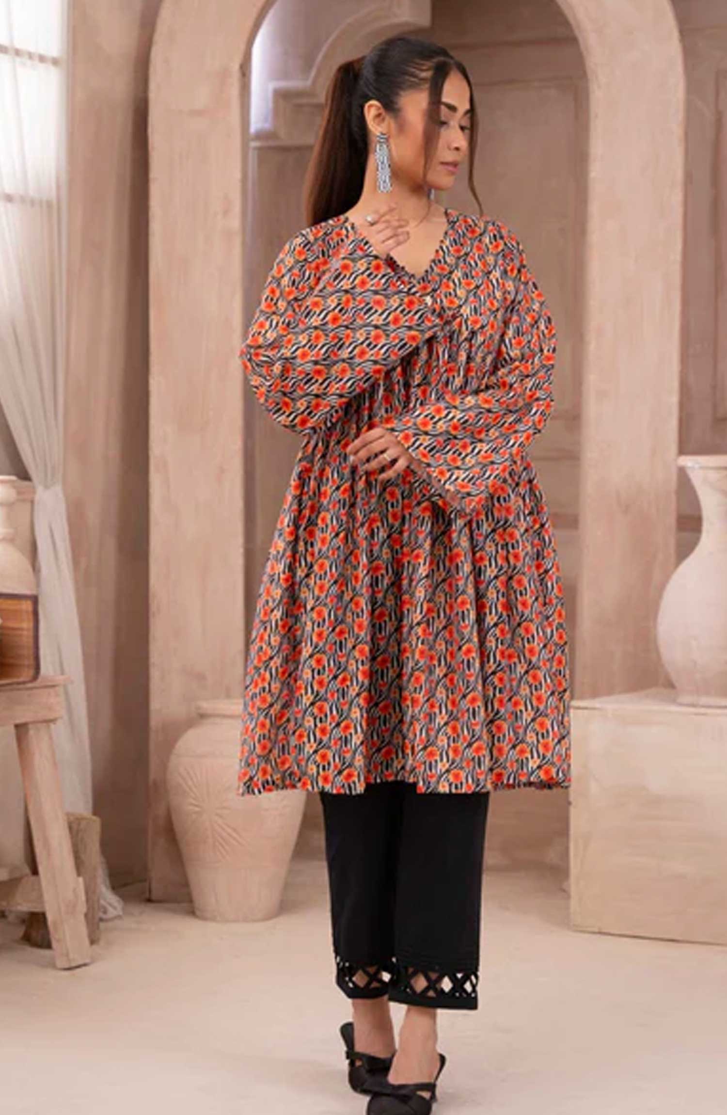 - Printed short frock with VNeck.
