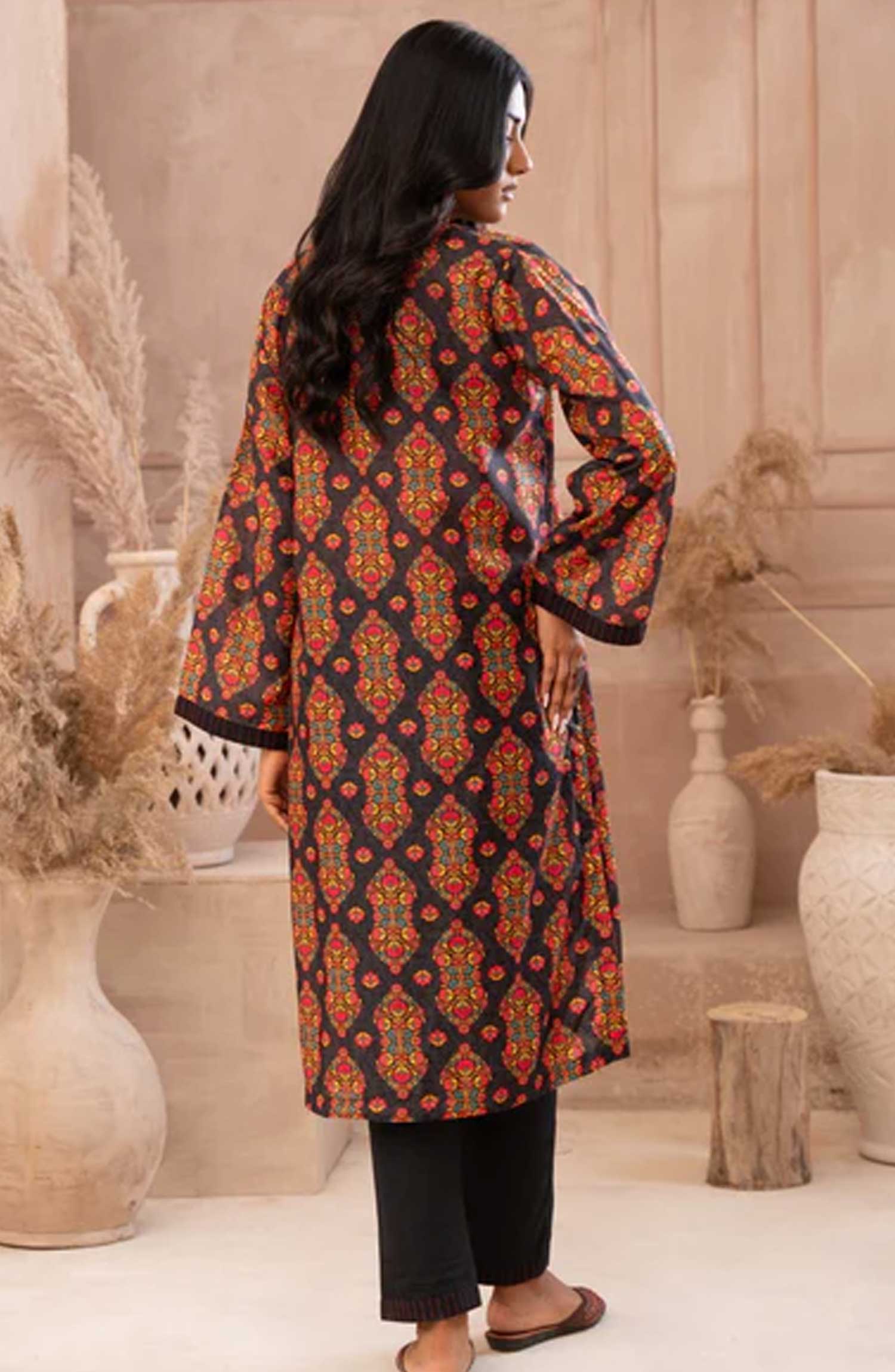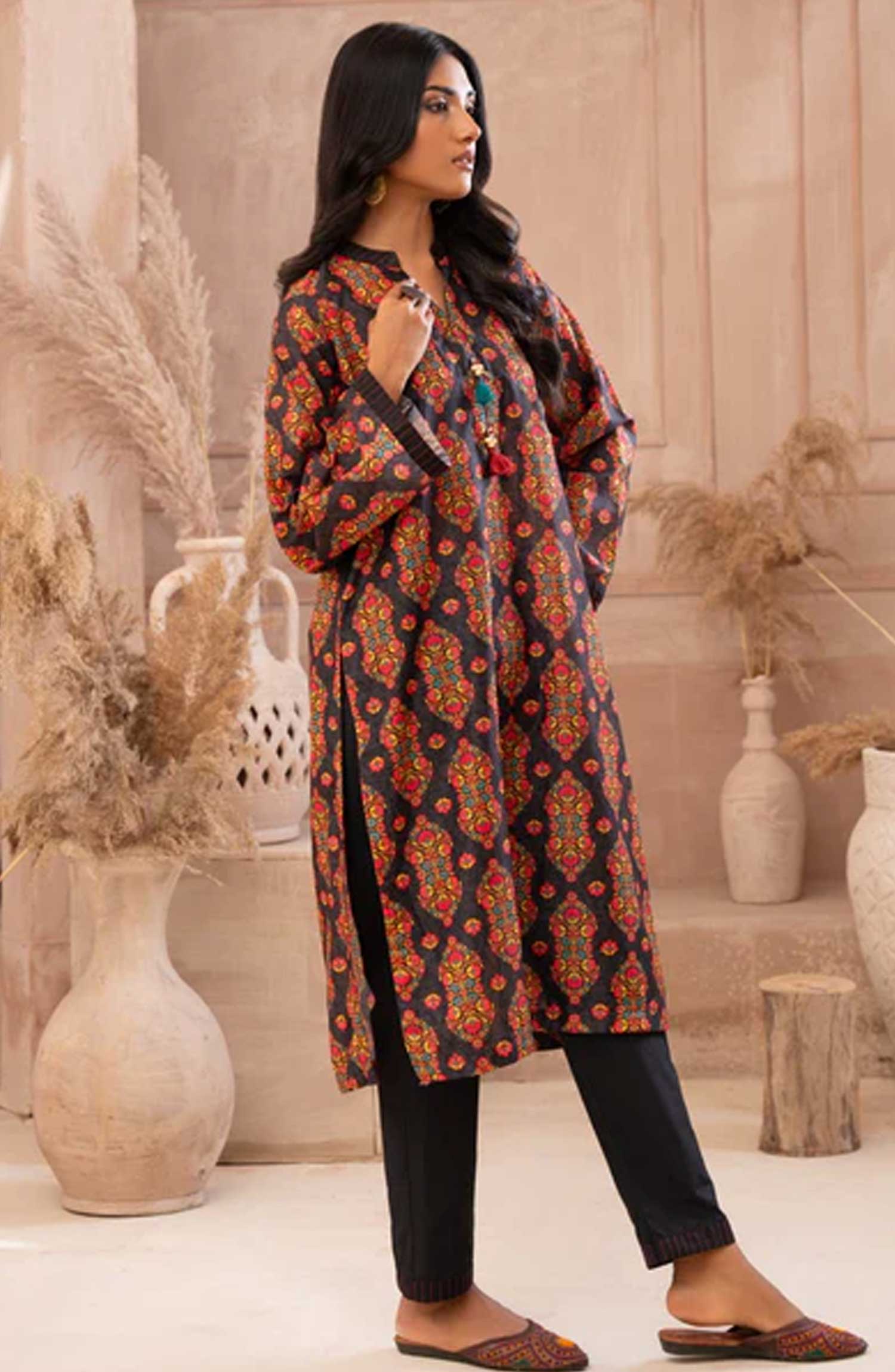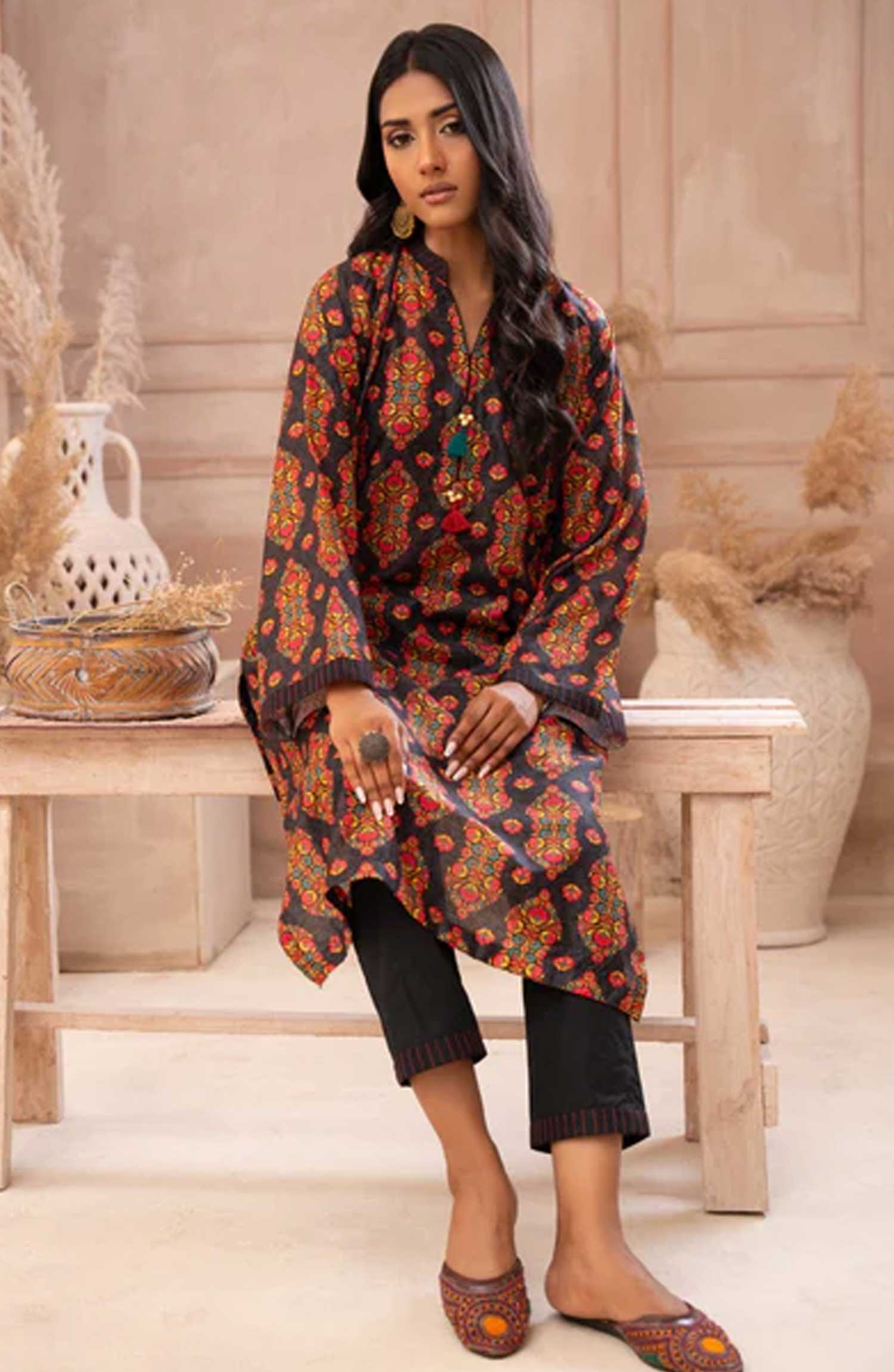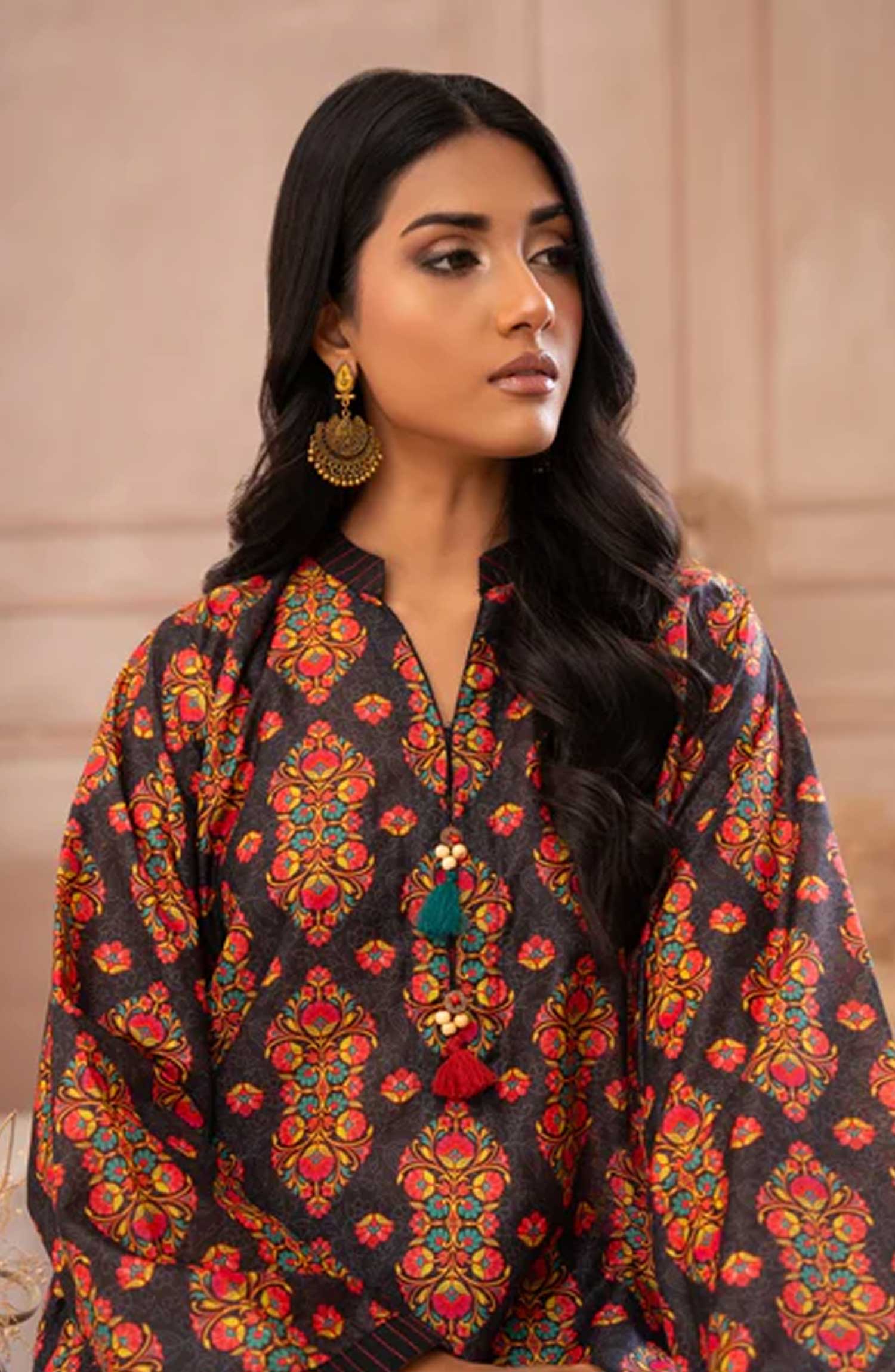 Dark Eden this contemporary yet classy design is portrayed on this graceful ensemble rendered in an appealing vibrant shade. Digital printed lawn shirt featuring a ban collar with buttons, straight hemline and straight sleeves. These are paired with a plain trouser.