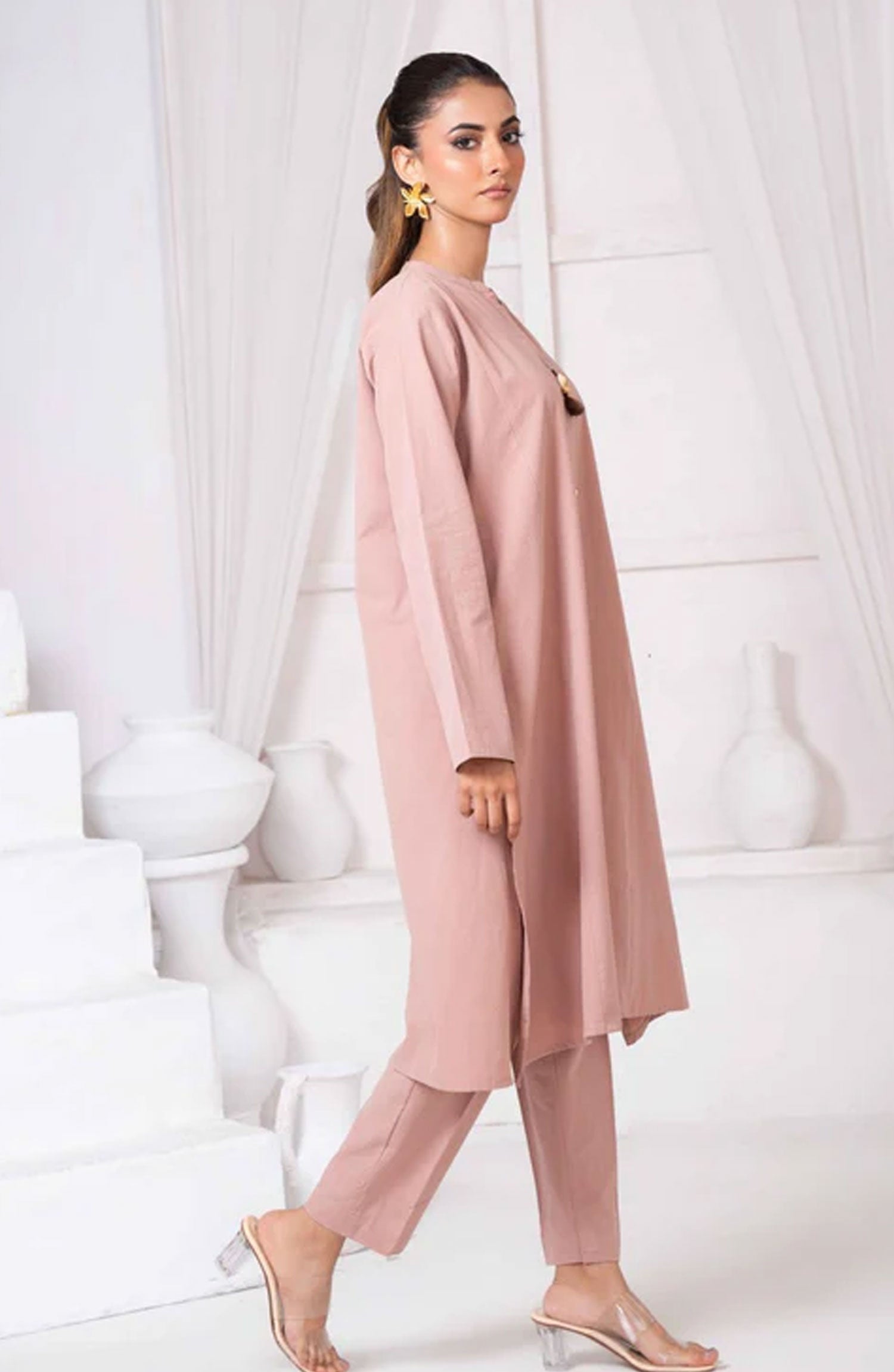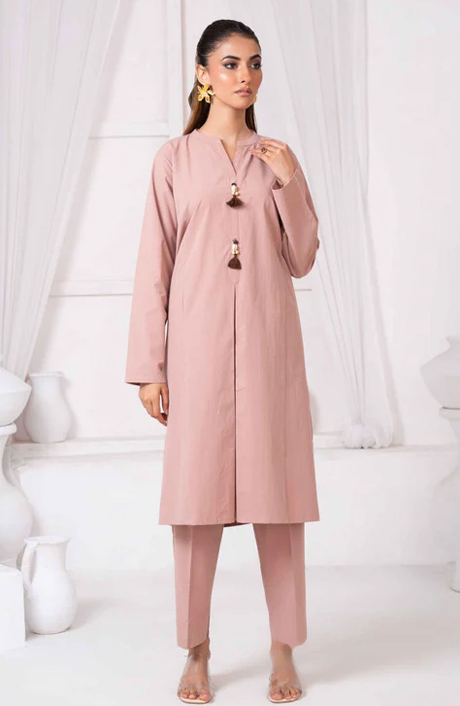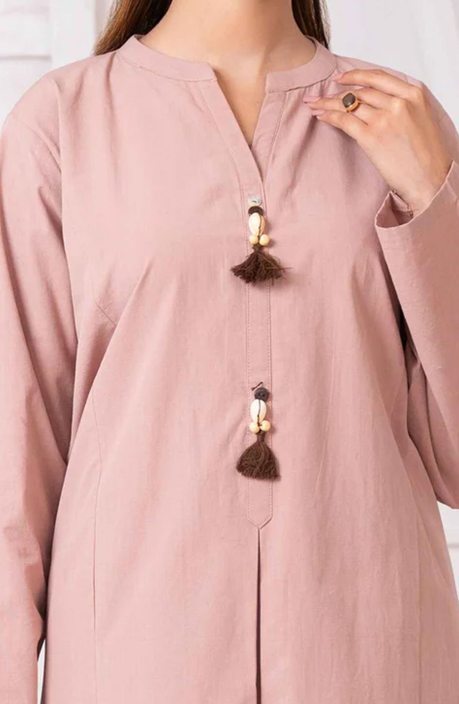 Blush fascinating ensemble is perfect for a trendy look. Self cotton shirt with a stand collar with shell buttons, with plain sleeves and daaman. The matching pants also have an aesthetically design perfect for a statement look.
