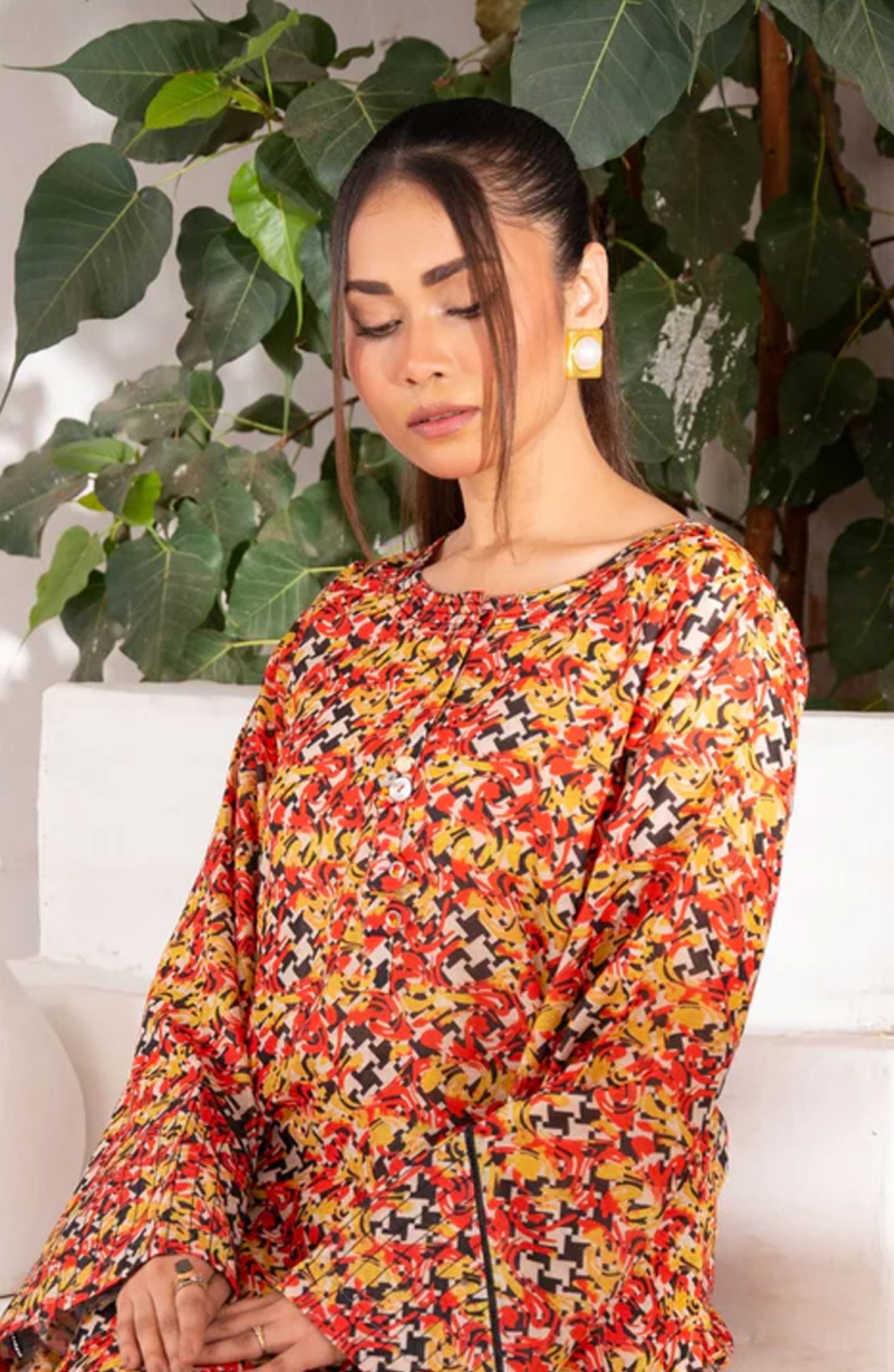 Misty Colours printed Co-ord with a simple neckline is stylized with hand-made buttons and stylish sleeve details. These are paired with tulip cut pants.