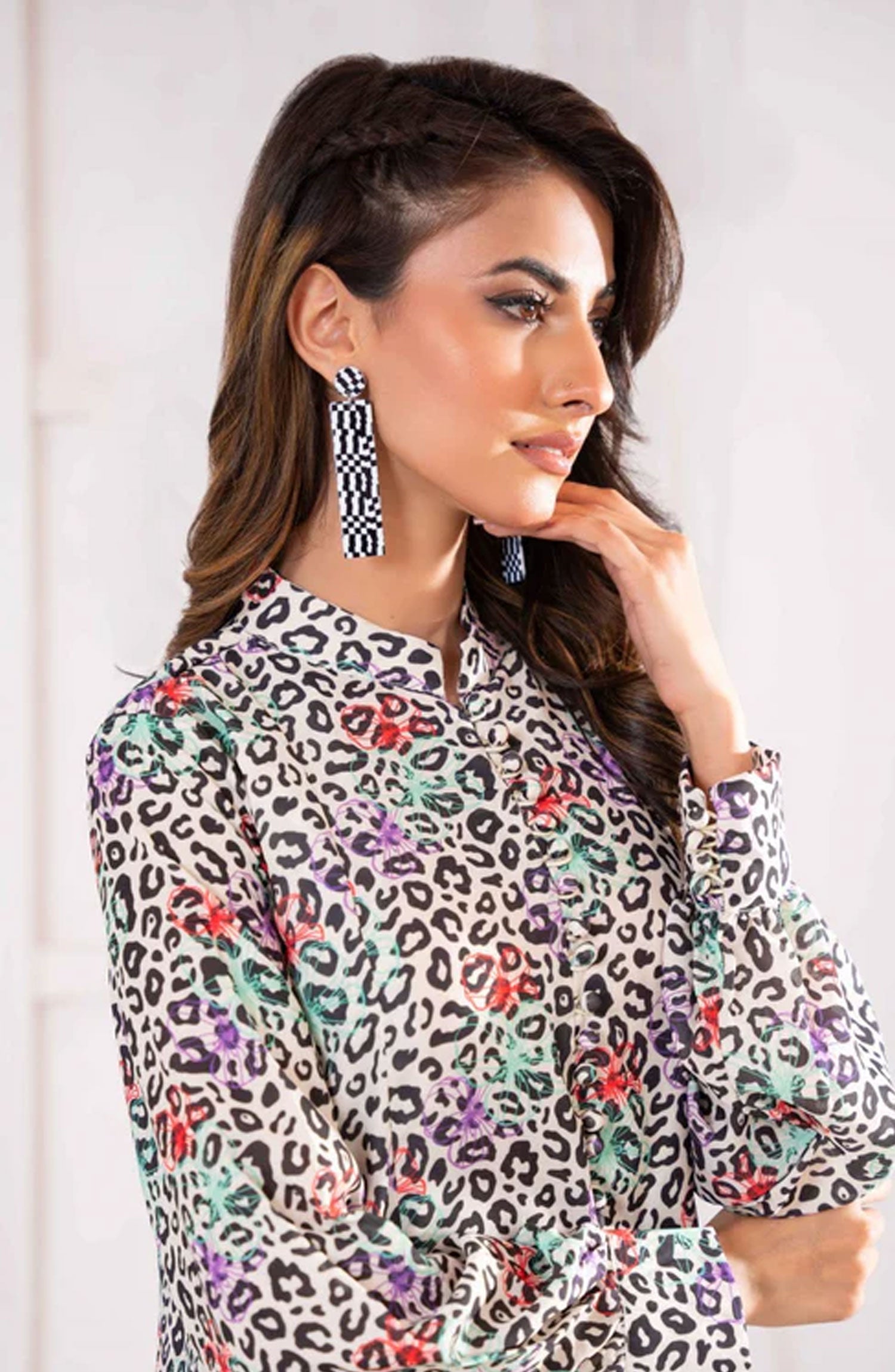 Pop leopard this beautiful article features a two piece co-ord with front pleats on shirt, cuffs on sleeves & a shirt collar with buttons in front, and elegant loose pants.