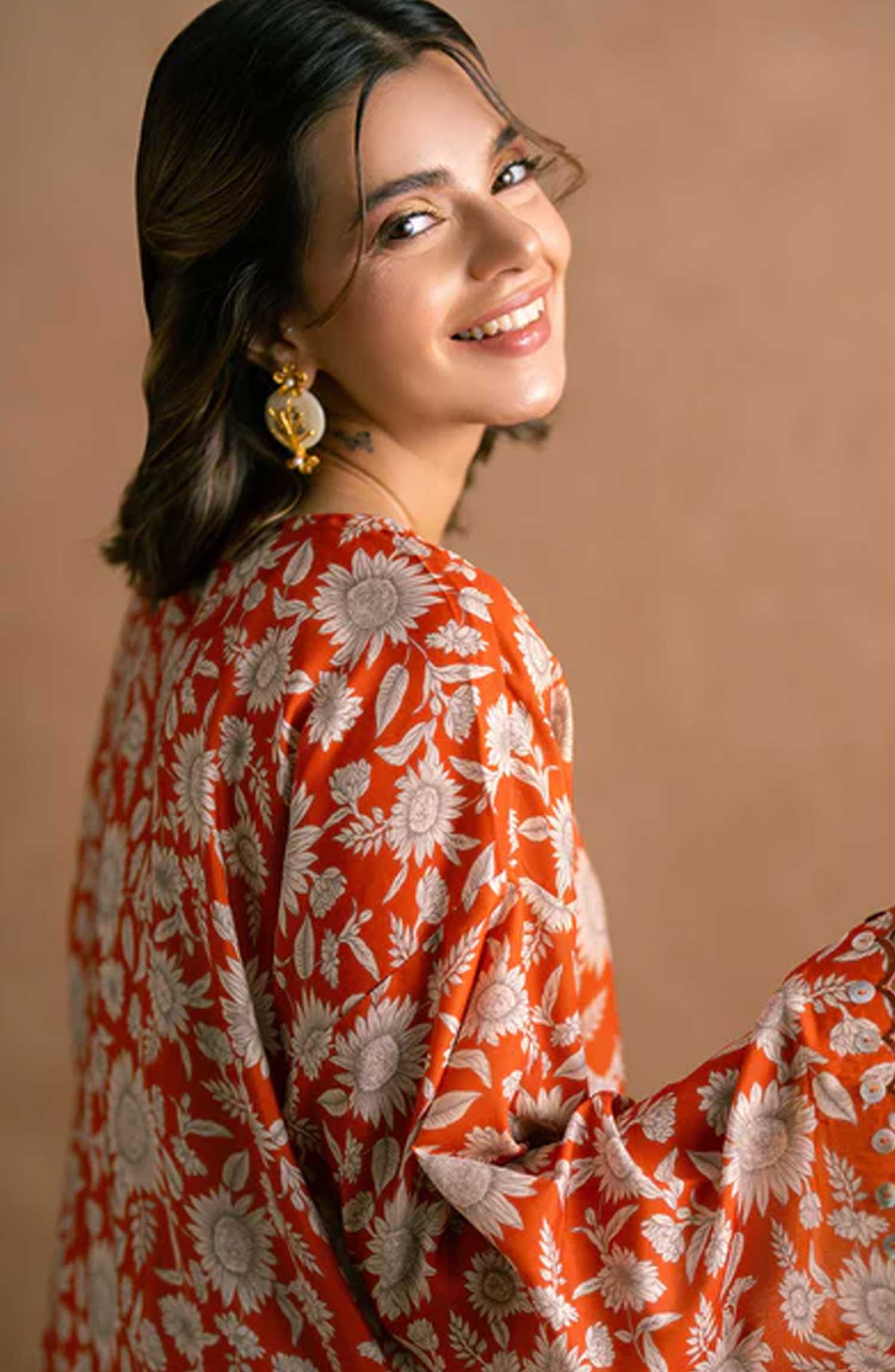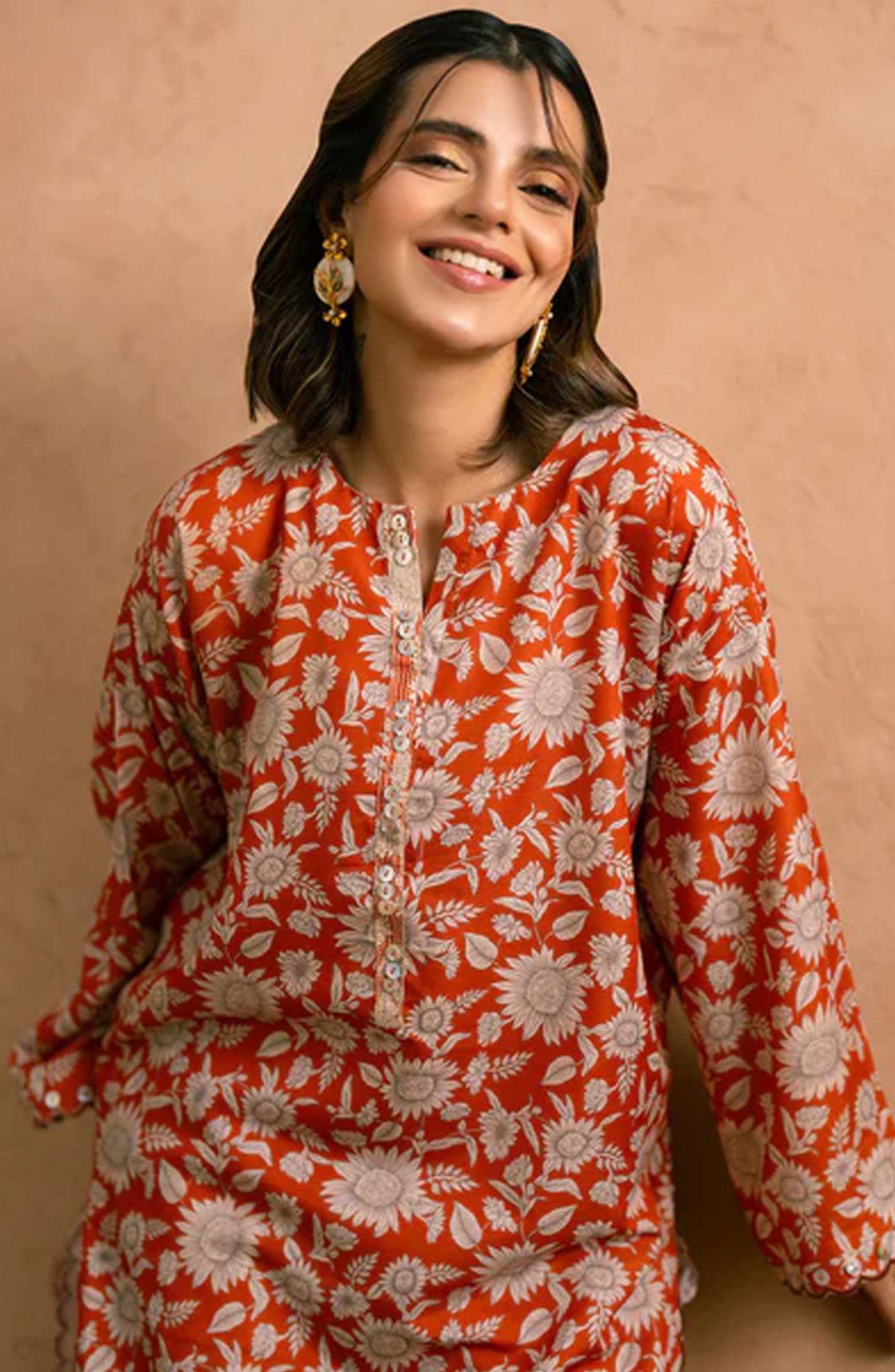 Embrace effortless style with our drop shoulder kameez in vivid Orange, adorned with digital prints of beautiful flowers.