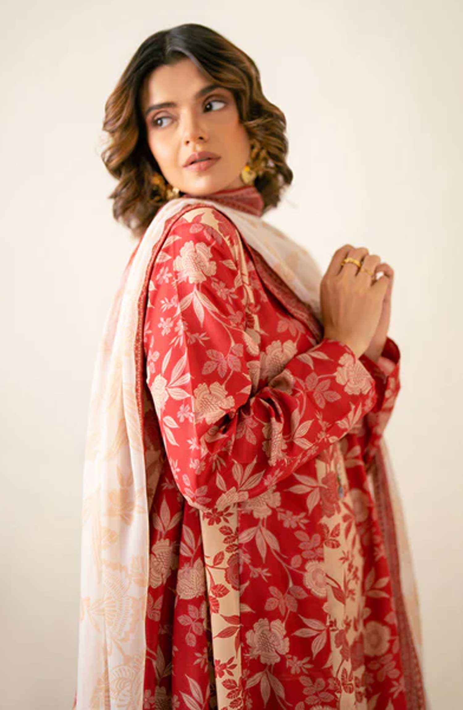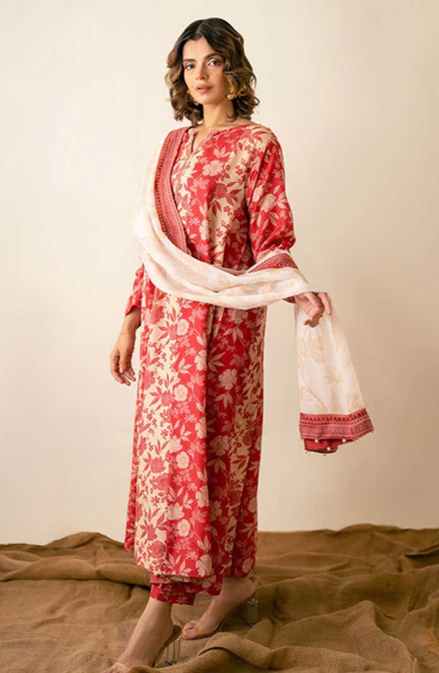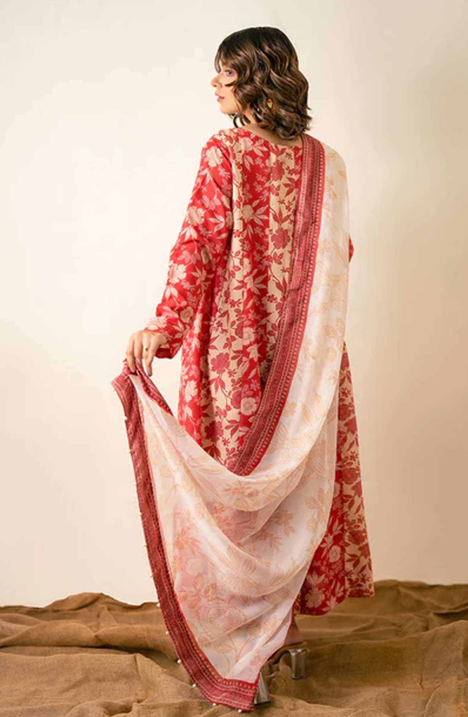 Elevate your wardrobe with our Kalidar flared kameez in striking red, featuring intricate beige floral digital prints.