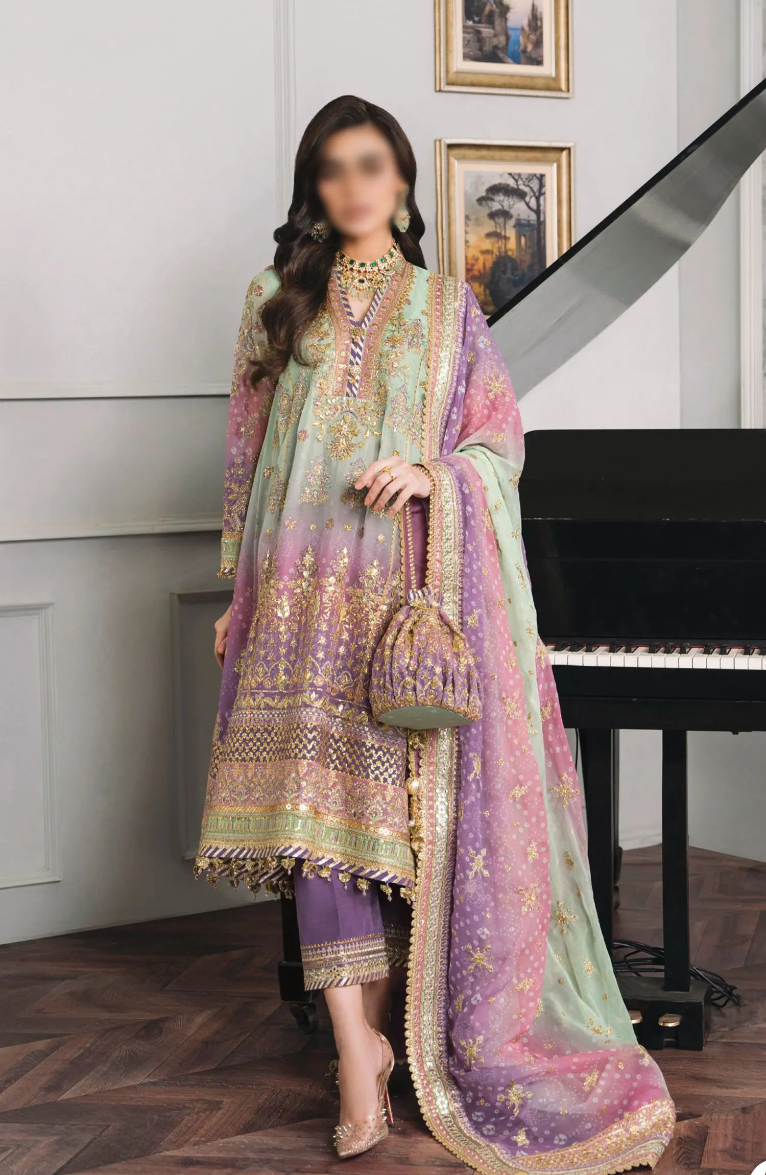 The standard style comes as a long-sleeved kameez with dupatta and trouser/shawlar.