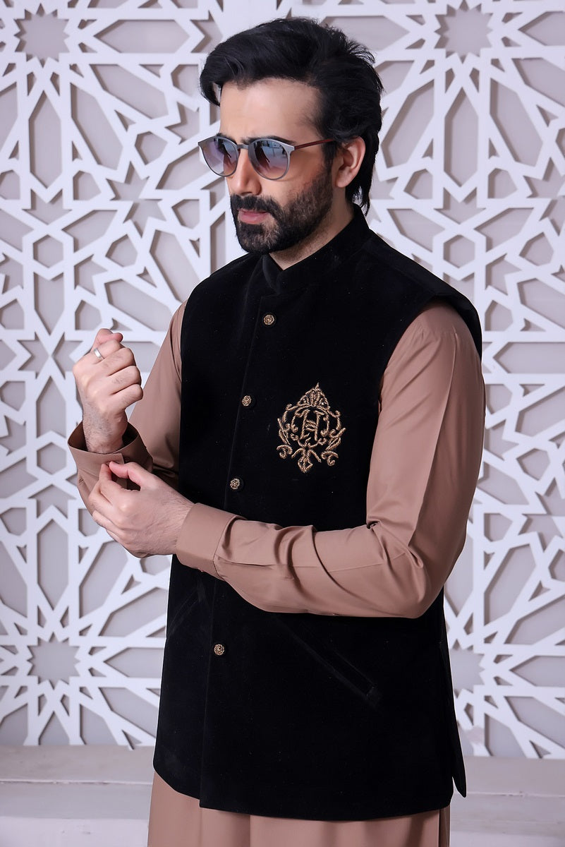 Menâs Formal Velvet Waistcoat and Blended Suit with Motive on Front Pocket.