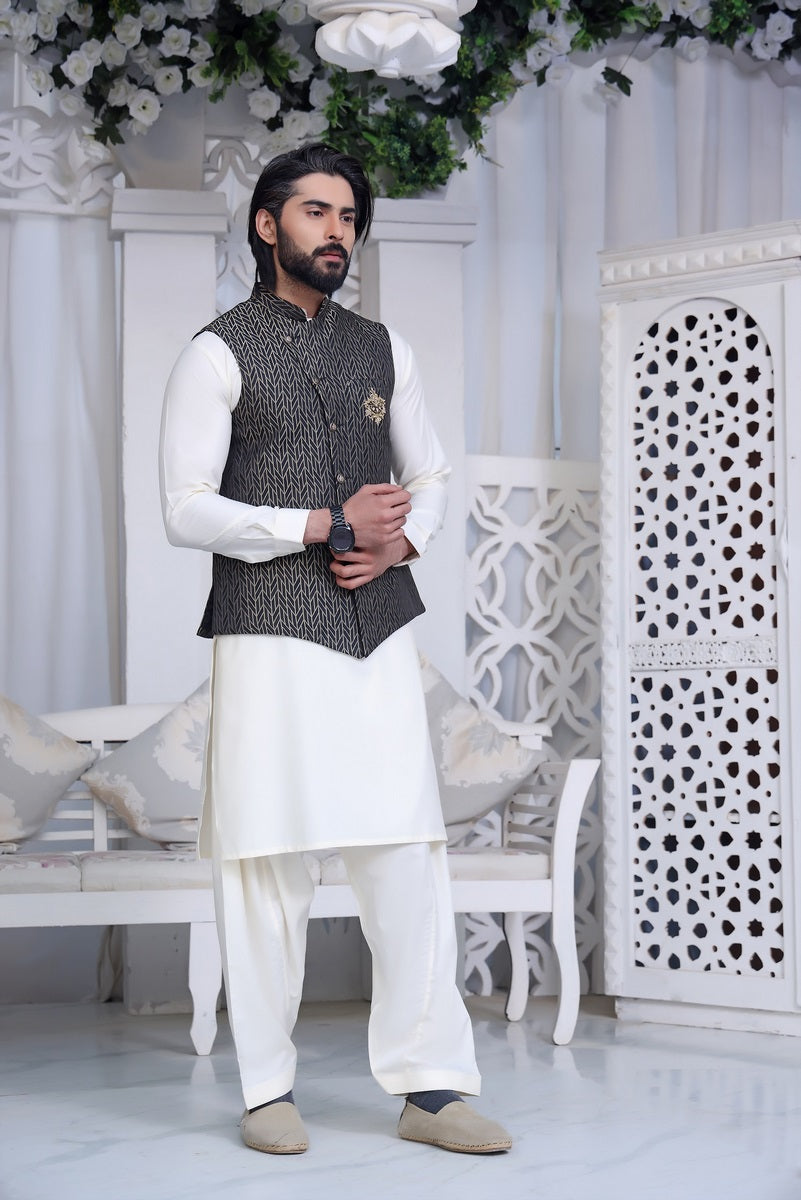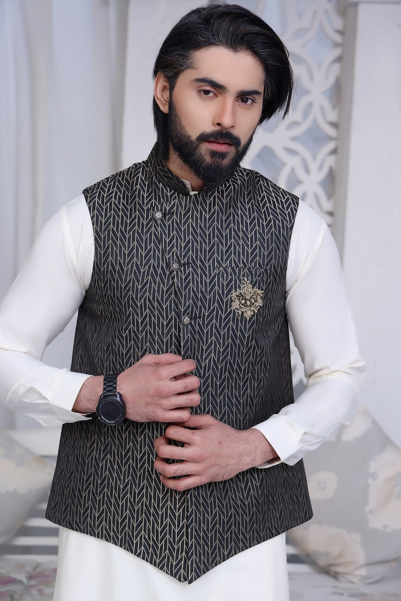 Menâs Formal Velvet Waistcoat and Blended Suit with Motive on Front Pocket.