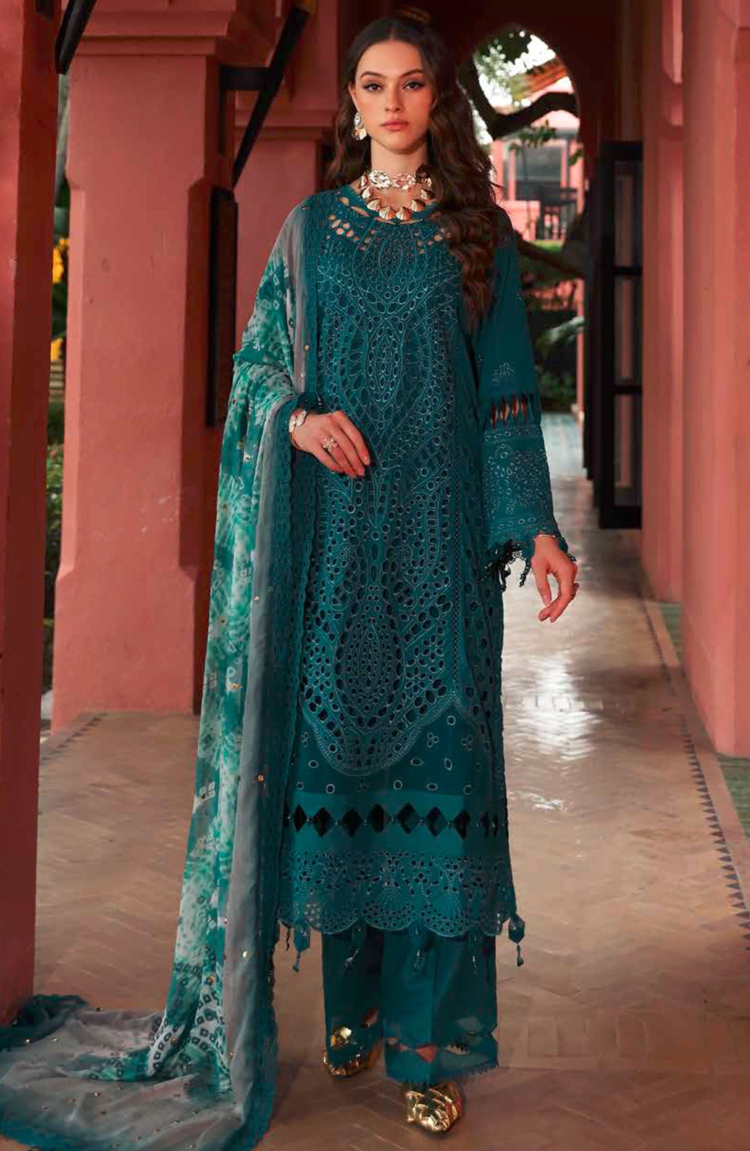 The standard style comes as a long-sleeved kameez with dupatta and trouser/shawlar.