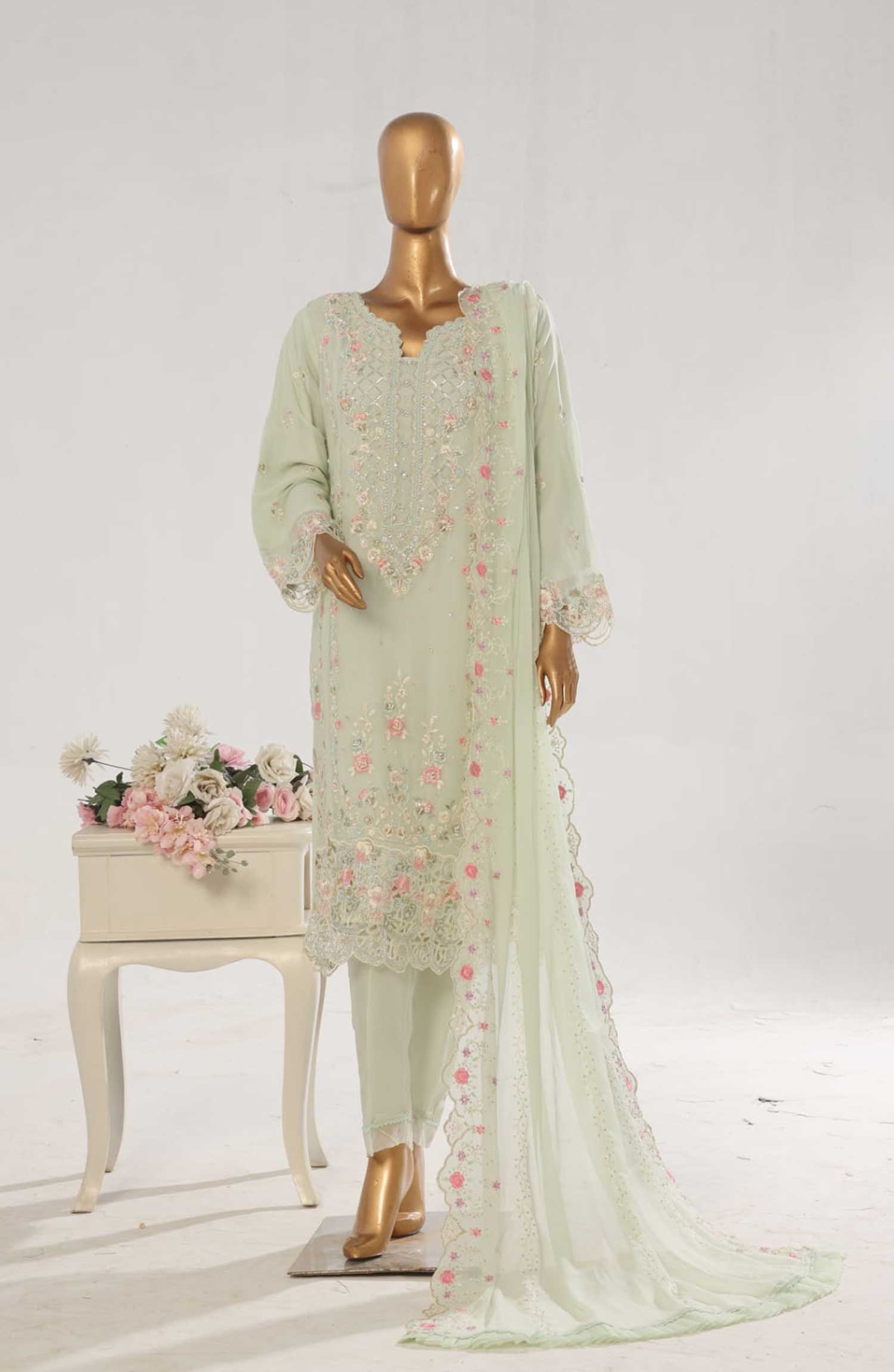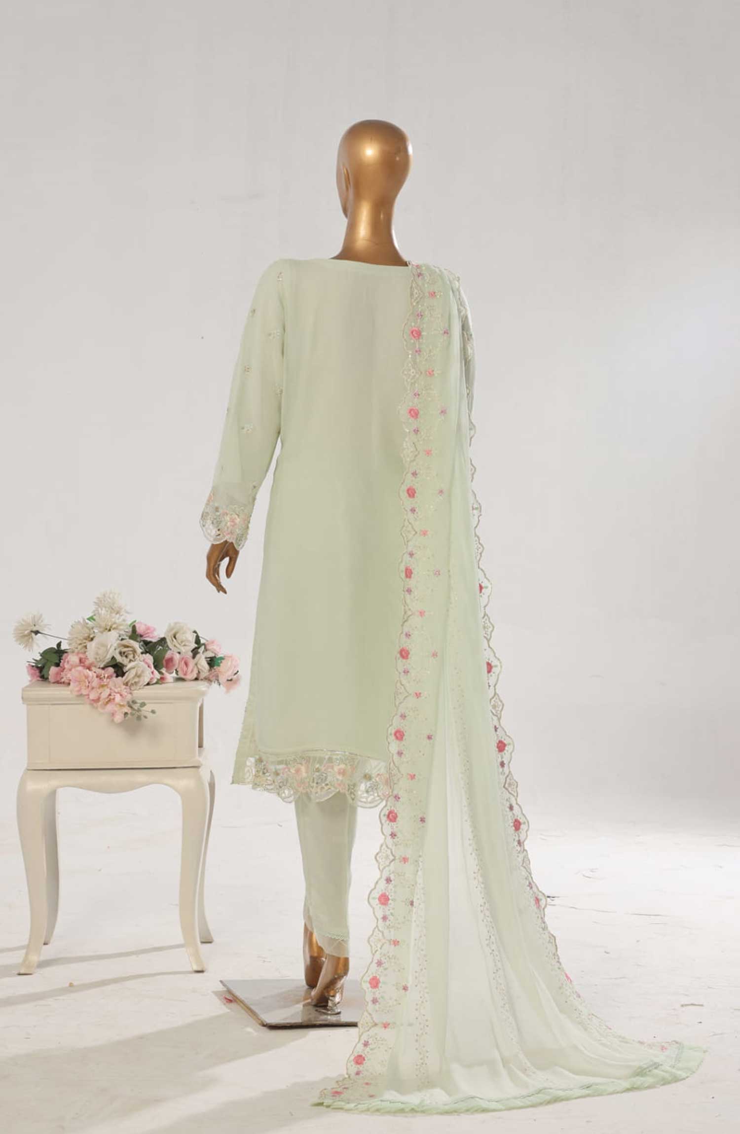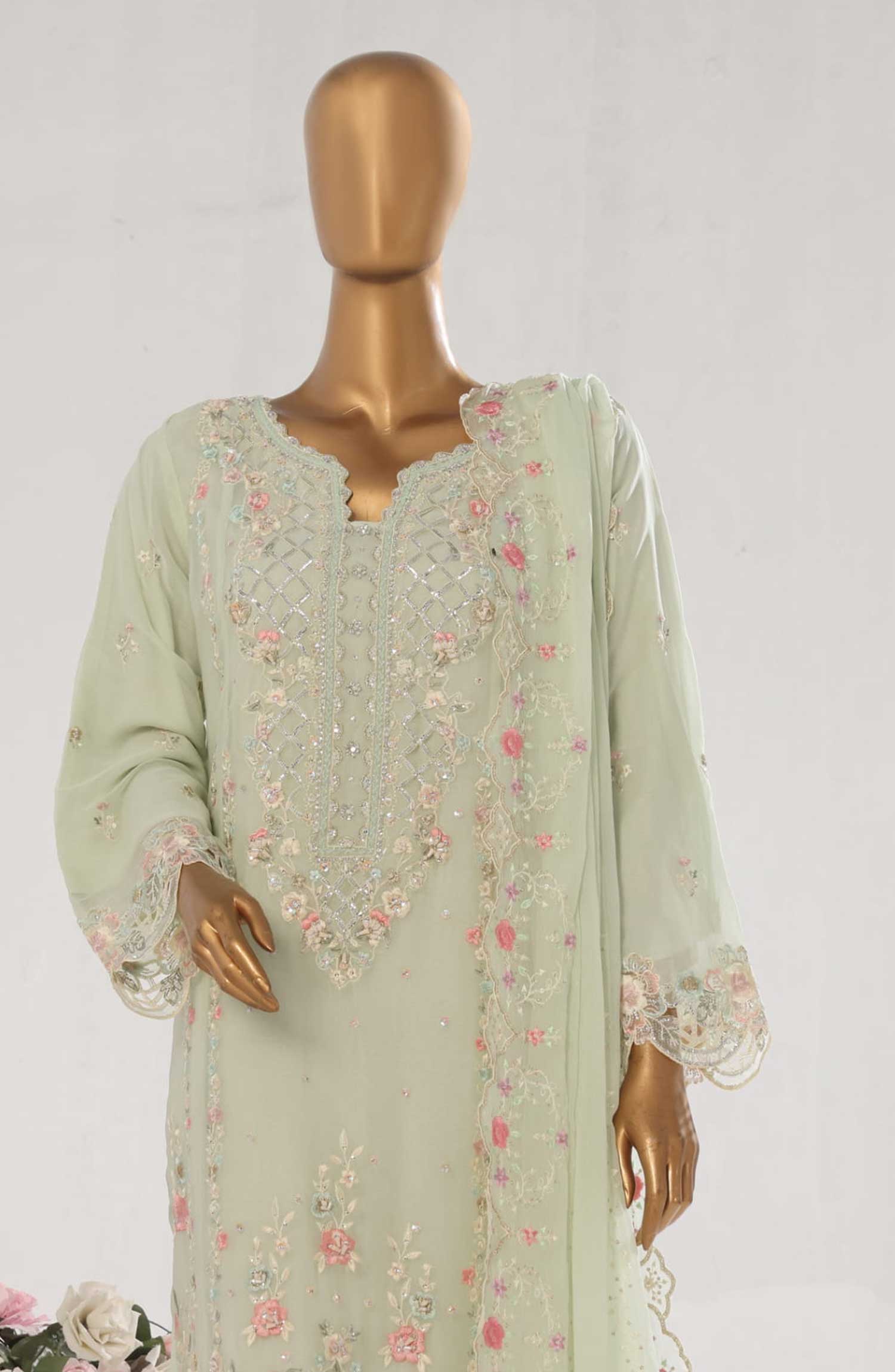 3 Piece Exclusive Stitched Full Embroidered Chiffon Suit with Full Embroidered Chiffon Dupatta .