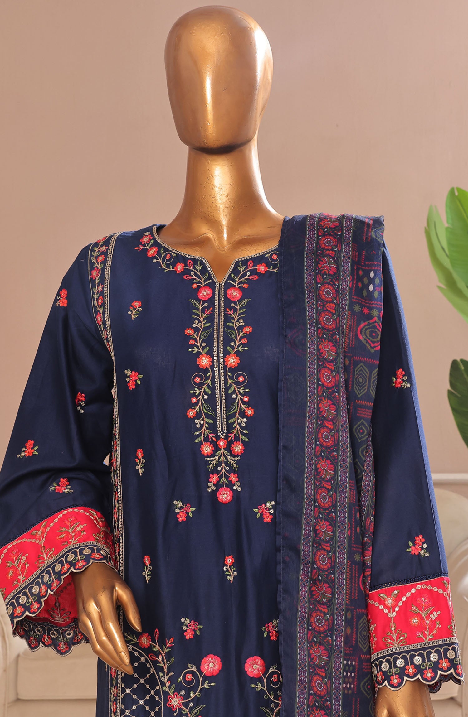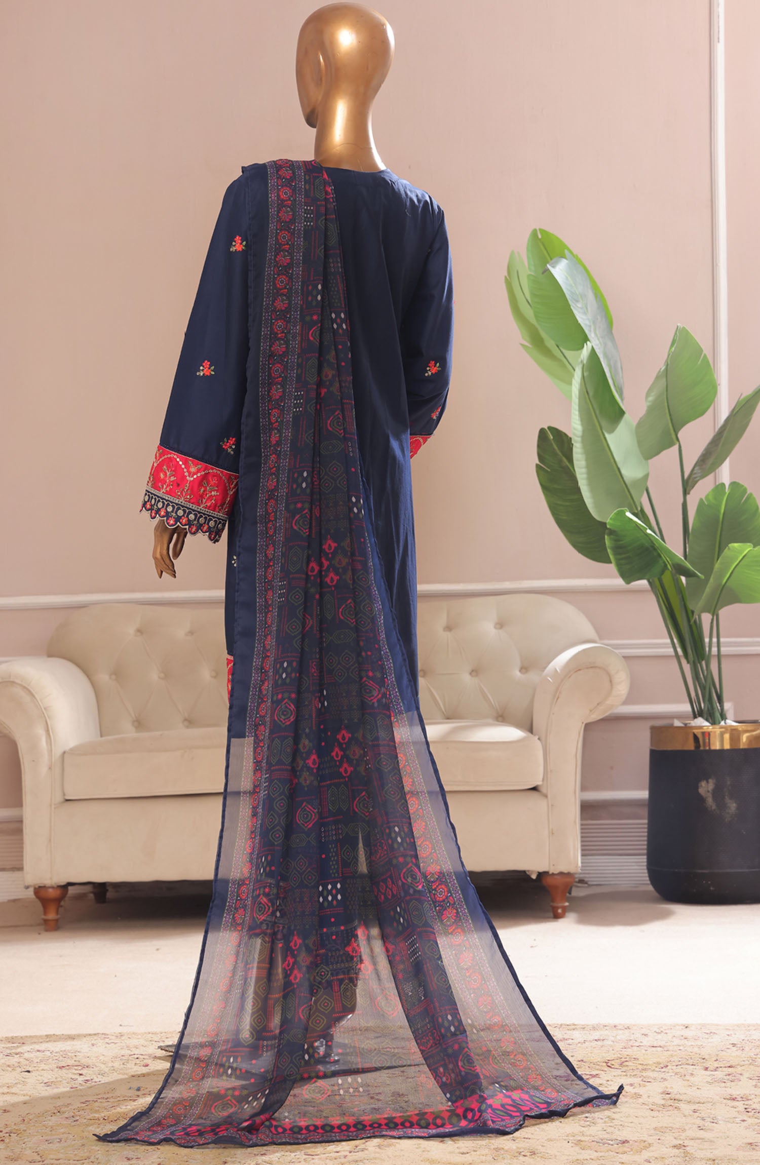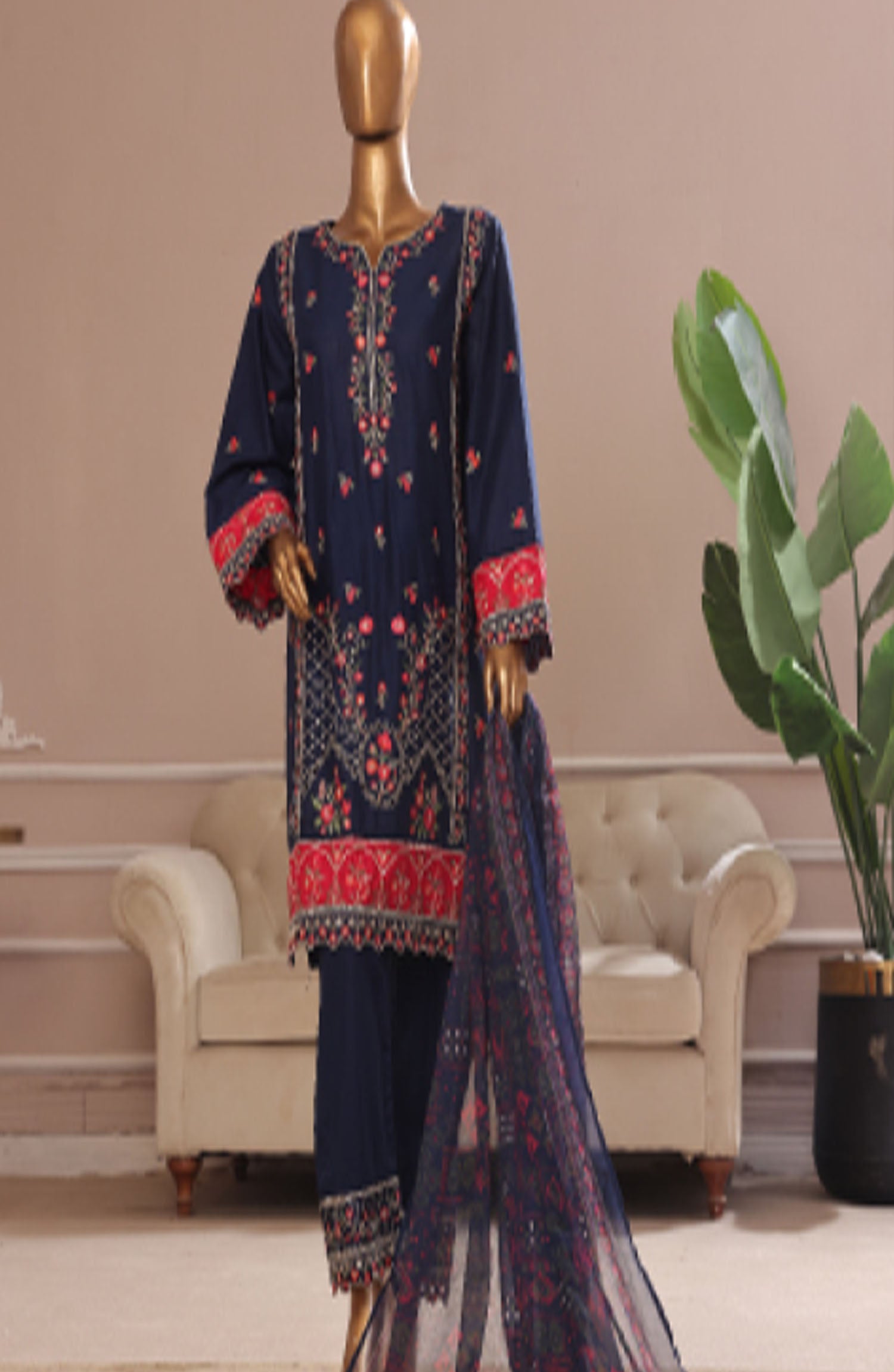 The standard style comes as a long-sleeved kameez with dupatta and trouser/shawlar.