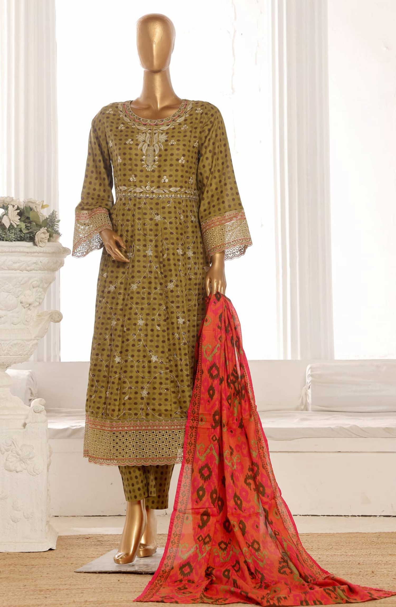 Home Bin Saeed Embroidered Lawn Frock Stitched 3 Piece - SM 618 - BS25LF - Green - Summer Collection