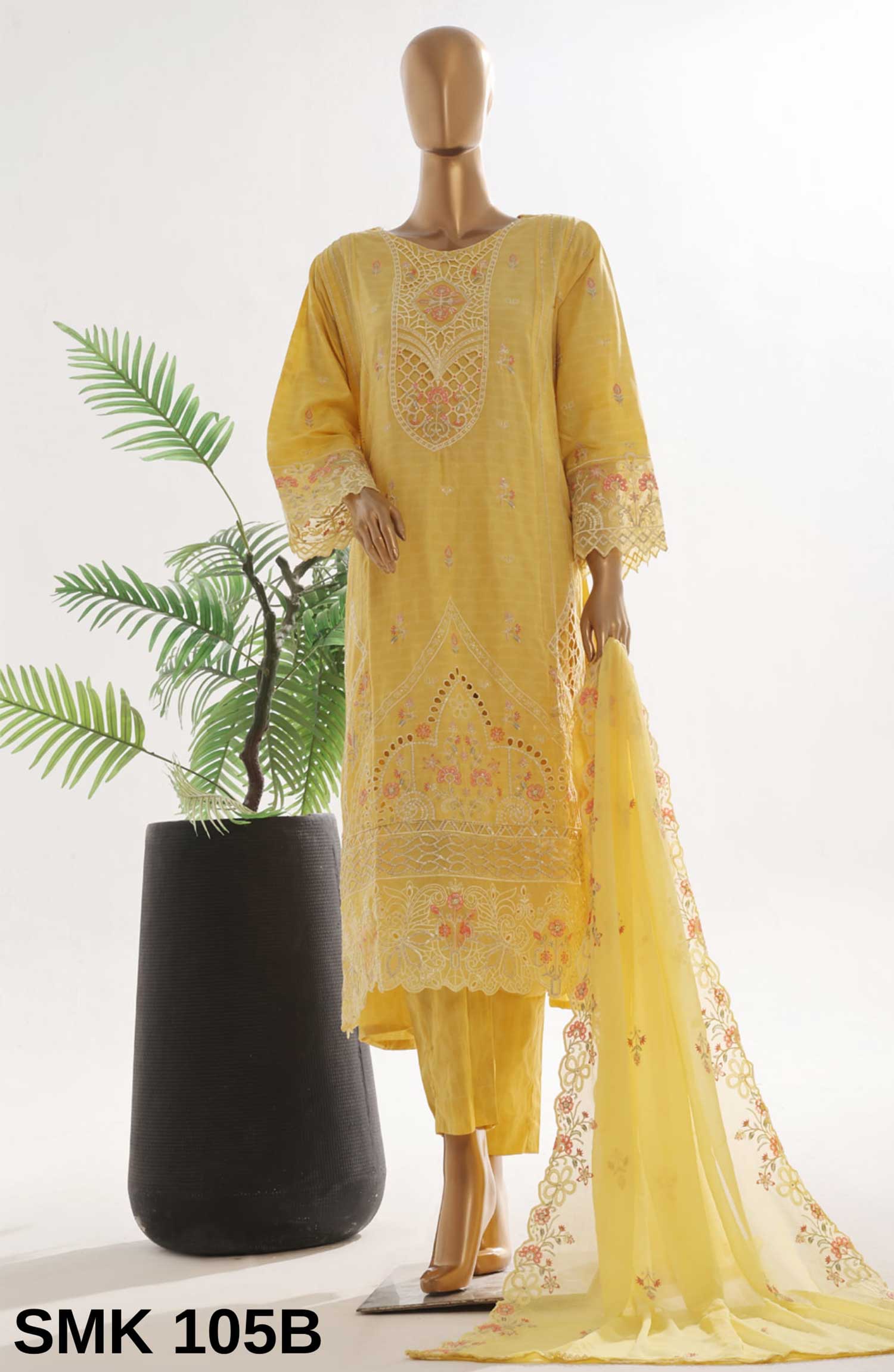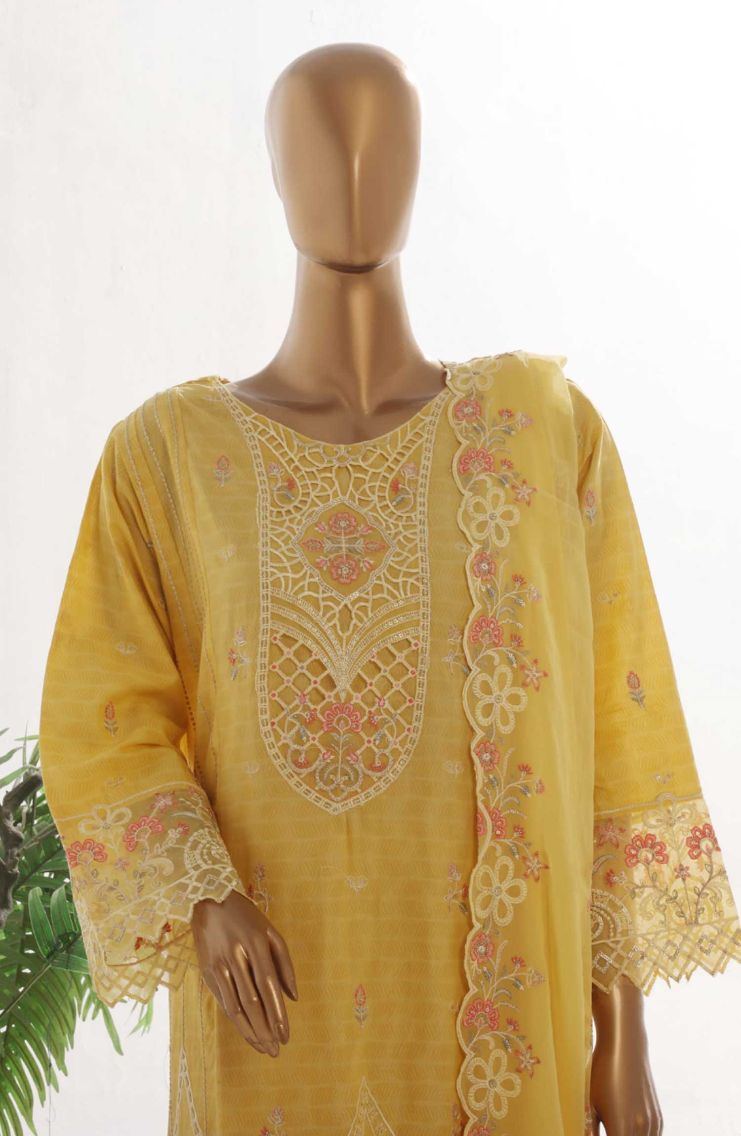 Home Bin Saeed Embroidered Lawn Stitched 3 Piece Frock - SMK 105B - BS25LF - Yellow - Summer Collection