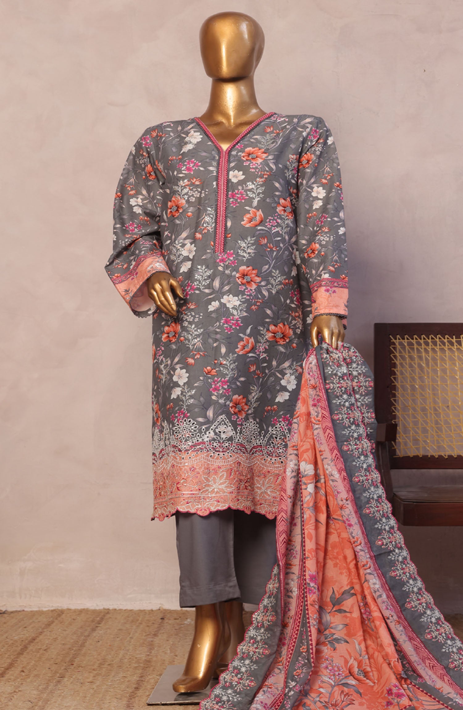 Home Bin Saeed Embroidered Lawn Stitched 3 Piece Suit - D-02 - BS25LELC - Grey - Summer Collection