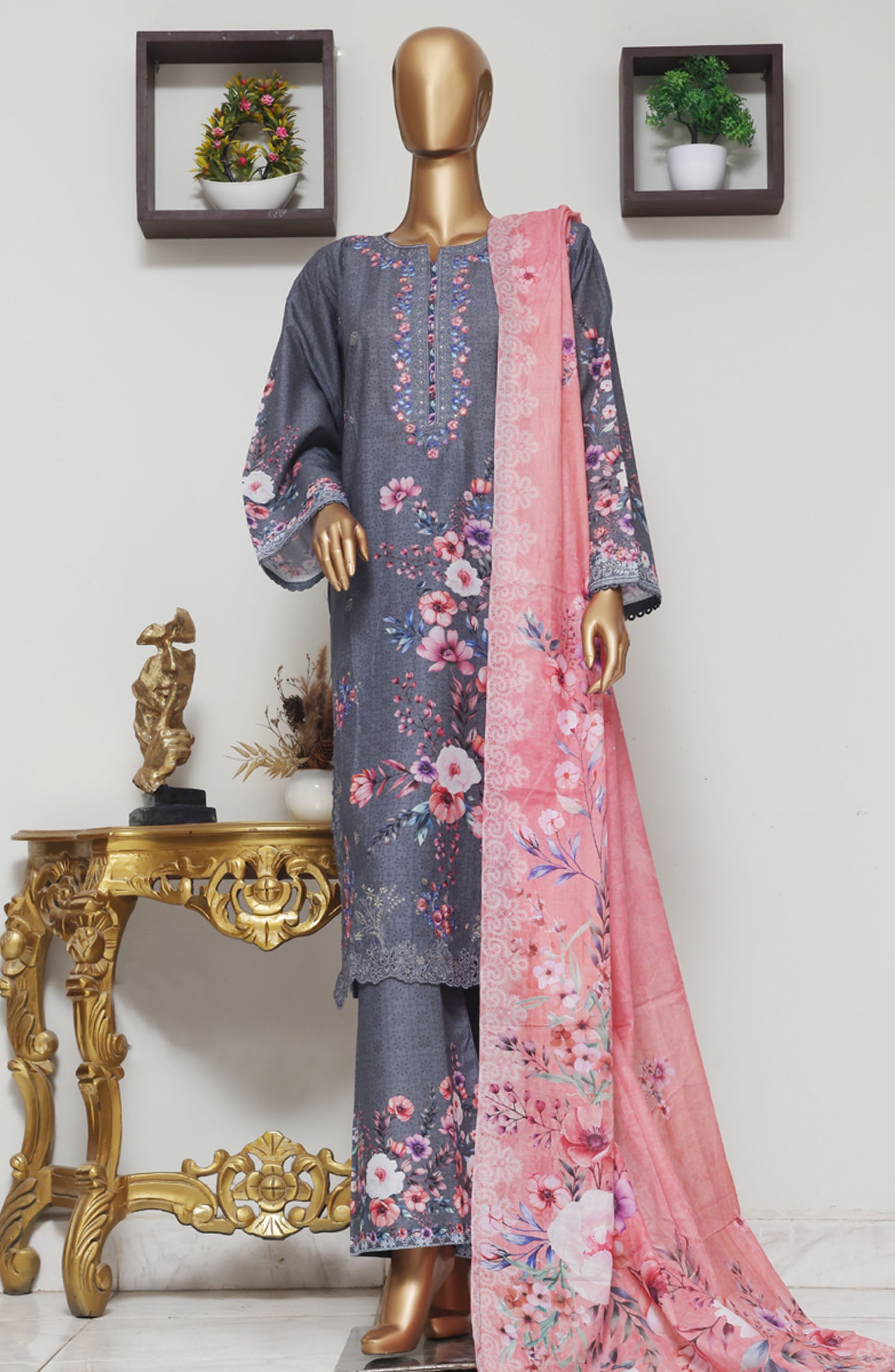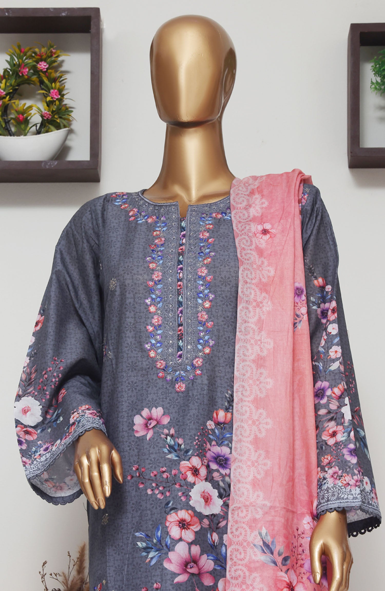 Home Bin Saeed Embroidered Lawn Stitched 3 Piece Suit - D-05 - BS25EELV9 - Grey - Summer Collection