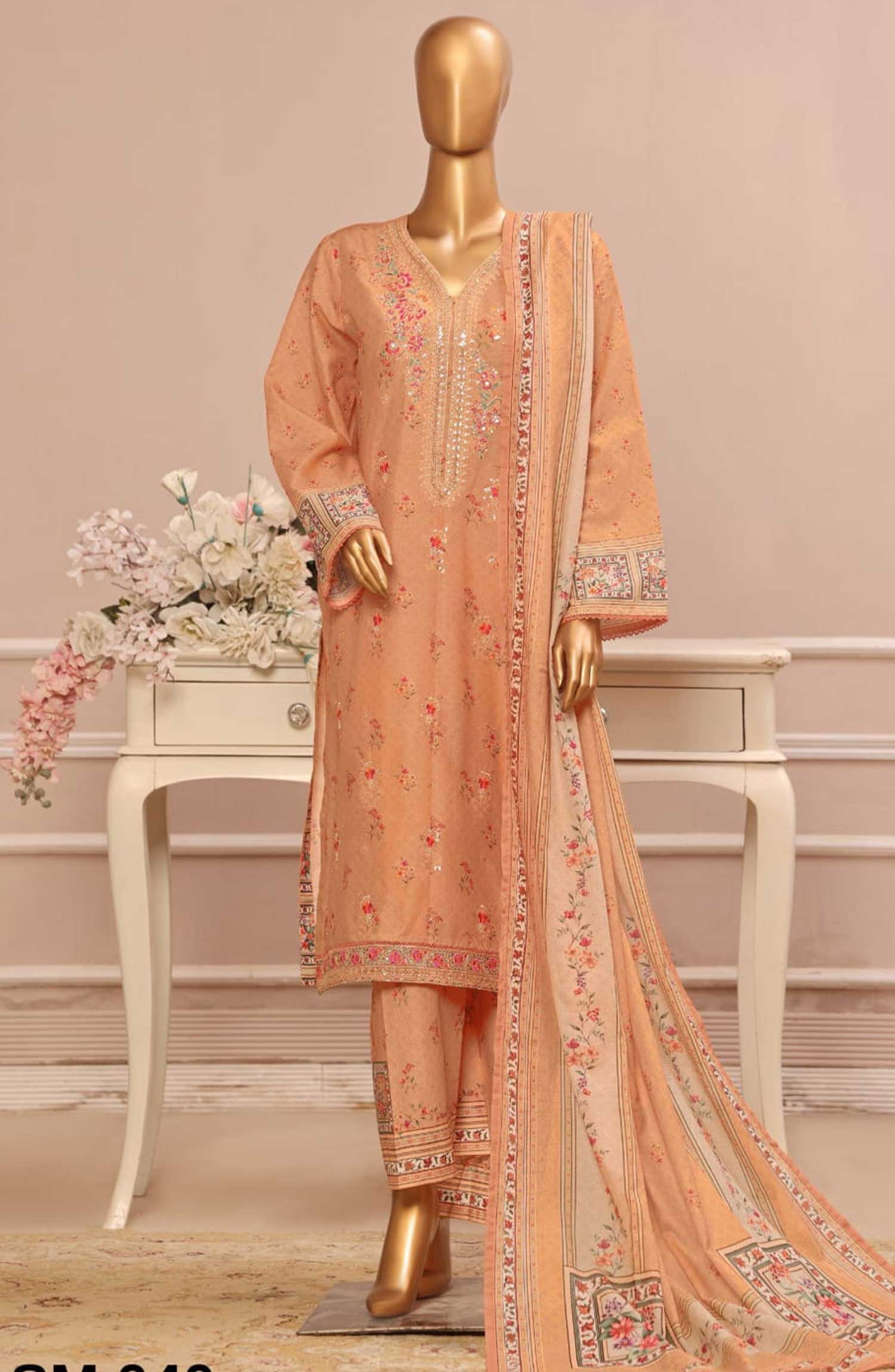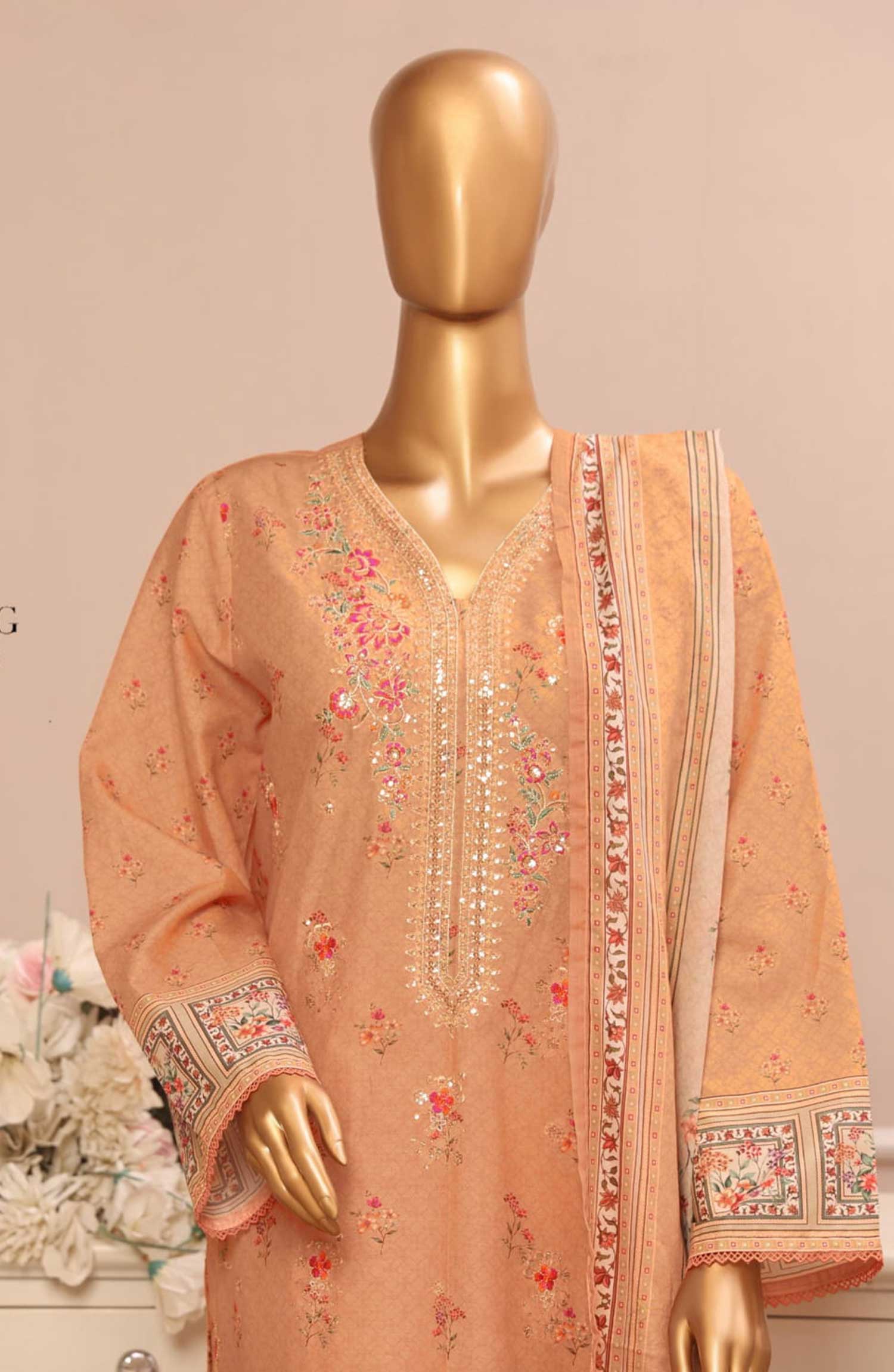 Home Bin Saeed Embroidered Lawn Stitched 3 Piece Suit - SM 040 - BS25EElV3 - Orange - Summer Collection