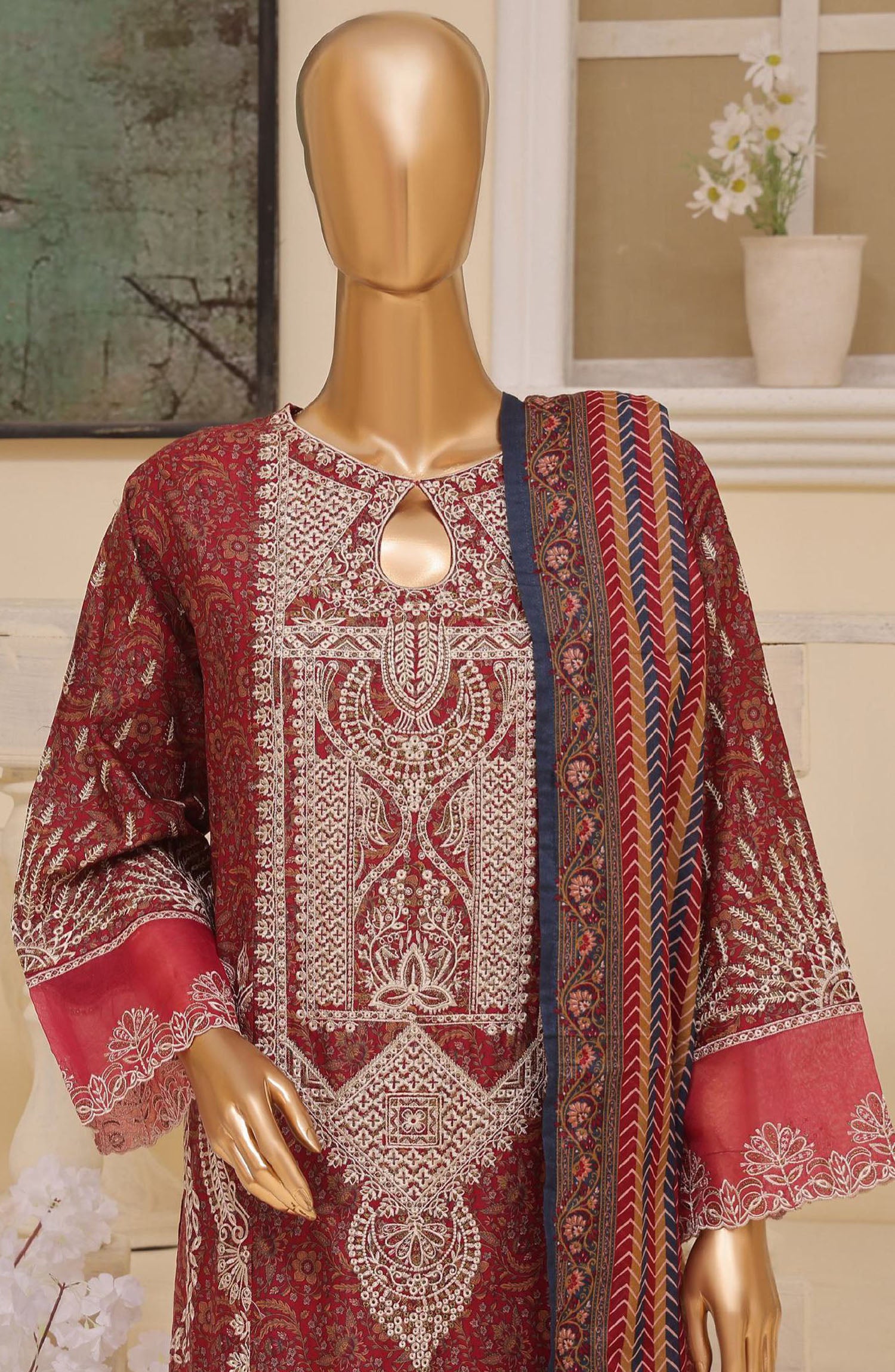 Home Bin Saeed Embroidered Lawn Stitched 3 Piece Suit - SM-614 - BS25ELCV4 - Red - Summer Collection