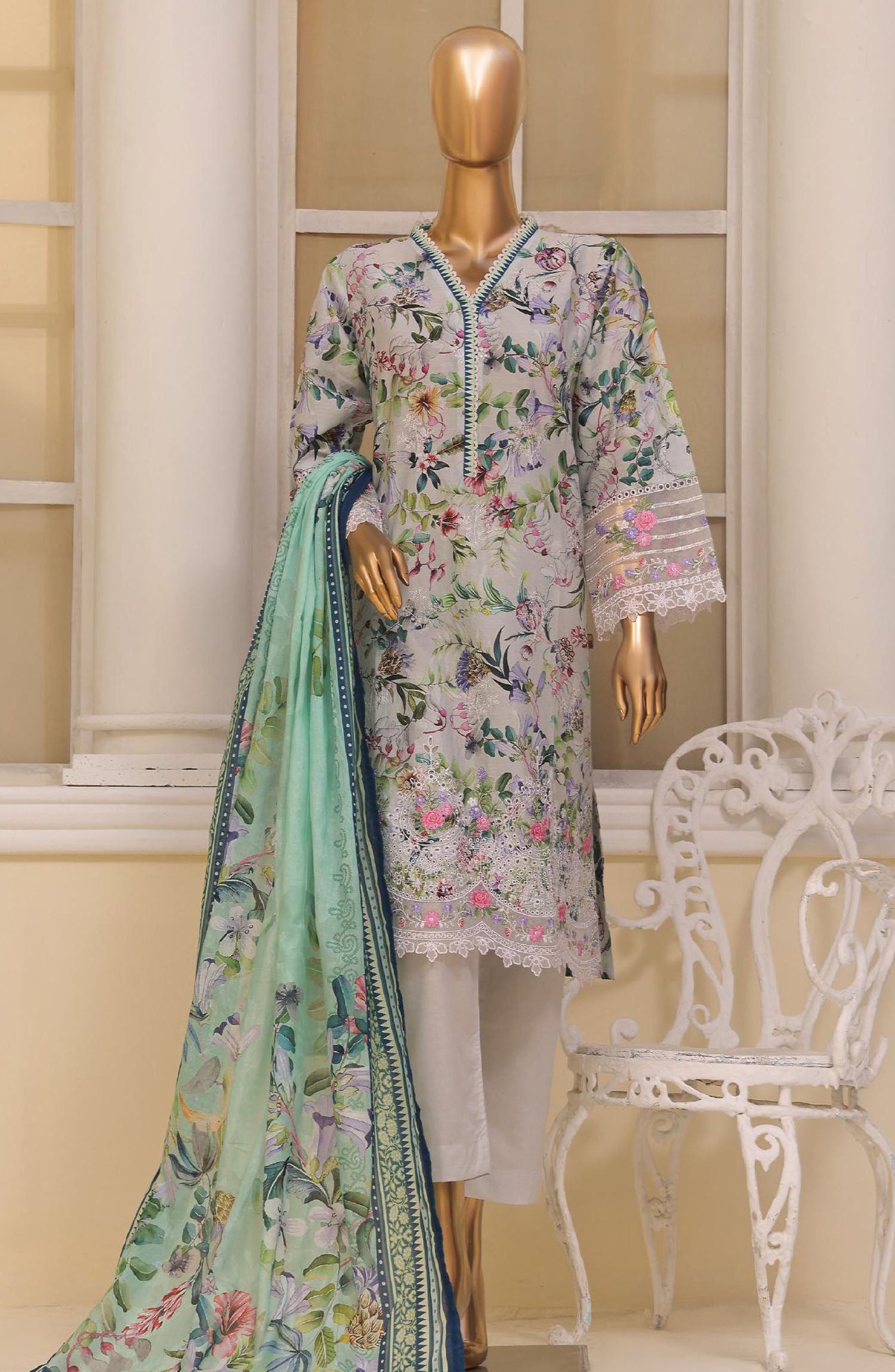 Home Bin Saeed Embroidered Lawn Stitched 3 Piece Suit - SM-747 - BS25ELCV4 - Off White - Summer Collection