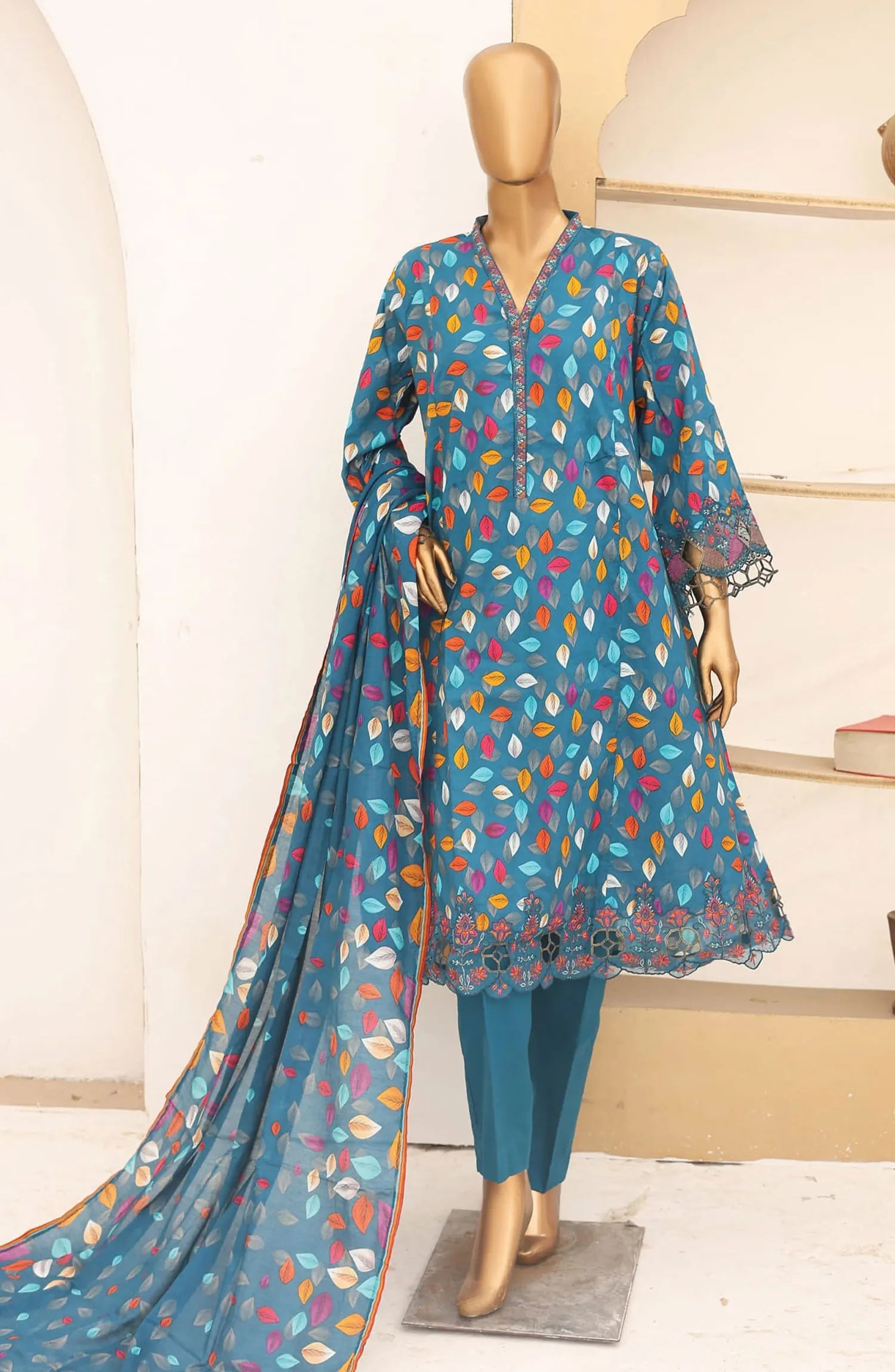 The standard style comes as a long-sleeved kameez with dupatta and trouser/shawlar.