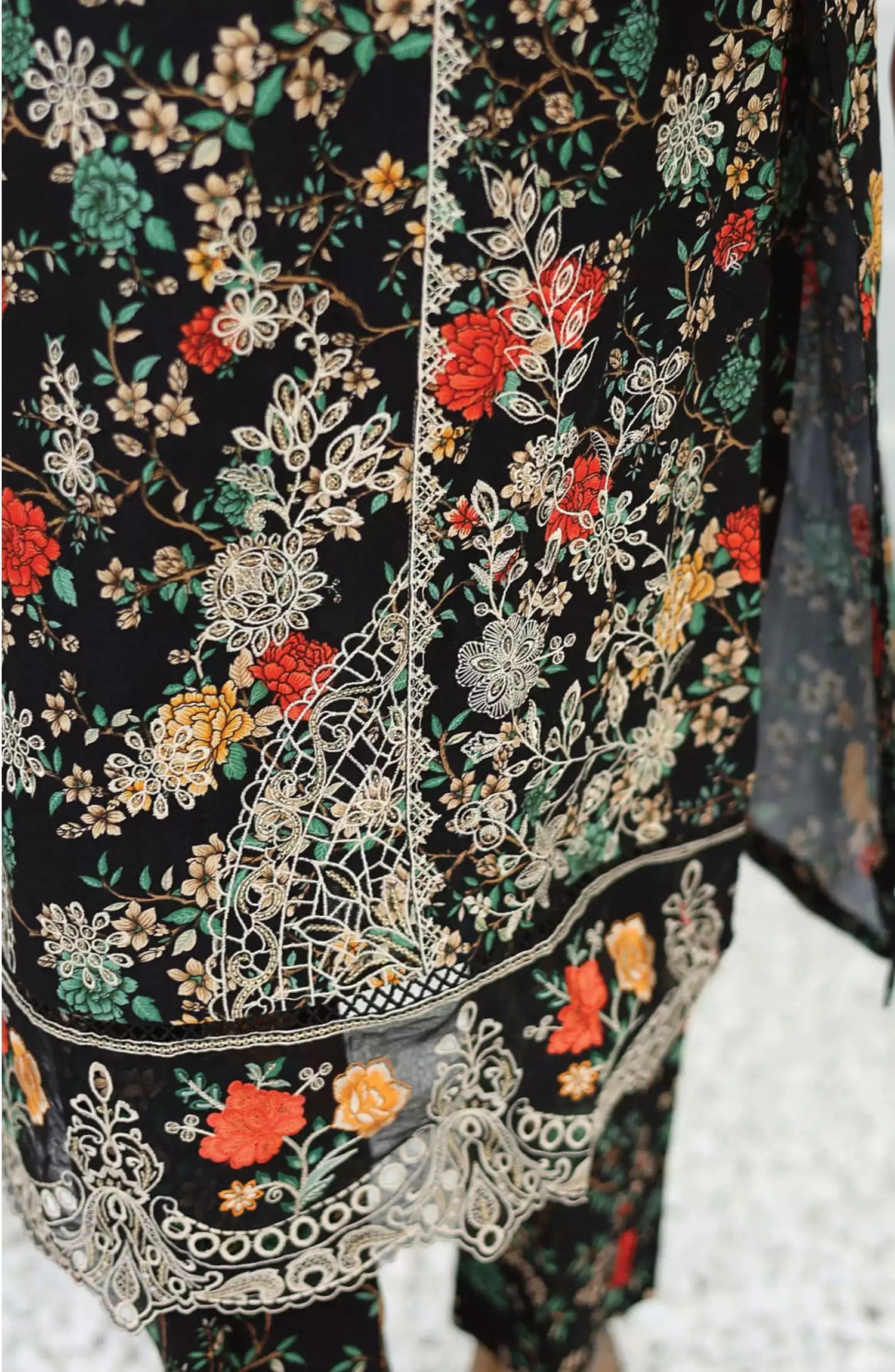 Embroidered Chikankari Khaddar Shirt with Printed Dupatta and Trouser .