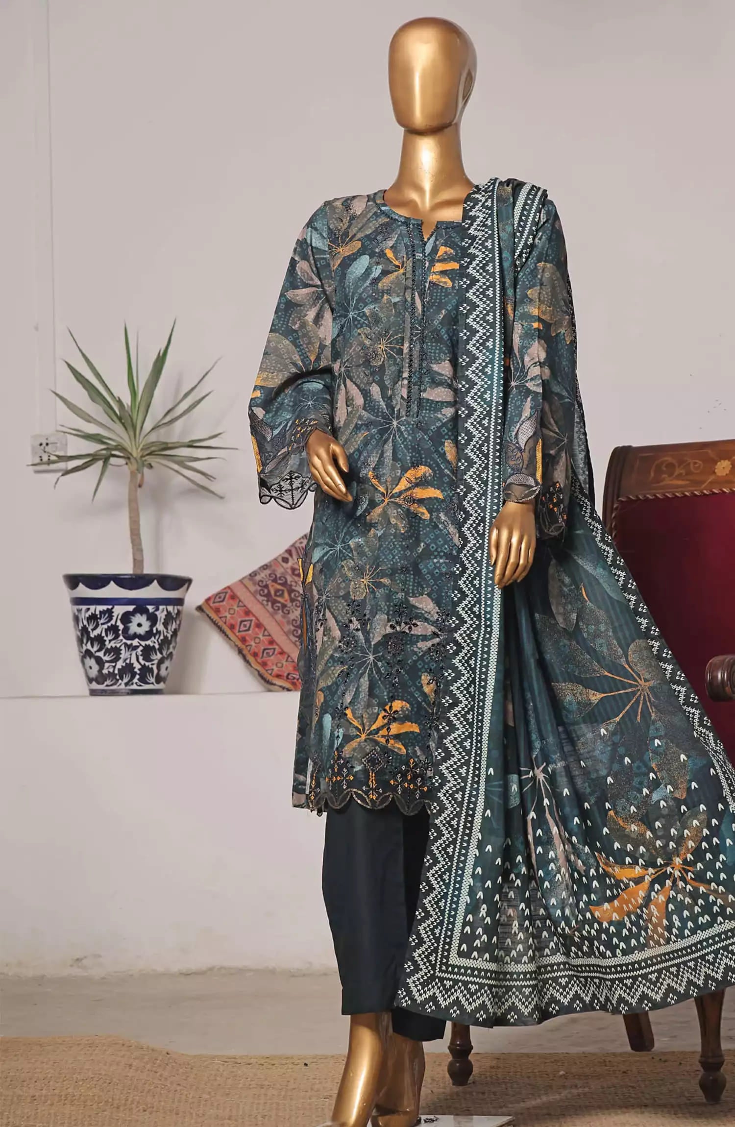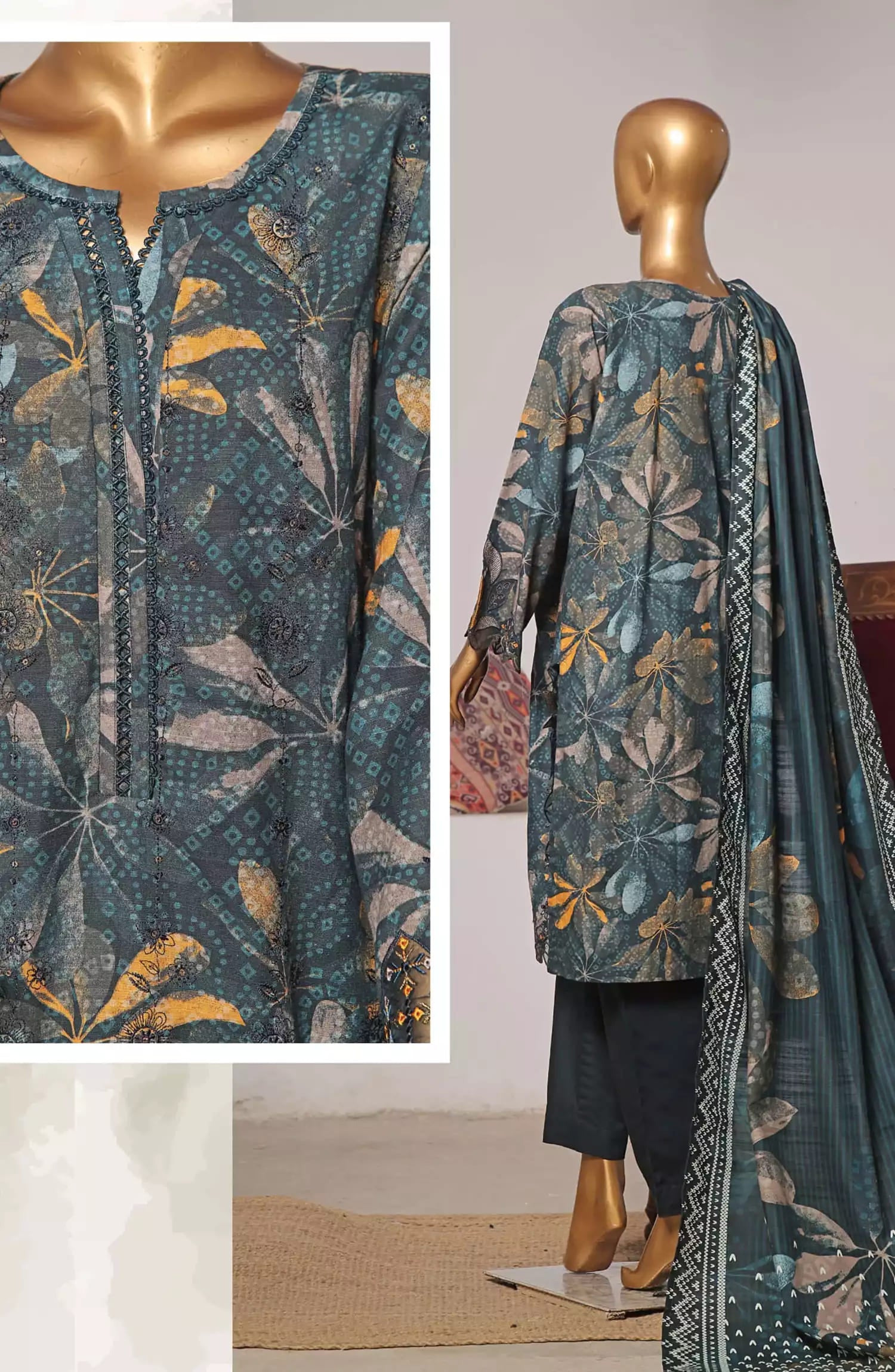 Bin Saeed Exclusive RTW Chikankari Embroidered Khaddar Collection Vol 05 has been styled in the image for photography and illustrative purposes.