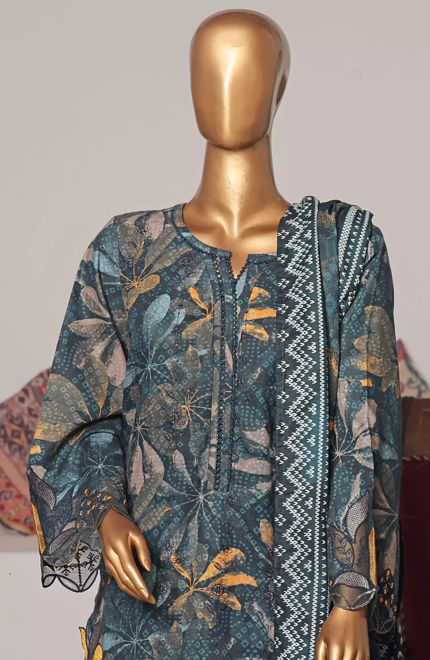 The standard style comes as a long-sleeved kameez with dupatta and trouser/shawlar.