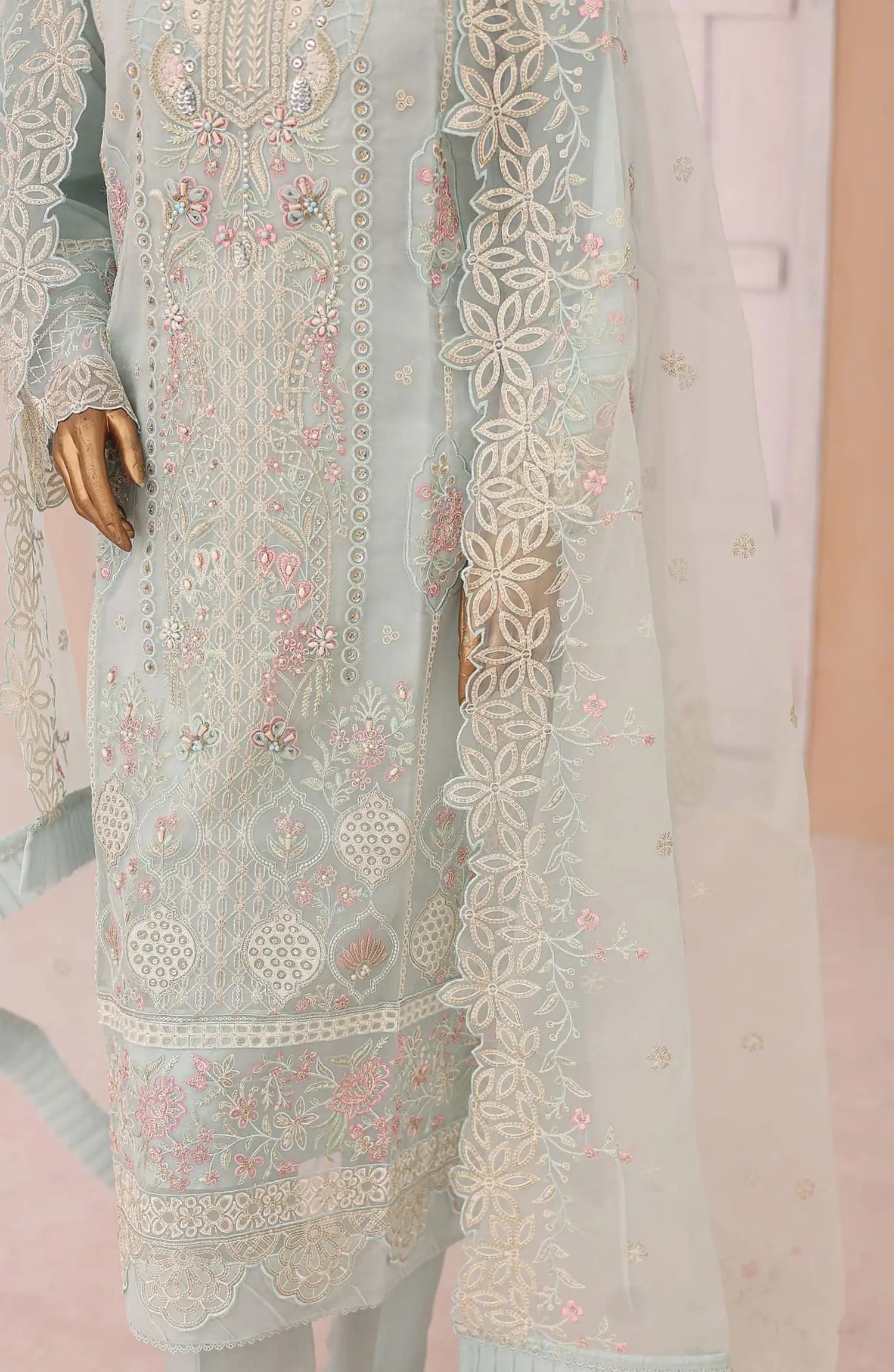 3 Piece Stitched Luxury Embroidered Organza Suit .