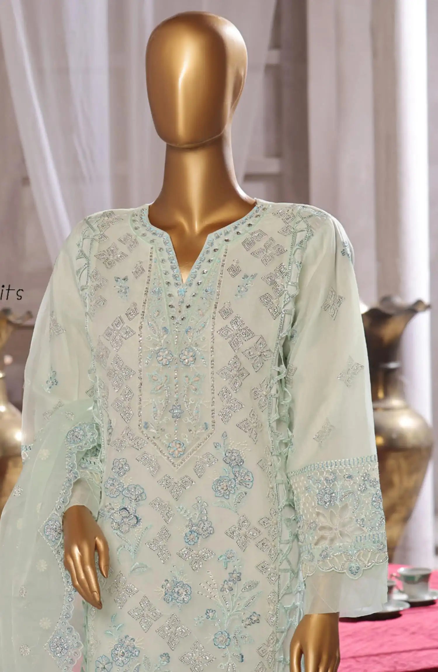 3 Piece Stitched Full Organza Embroidered Shirt with Embroidered Dupatta and Trouser .
