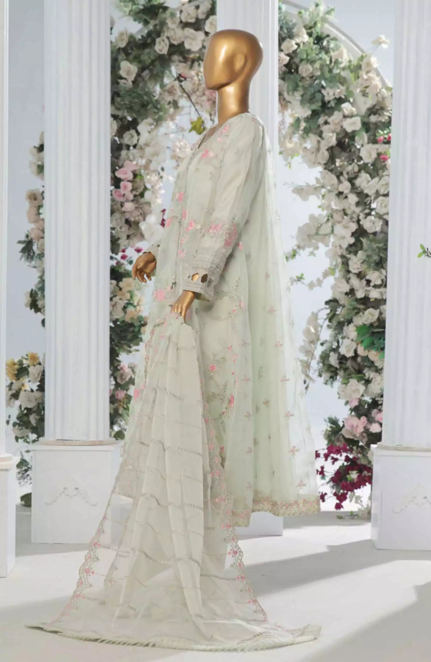 3 Piece Stitched Full Organza Embroidered Shirt with Embroidered Dupatta and Trouser .