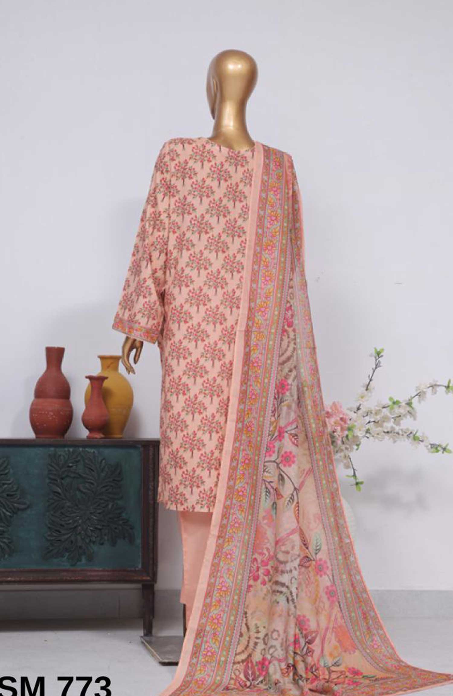 Home Bin Saeed Printed Lawn Stitched 3 Piece - SM-773 - BS25EL - Tea Pink - Summer Collection