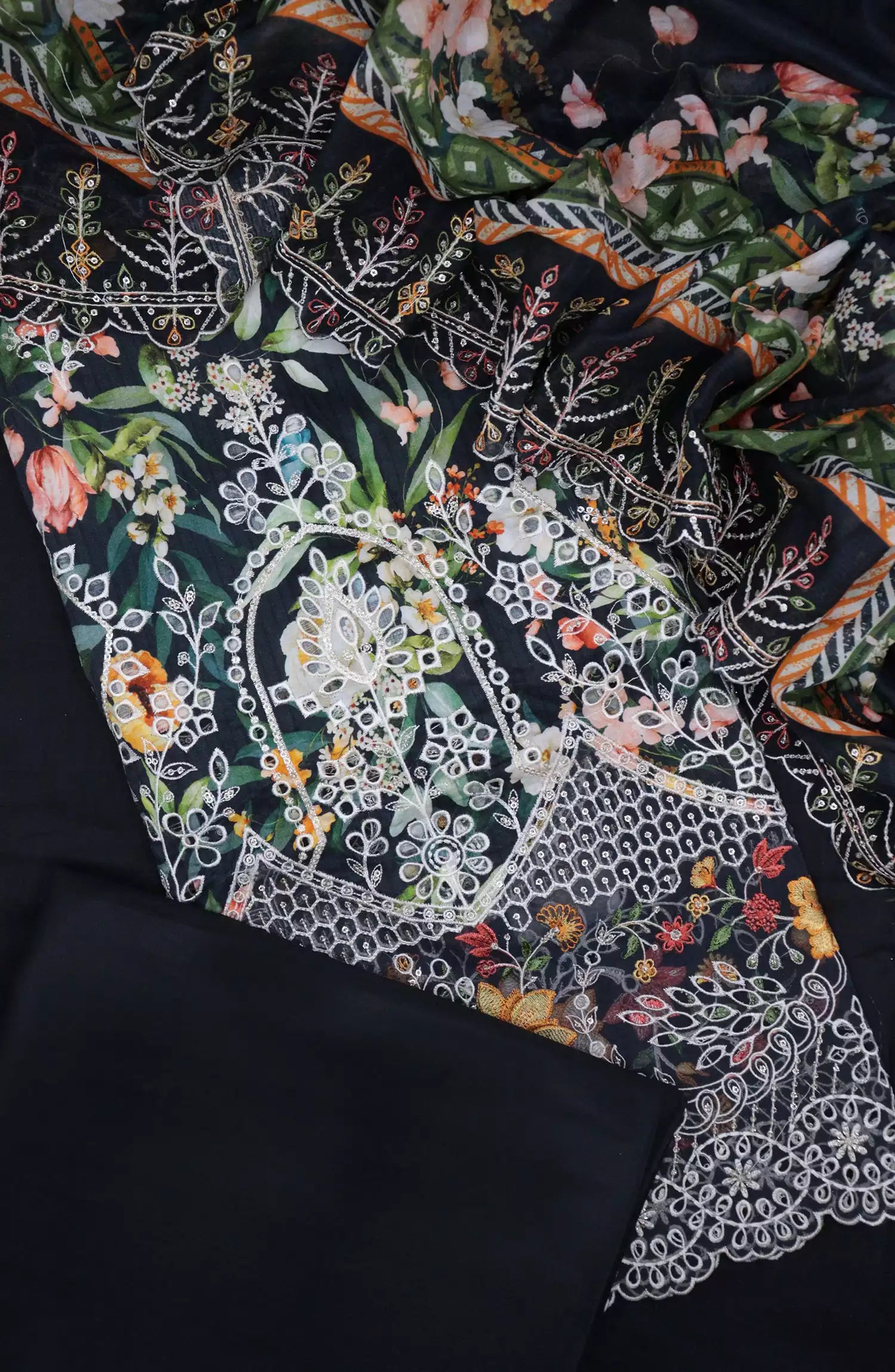 Bin Saeed Unstitch Cotton Embroidered Collection has been styled in the image for photography and illustrative purposes.