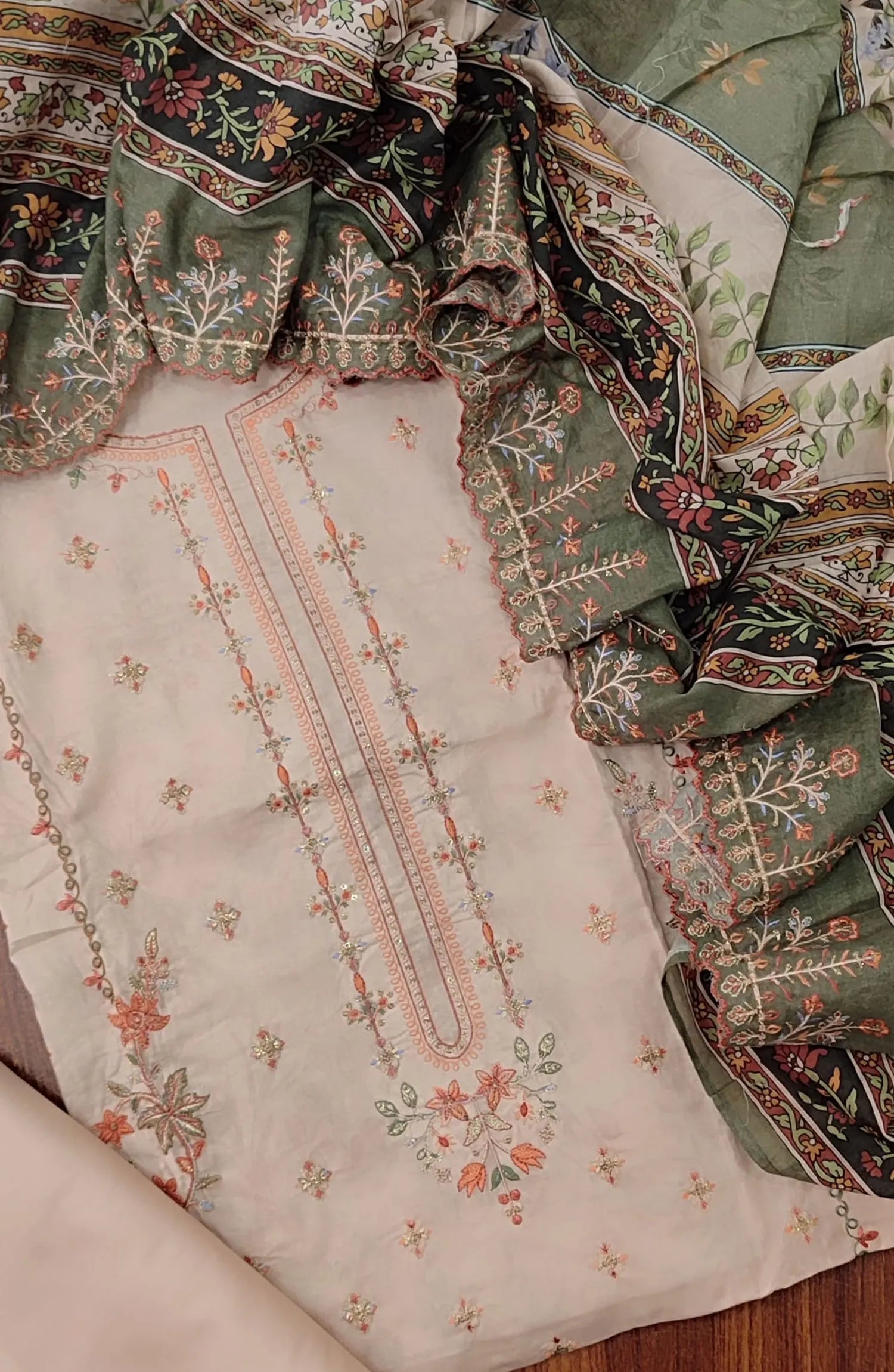 3 Piece Unstitched Embroidered Cambric Cotton Suit .