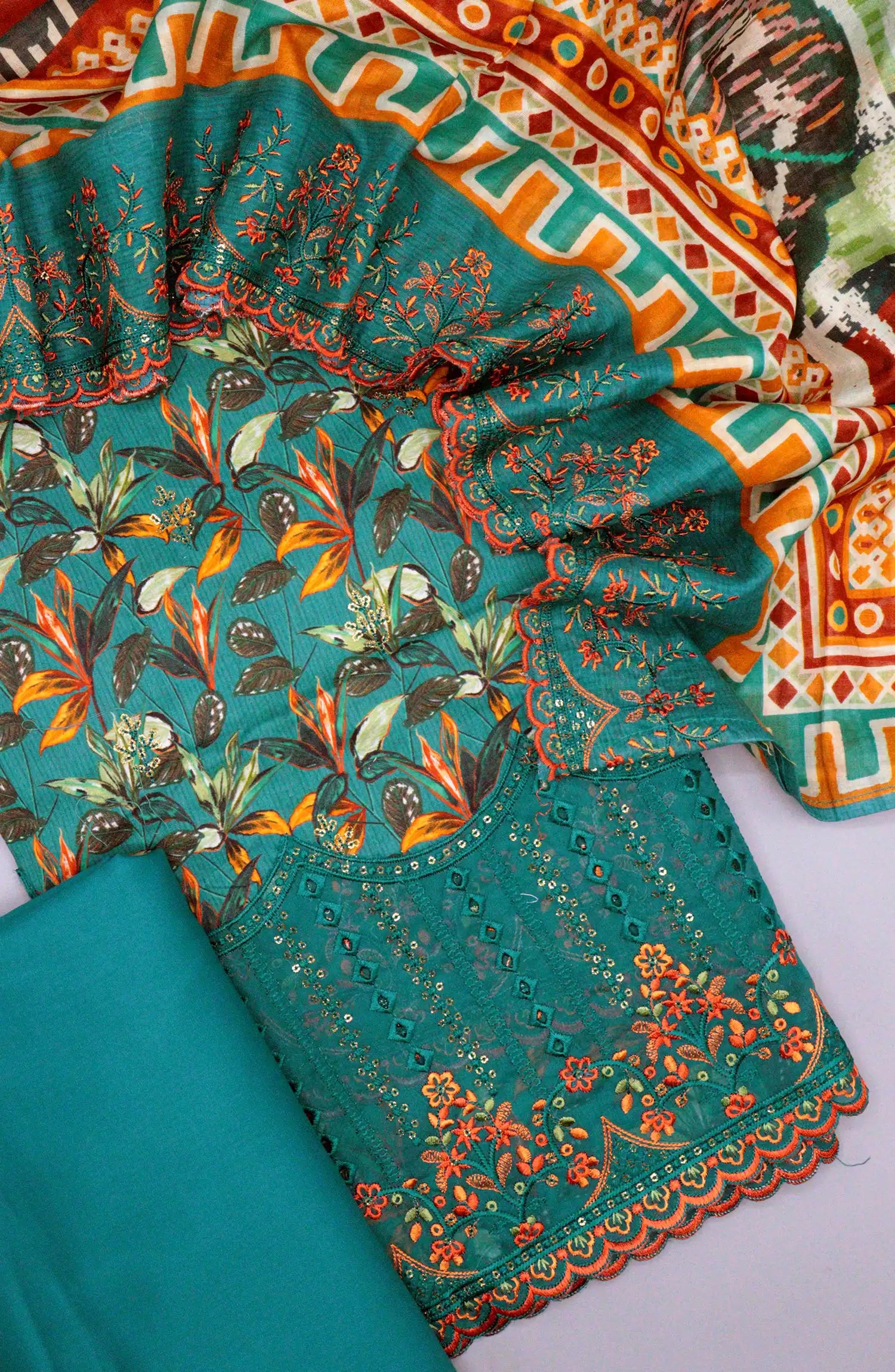 3 Piece Unstitched Printed and Embroidered Cotton Suit.
