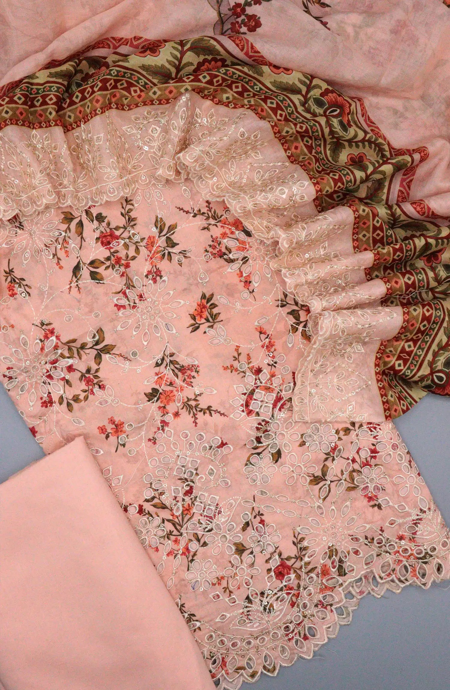 3 Piece Unstitched Printed and Embroidered Cotton Suit.