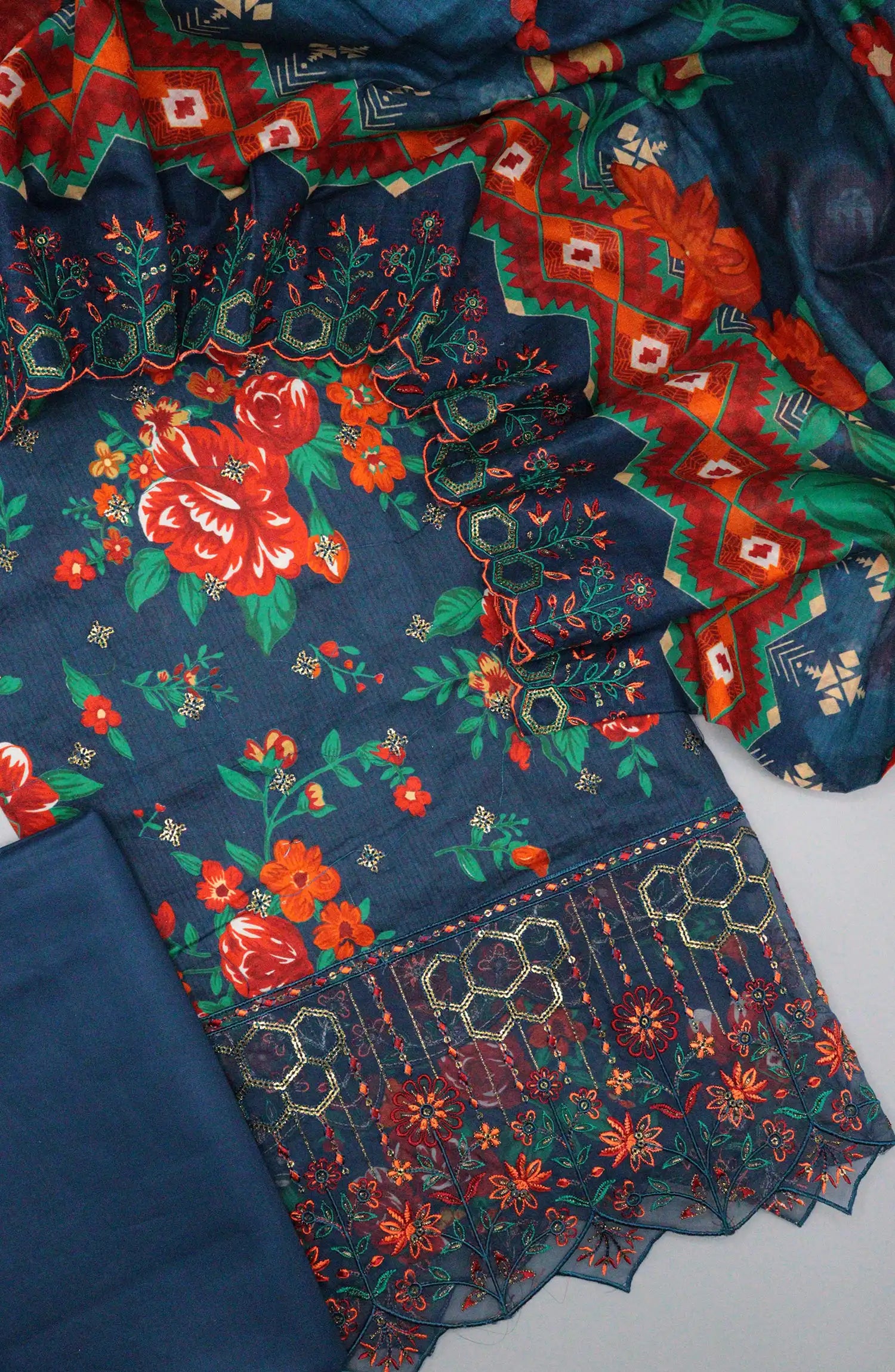 3 Piece Unstitched Printed and Embroidered Cotton Suit.
