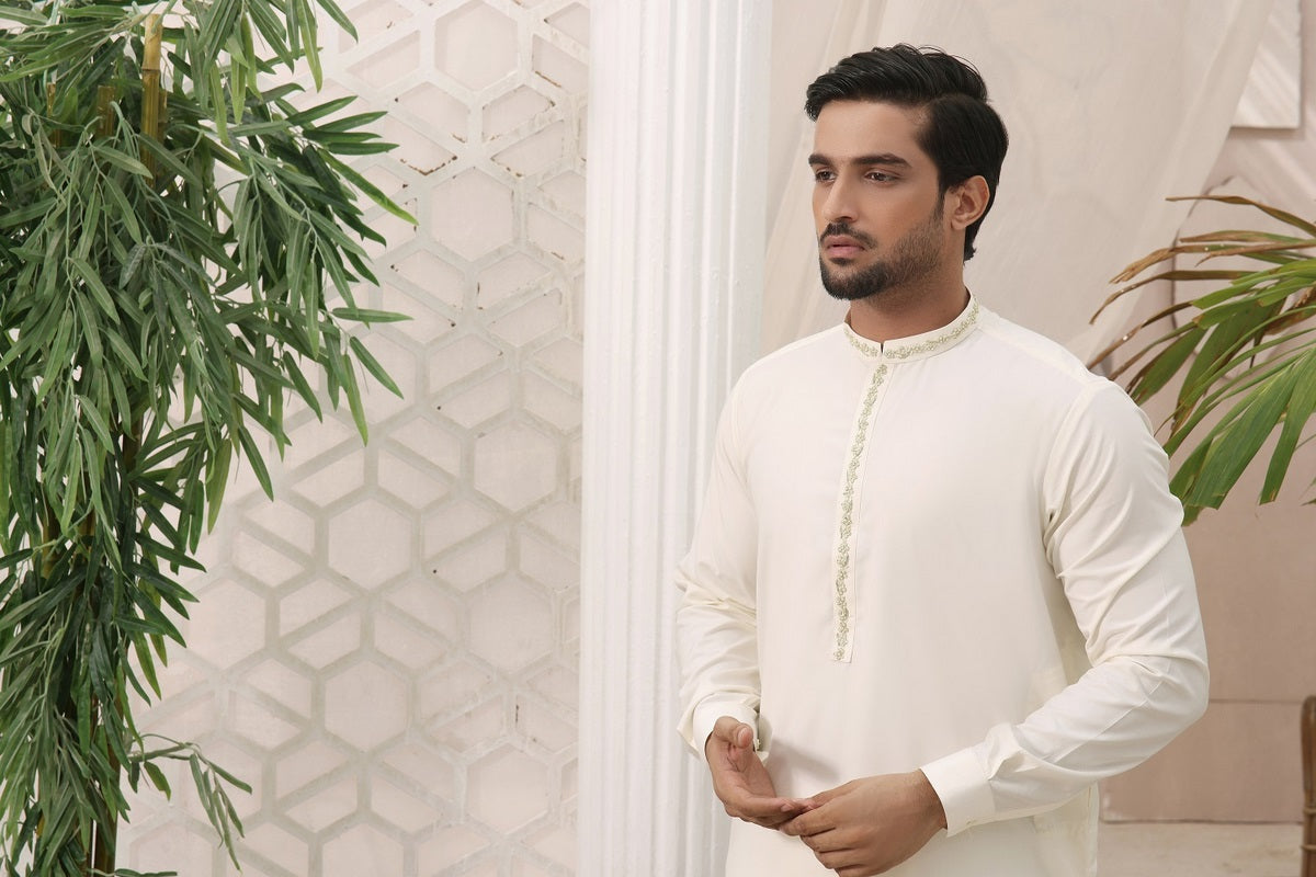 Men's Formal Kameez Shalwar with Hand Embroidery on Collar and Front