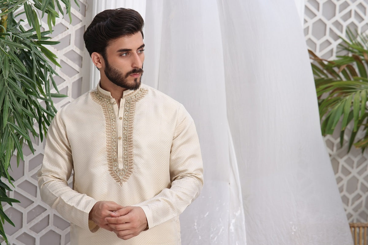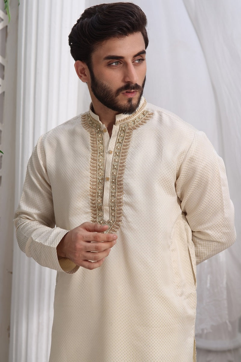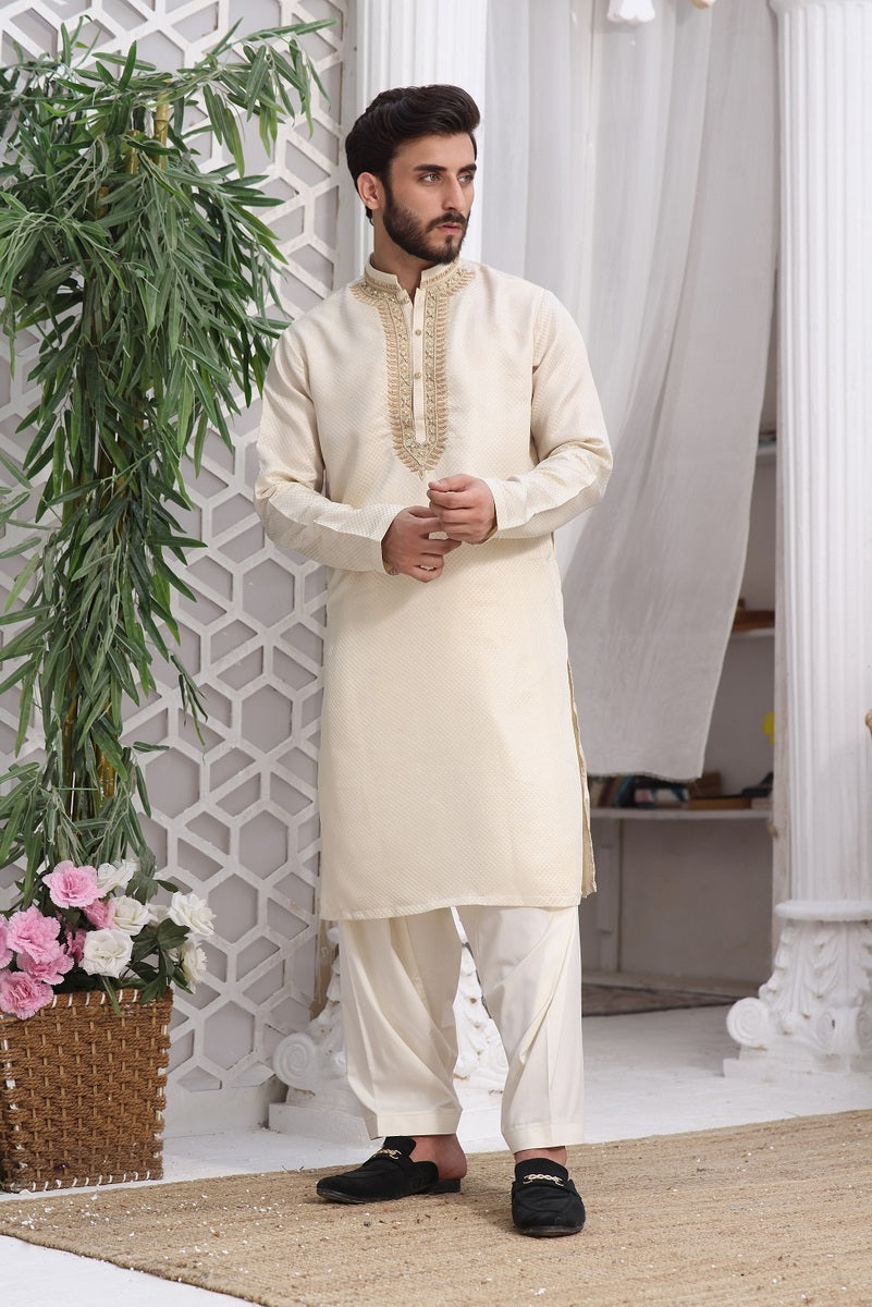 Men's Formal Kurta Shalwar with Hand Embroidery on Collar and Front