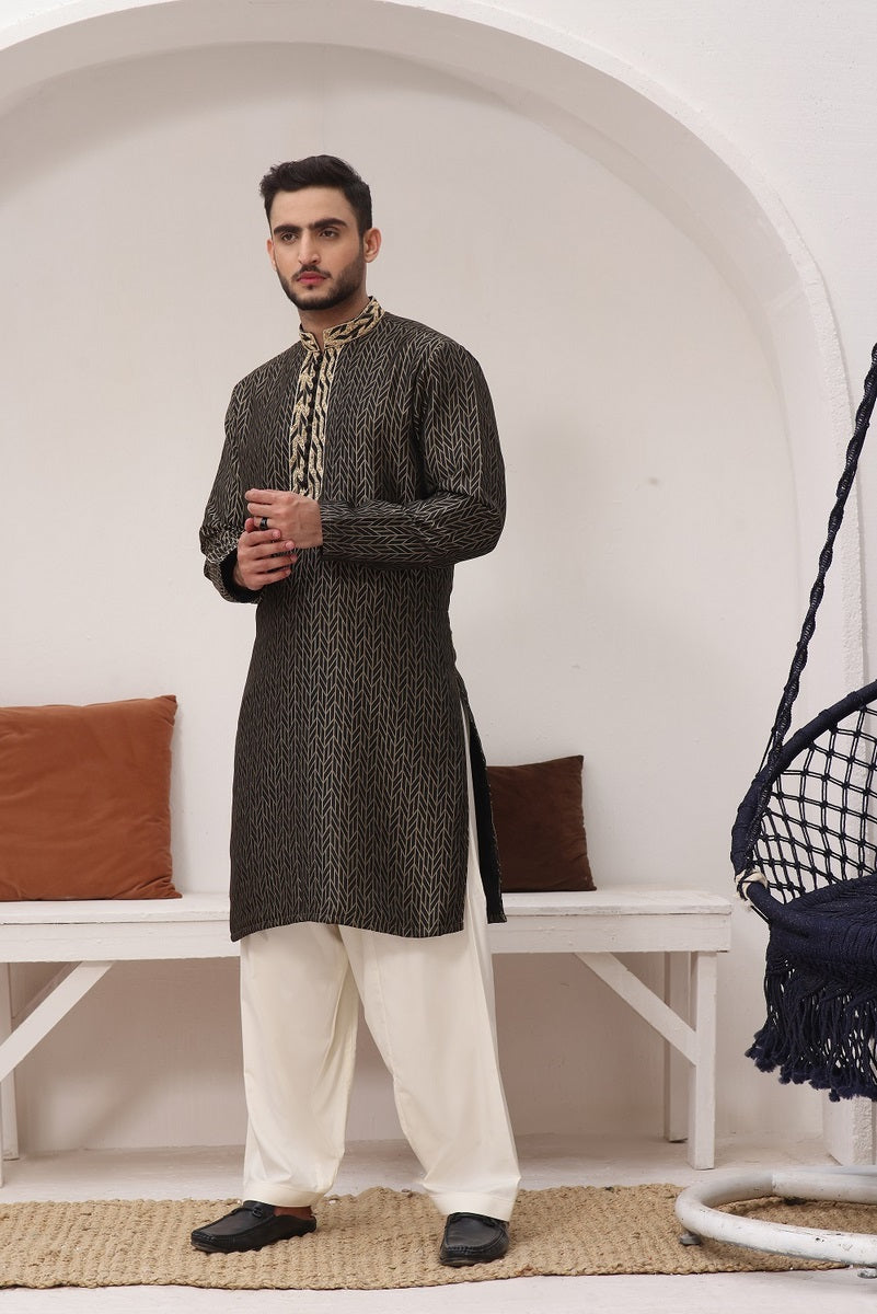 Men's Formal Kurta Shalwar on Self Texture with Hand Embroidery on Collar and Front