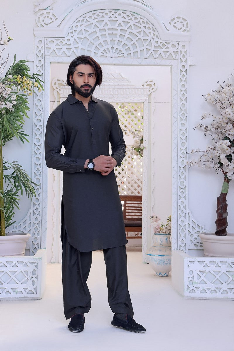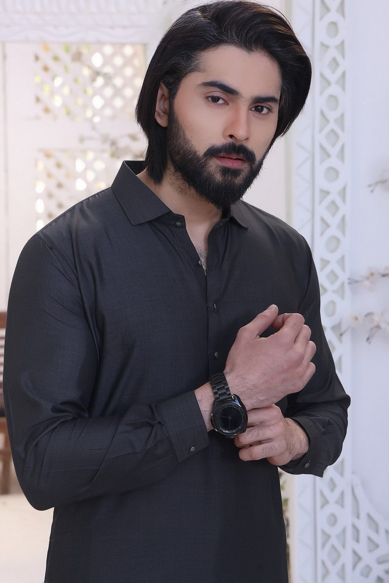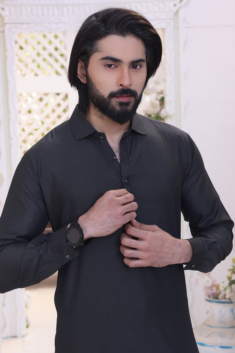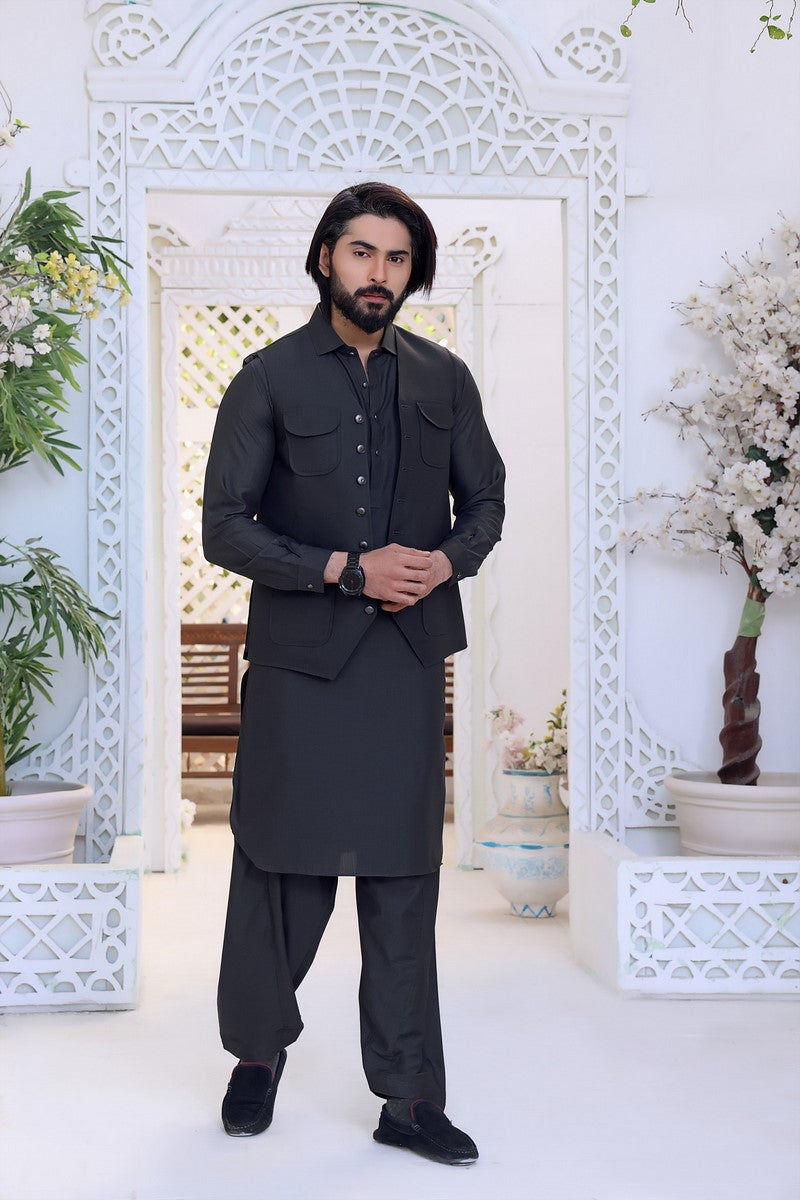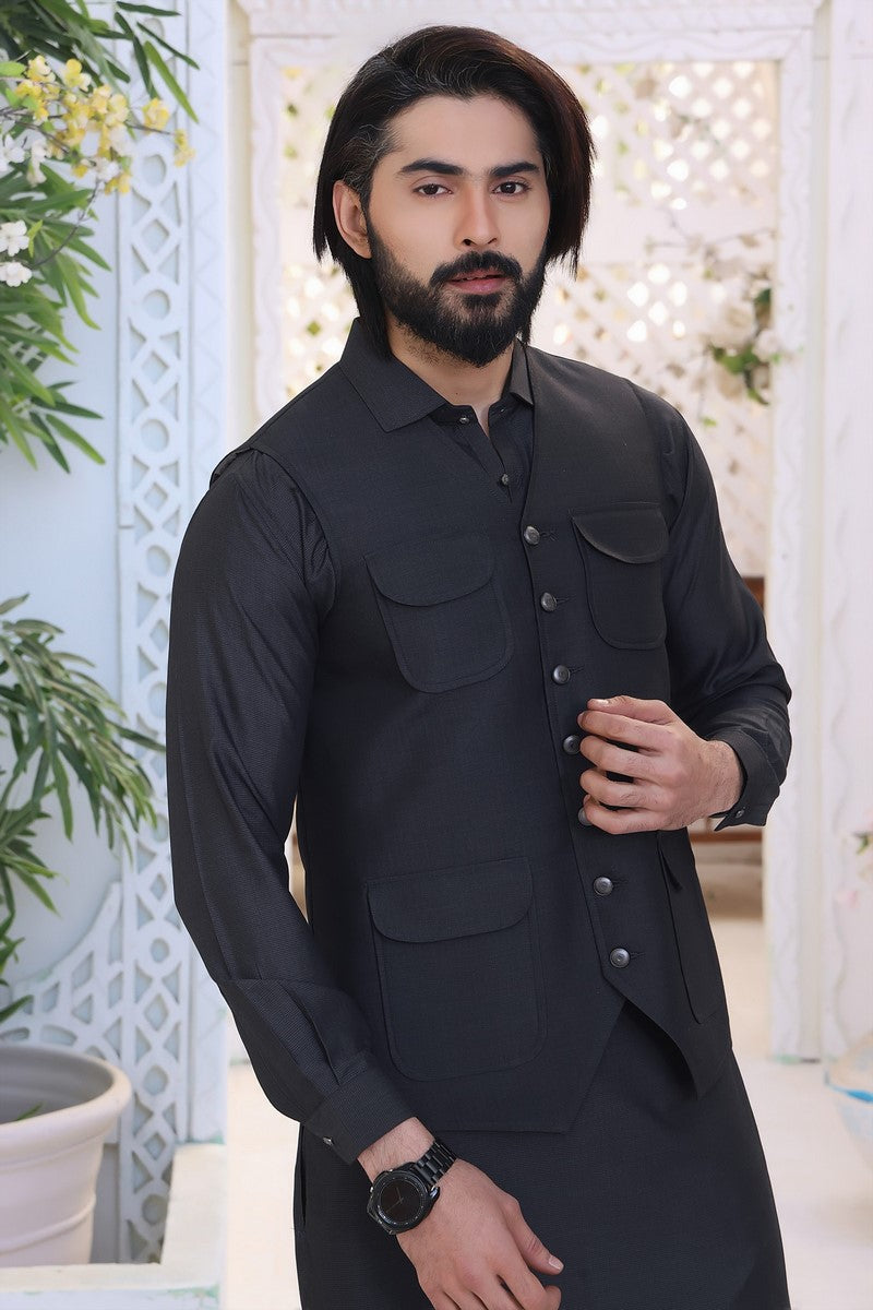 Men's Formal Double Pocket Waistcoat on Suiting Fabric with Plain Blended Shirt Collar Kameez Shalwar with Cuff Sleeves