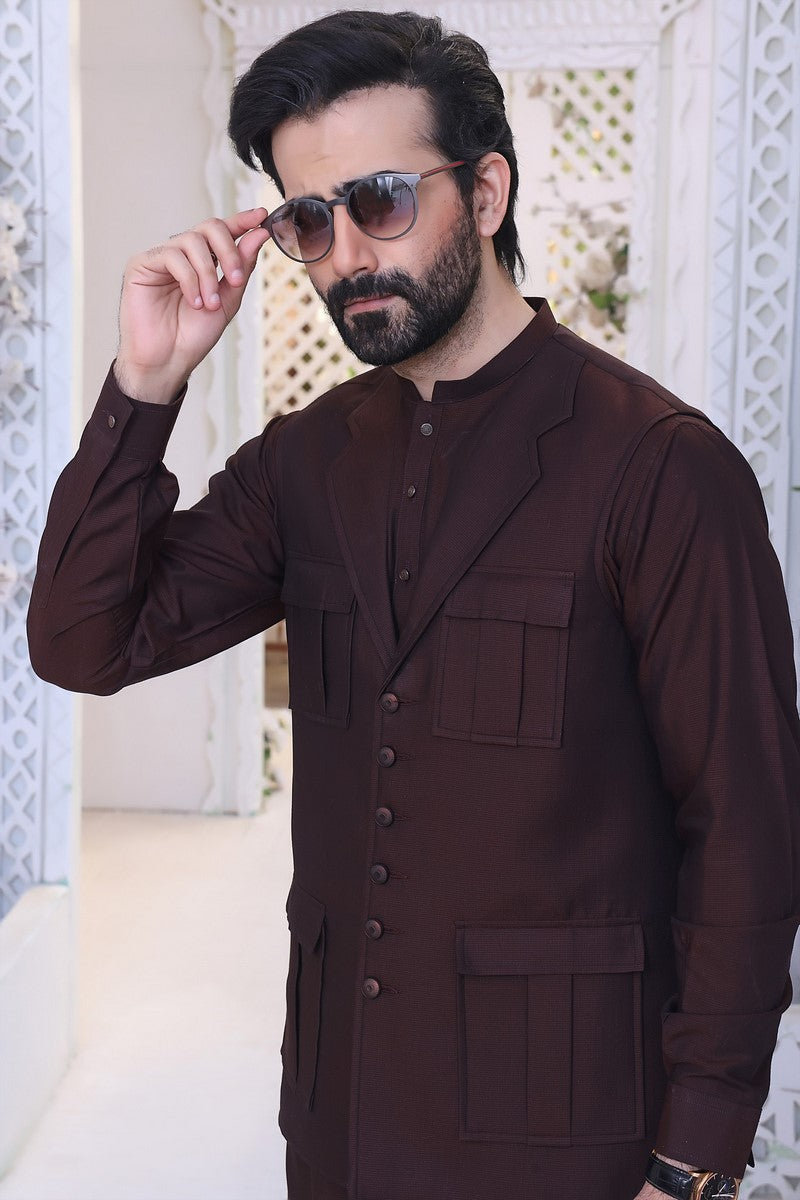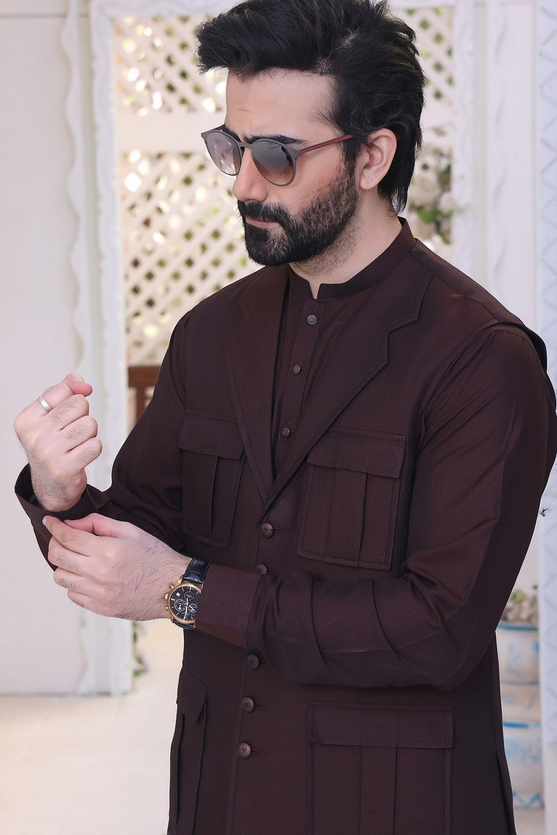 Men's Formal Four Pocket Waistcoat on Suiting Fabric with Plain Blended Band Collar Kameez Shalwar with Cuff Sleeves