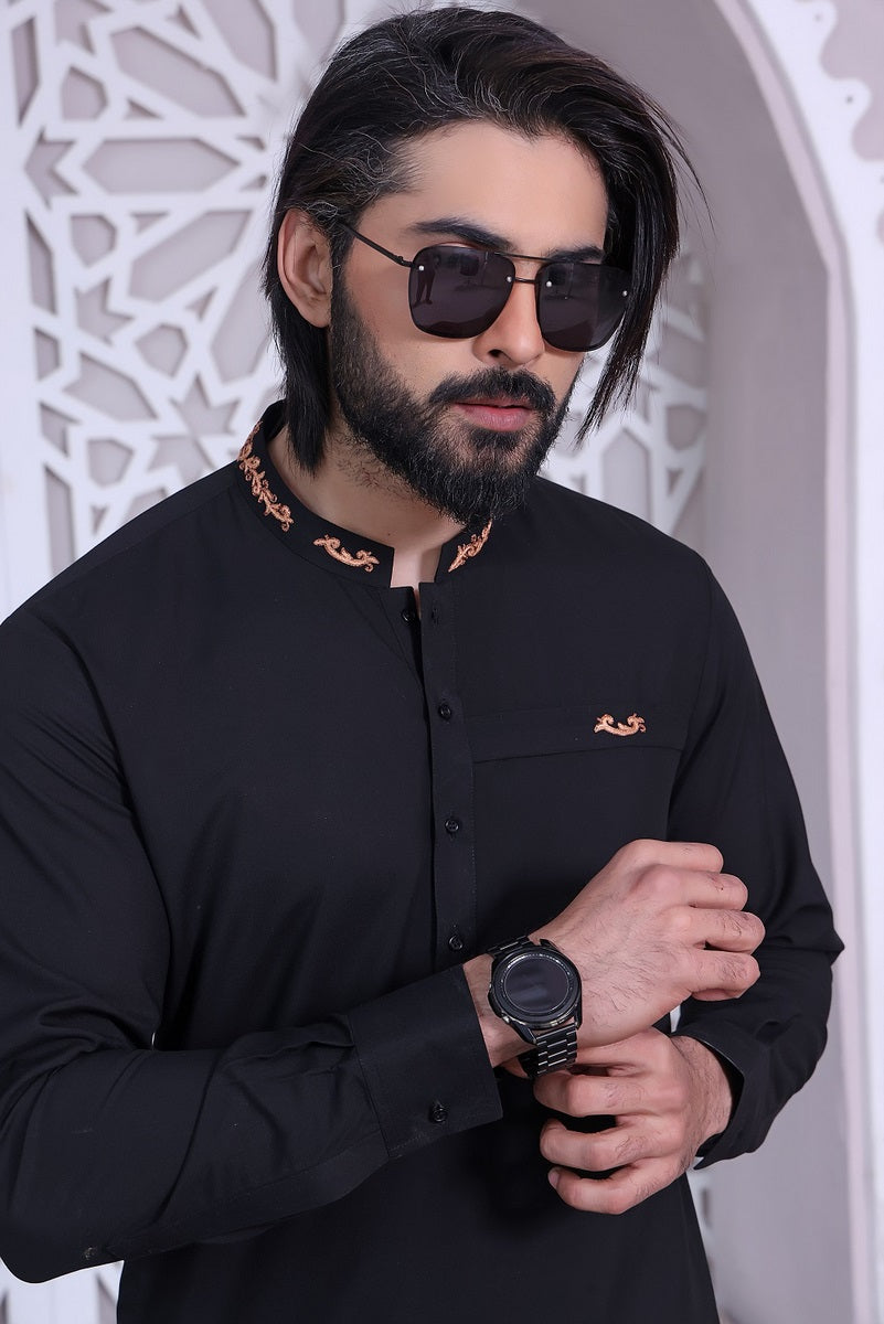Men's Formal Kameez Shalwar with Hand Embroidery on Collar and Front