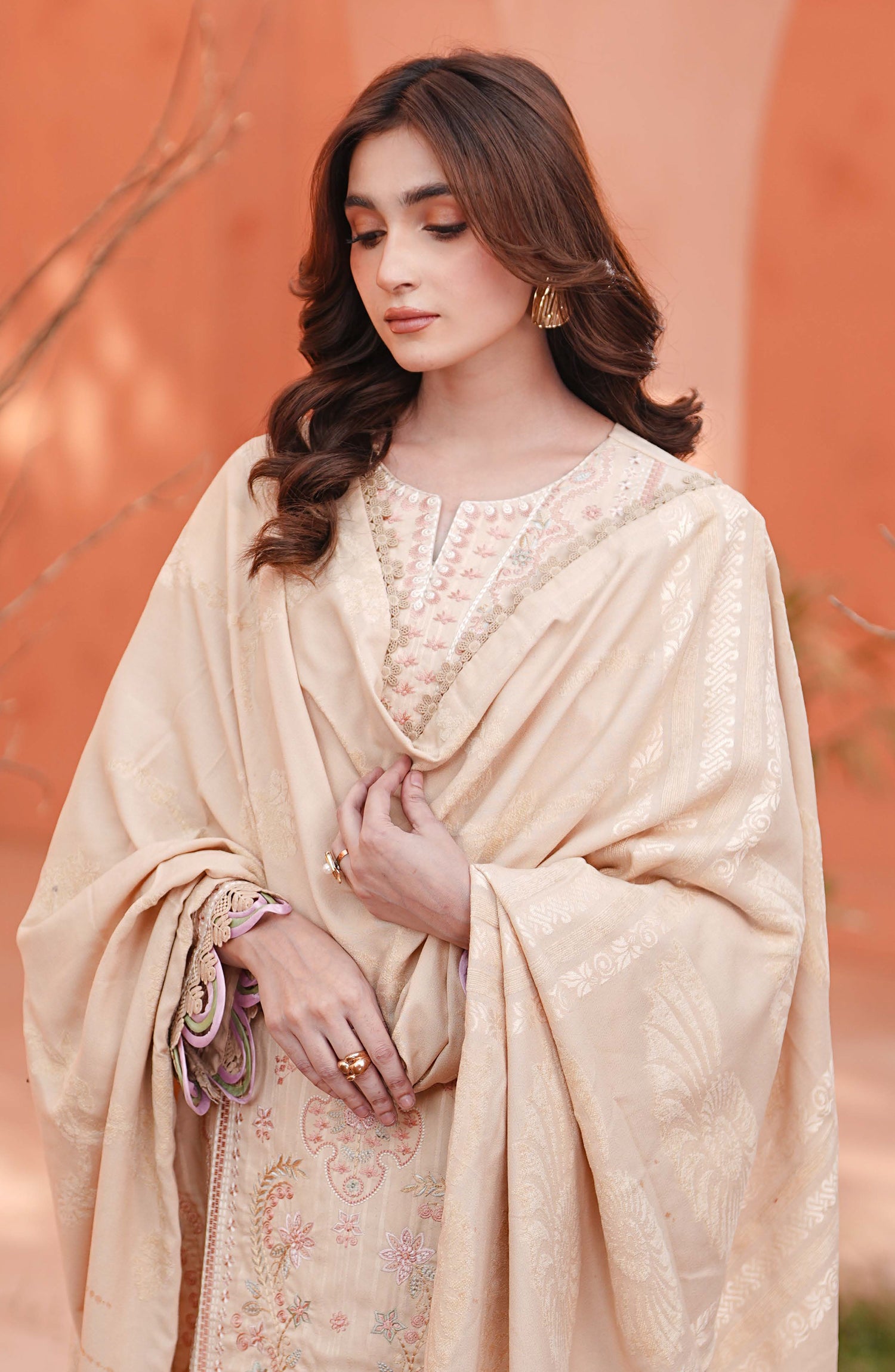 Premium Luxury Embroidered Dhanak Unstitched 3 Piece Suit with Exclusive Velvet Jacquard Dhanak Shawl