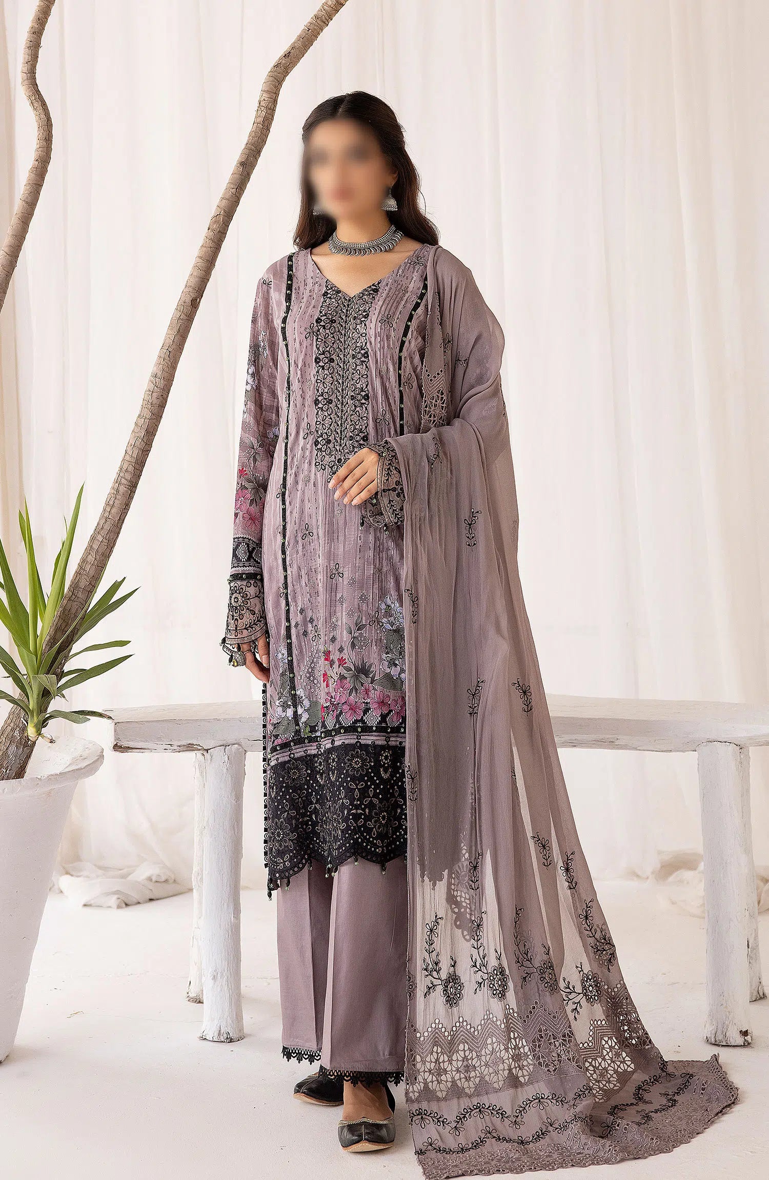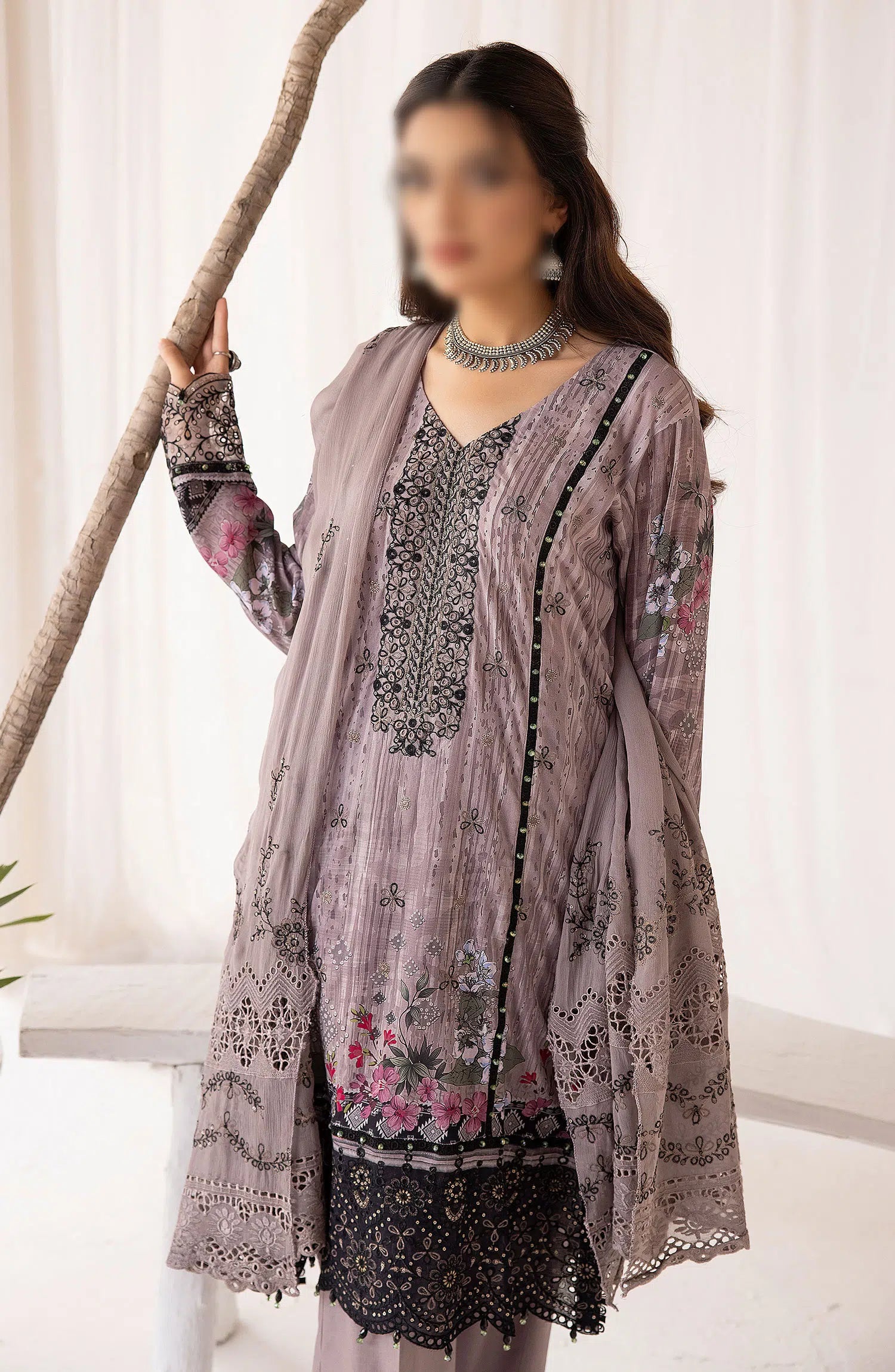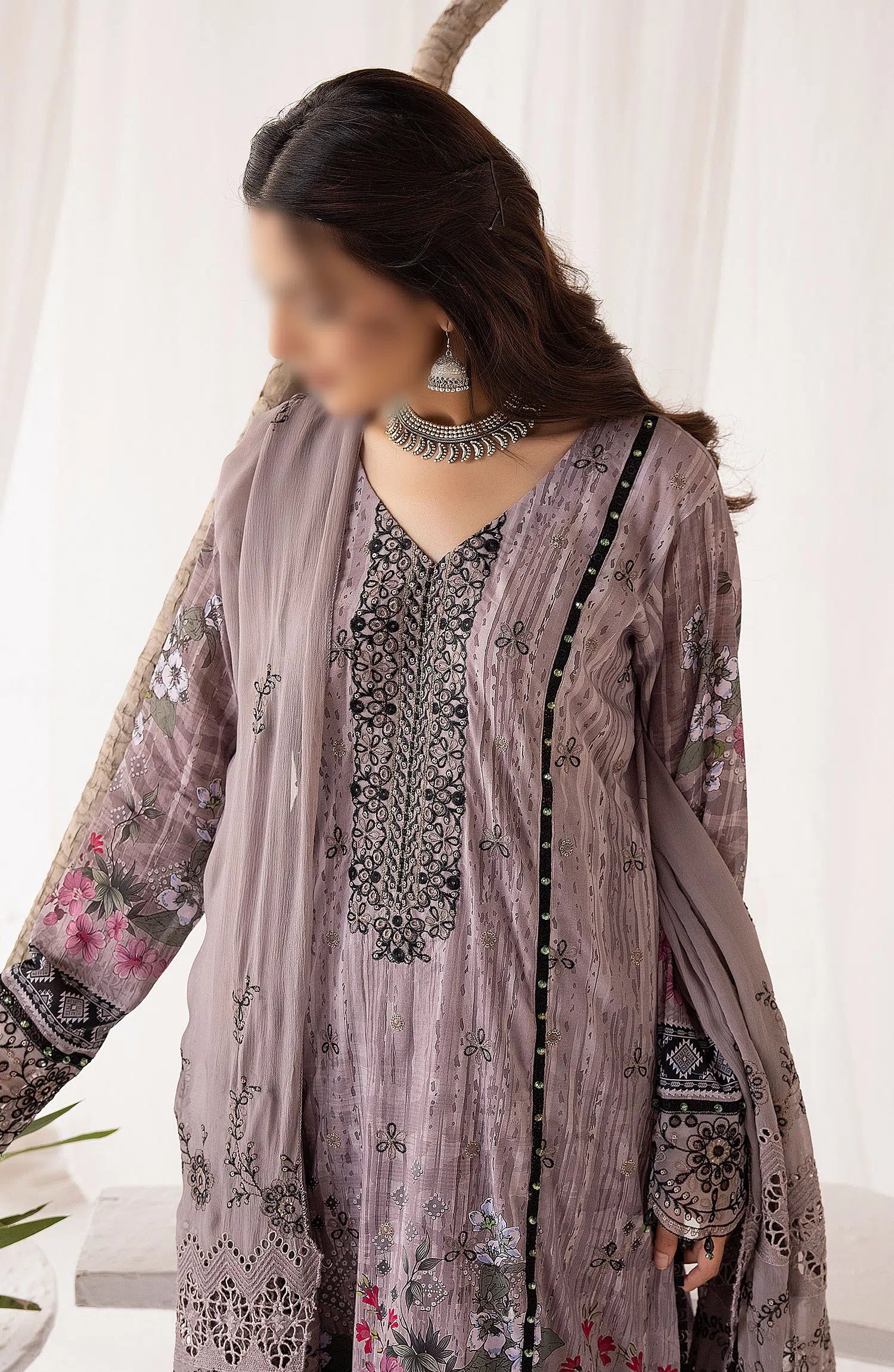 Bunai Digital Printed and Embroidered Swiss Voile Collection has been styled in the image for photography and illustrative purposes.